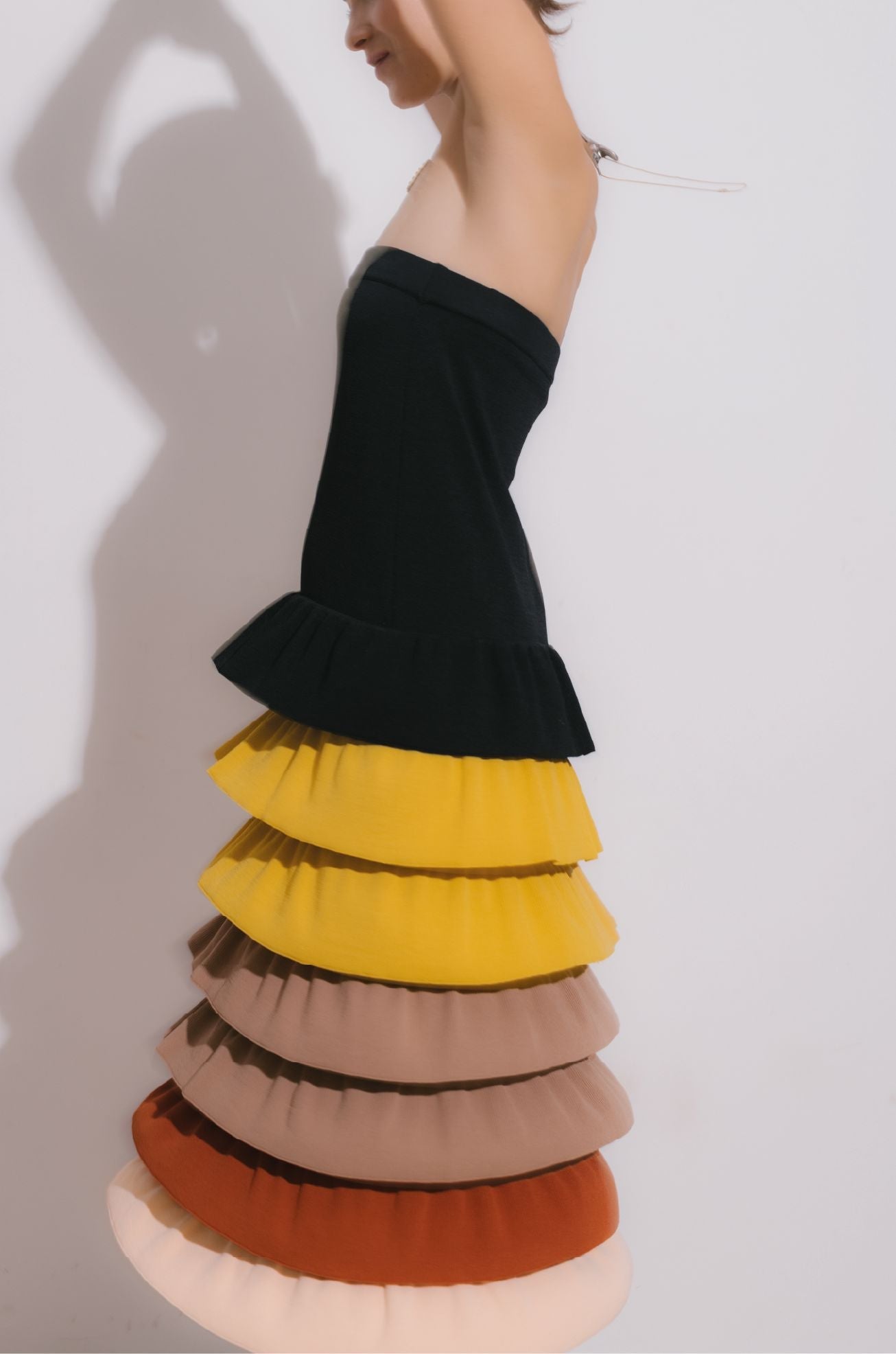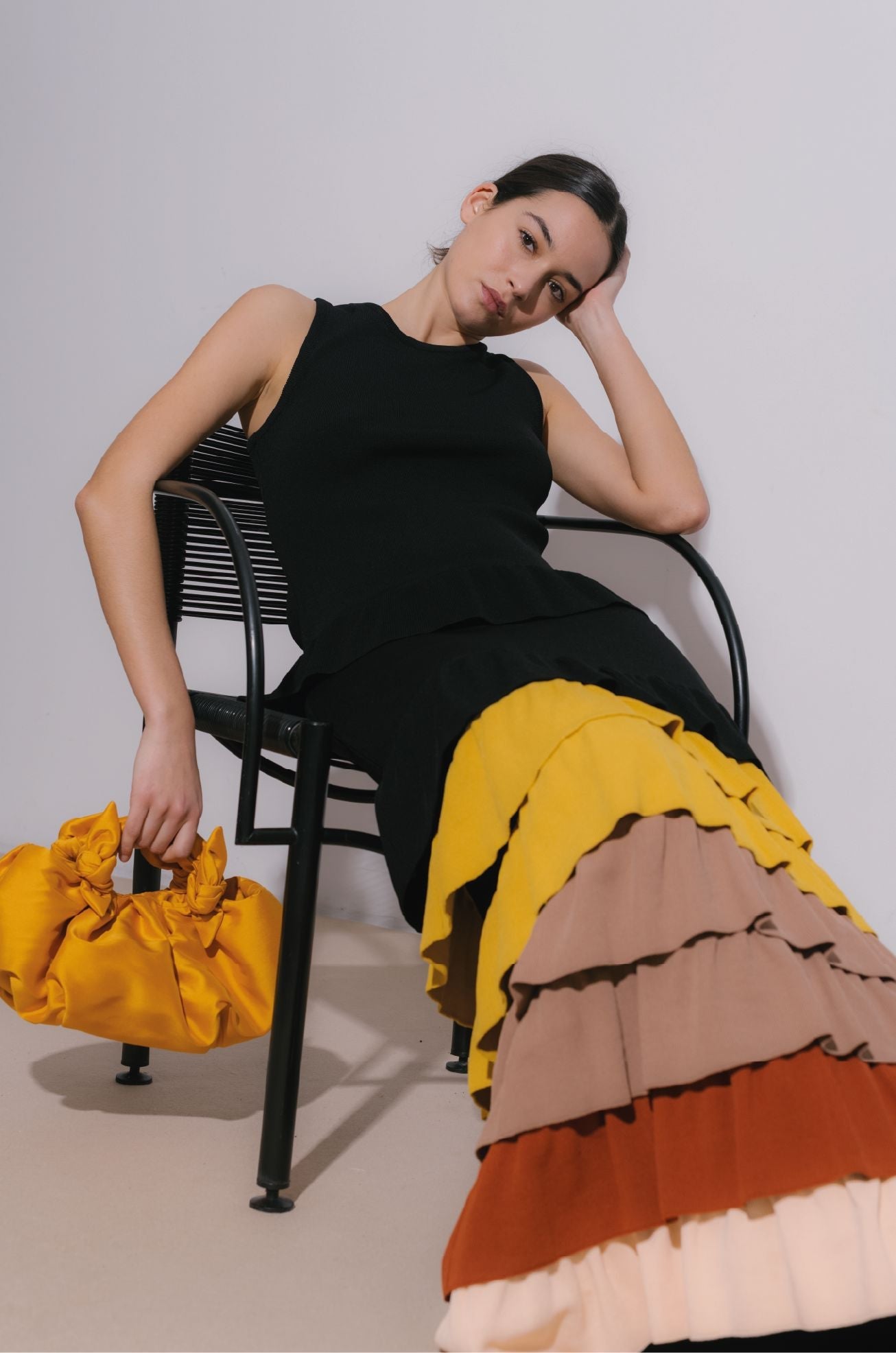 It has a flamenco-inspired cut with tiers of knitted ruffles that create plenty of volume. It can be also styled as a off shoulder dress if you are willing for a more electric look however the garnment has been thought as skirt.