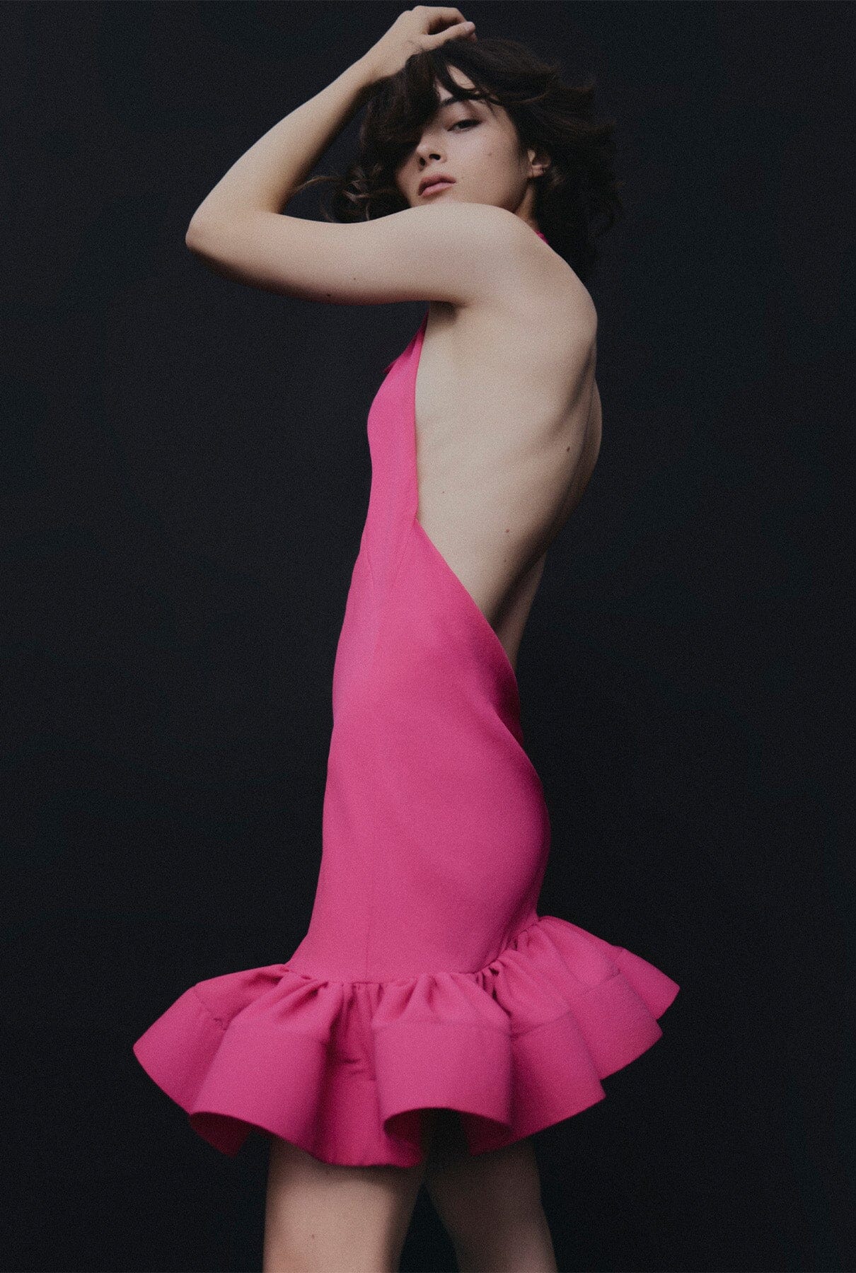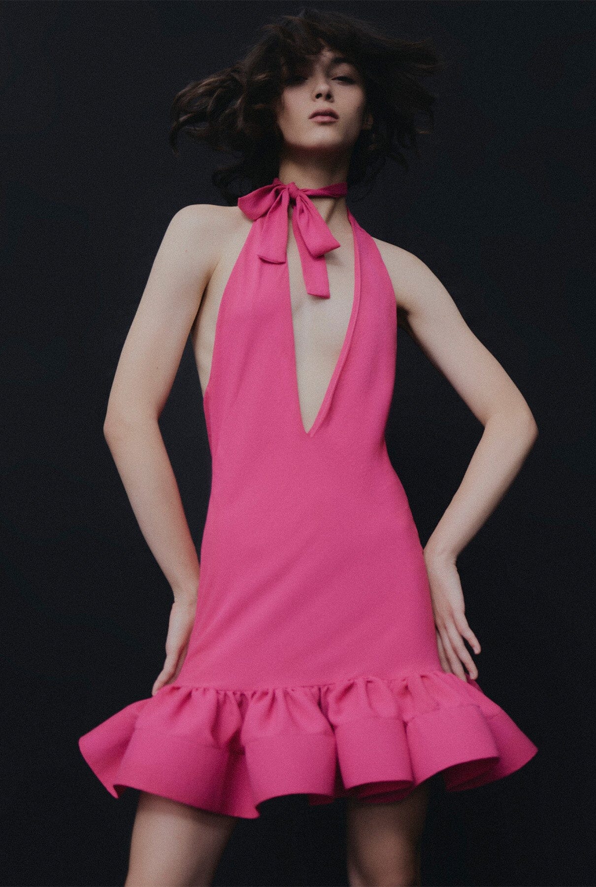 VESTIDO MINI AL BIES CON ESCOTE HALTER Y ESPALDA DESCUBIERTA. EL BOTÓN DE LA FALDA ESTÁ DECORADO CON UN VOLANTE REFORZADO CON CRIN.