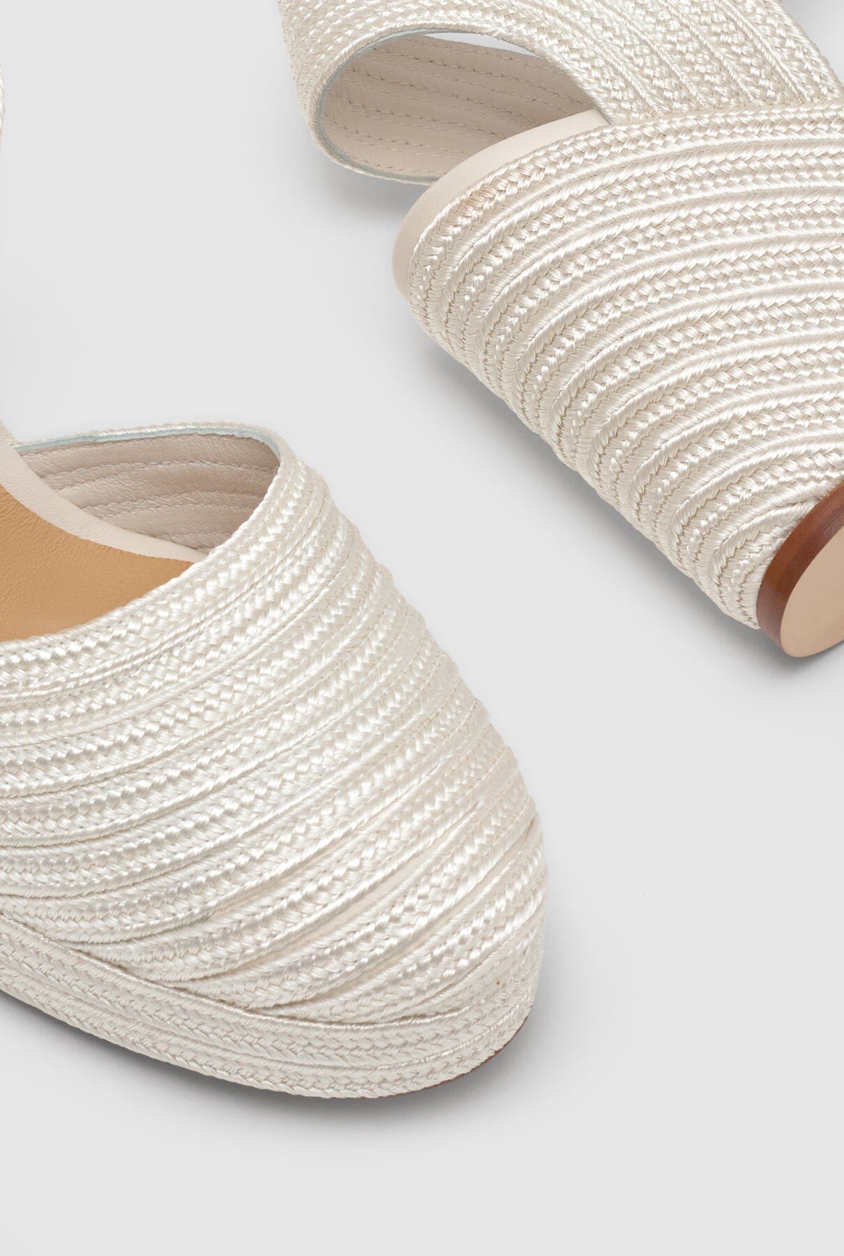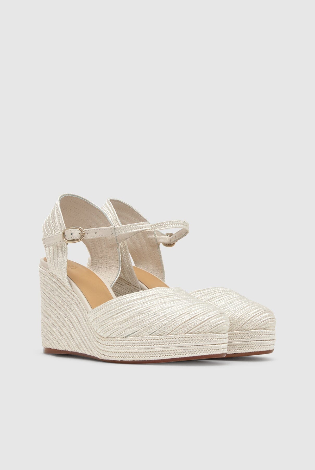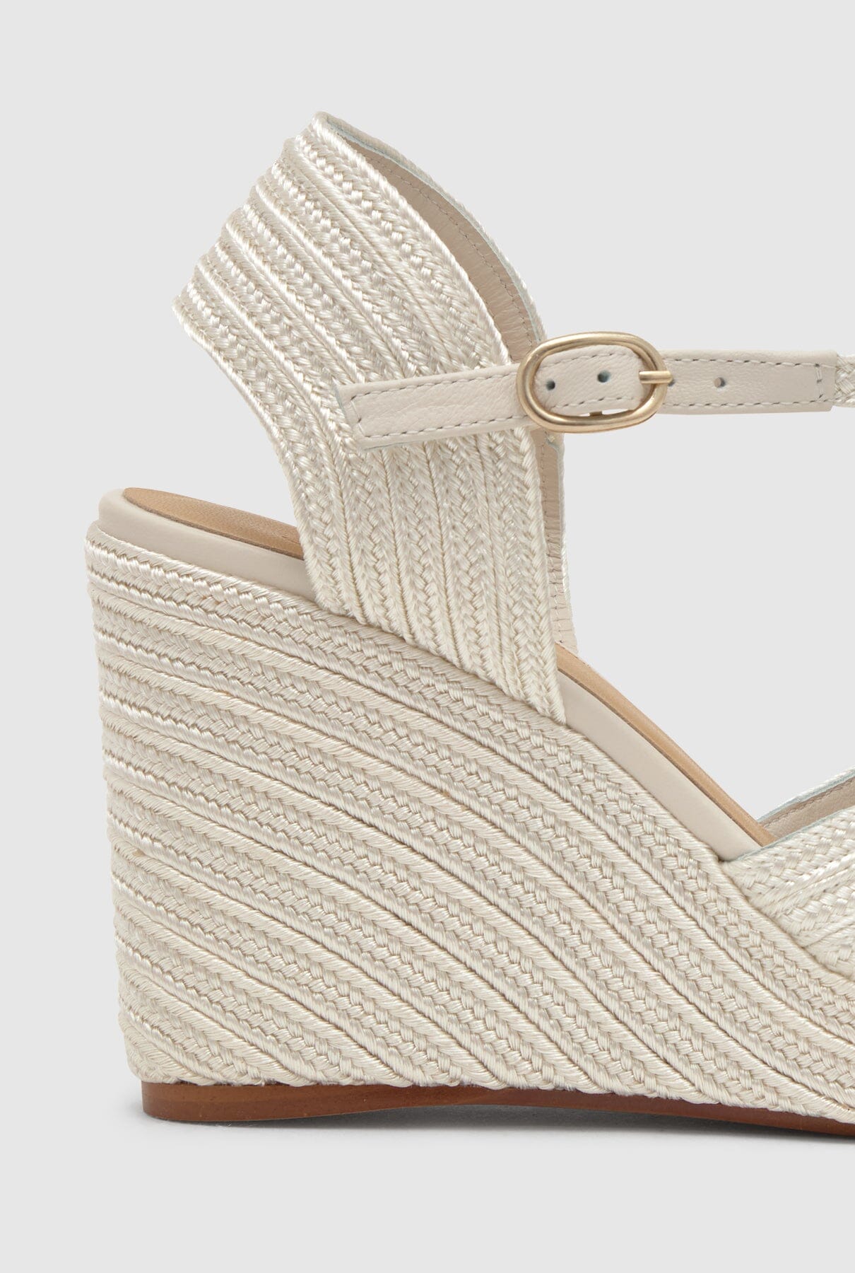 Alpargata Carolyn con tira trenzada metalizada hecha a mano, cierre de hebilla y plantilla acolchada. Tacón de 9 cm a juego con forro.