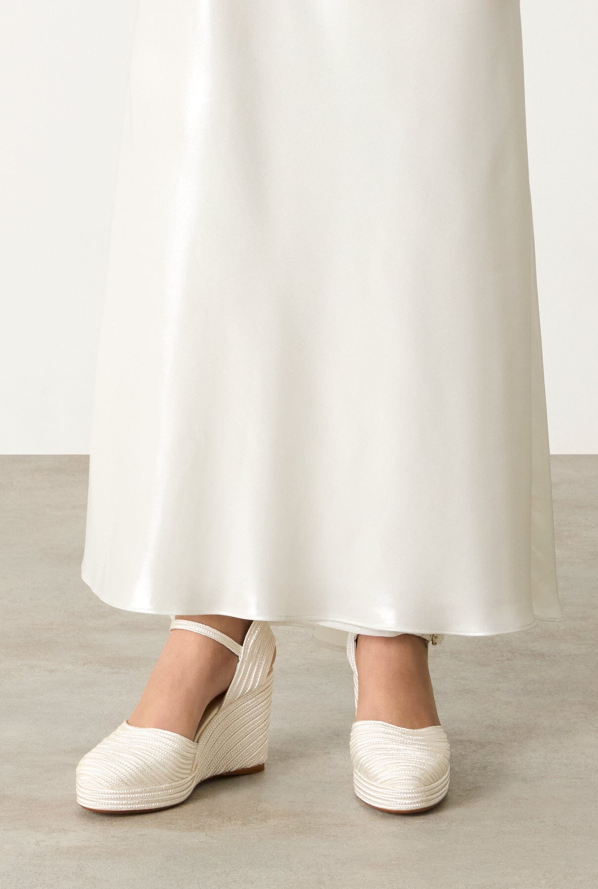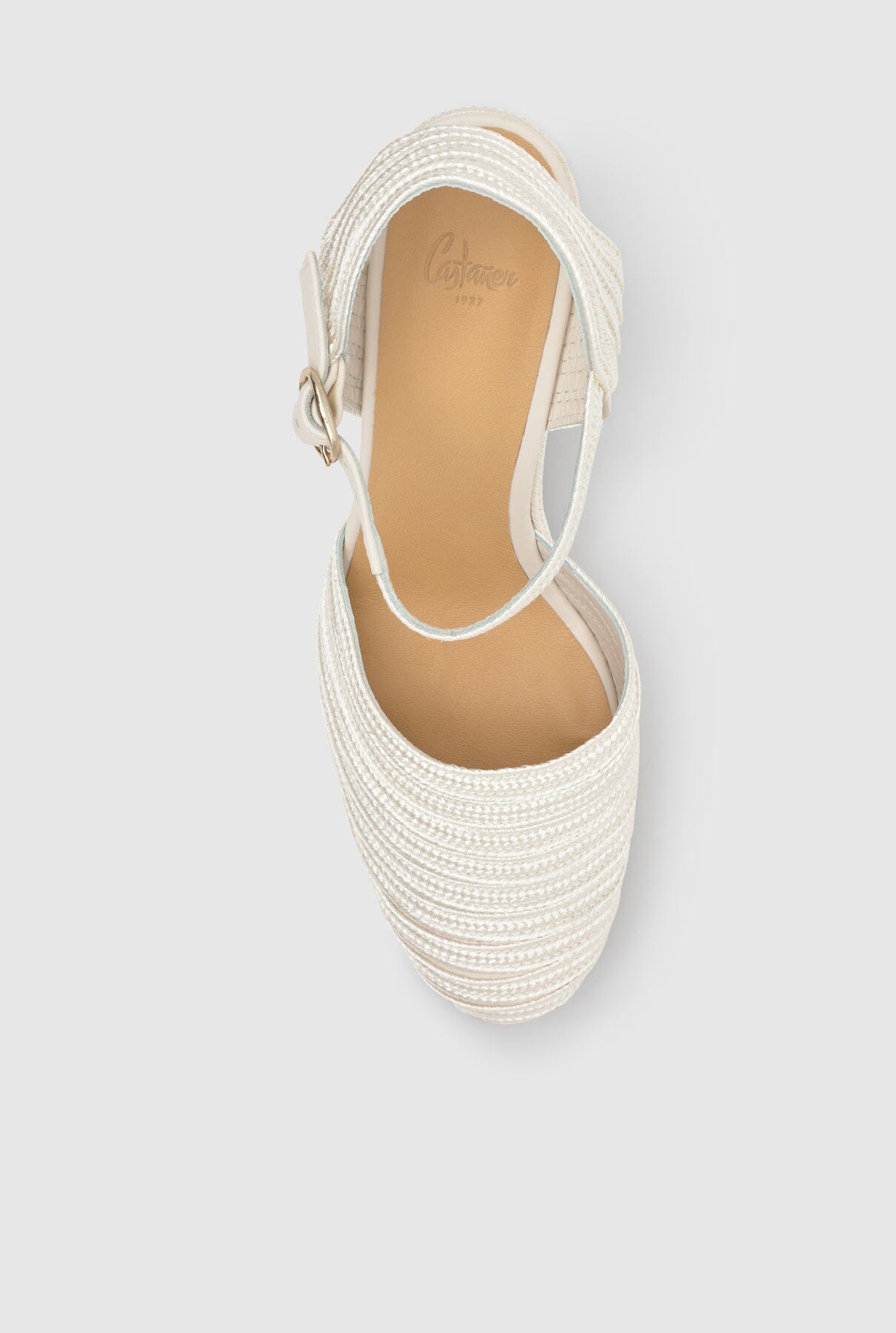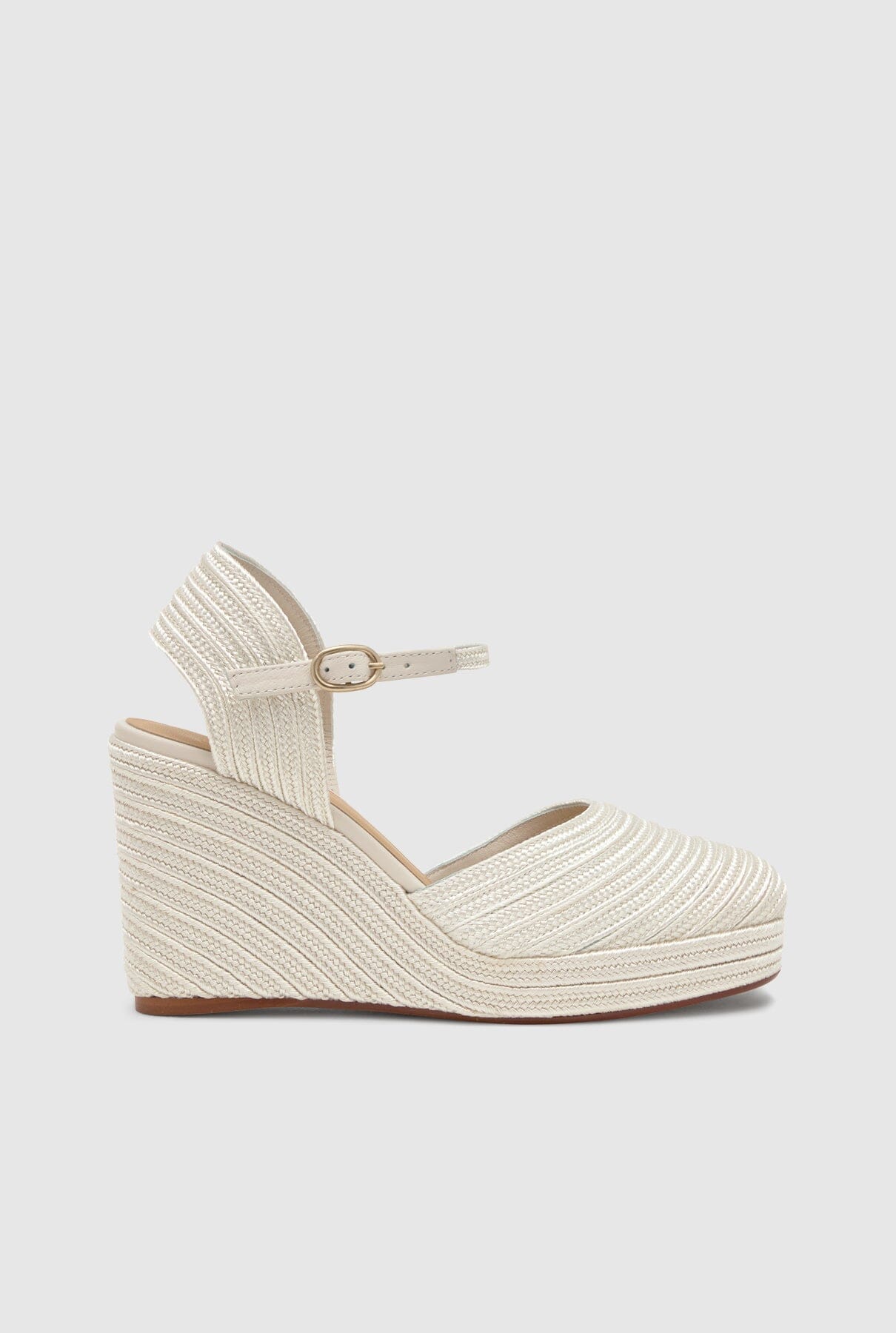 Alpargata Carolyn con tira trenzada metalizada hecha a mano, cierre de hebilla y plantilla acolchada. Tacón de 9 cm a juego con forro.