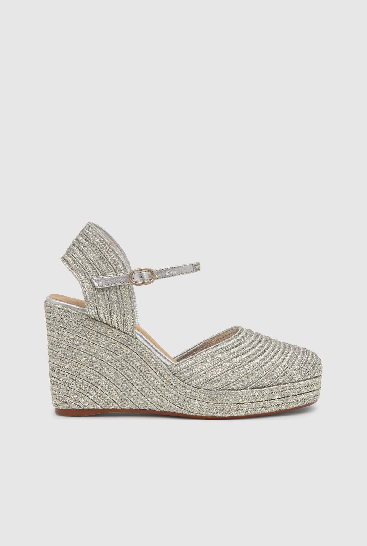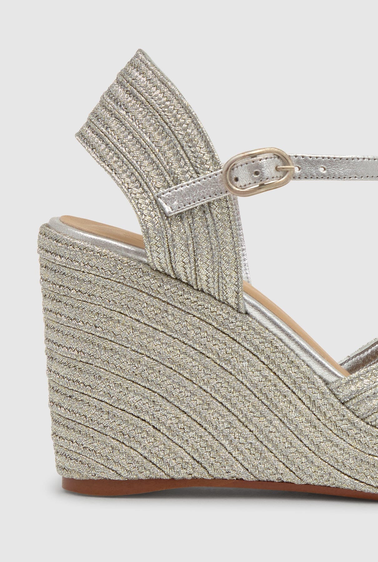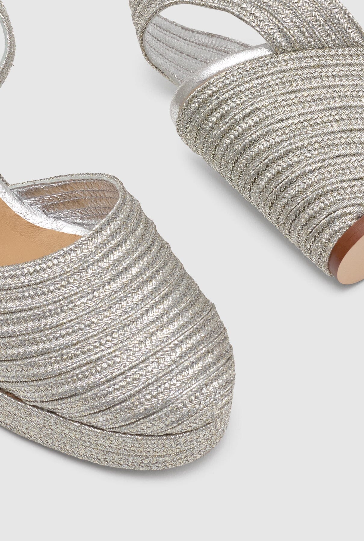 Alpargata Carolyn con tira trenzada metalizada hecha a mano, cierre de hebilla y plantilla acolchada. Tacón de 9 cm a juego con forro.