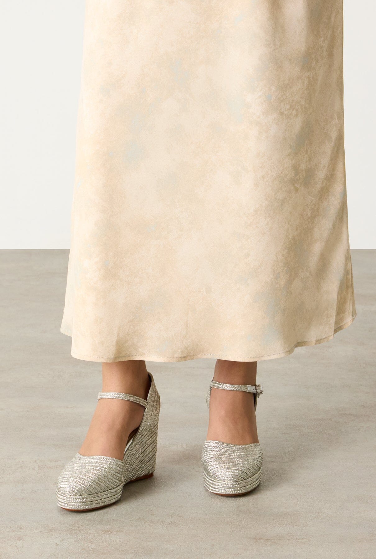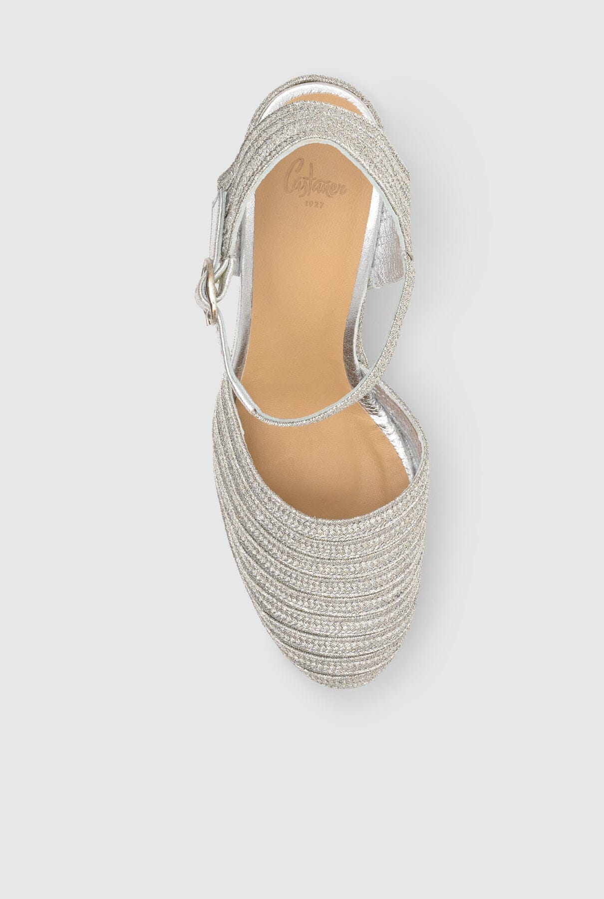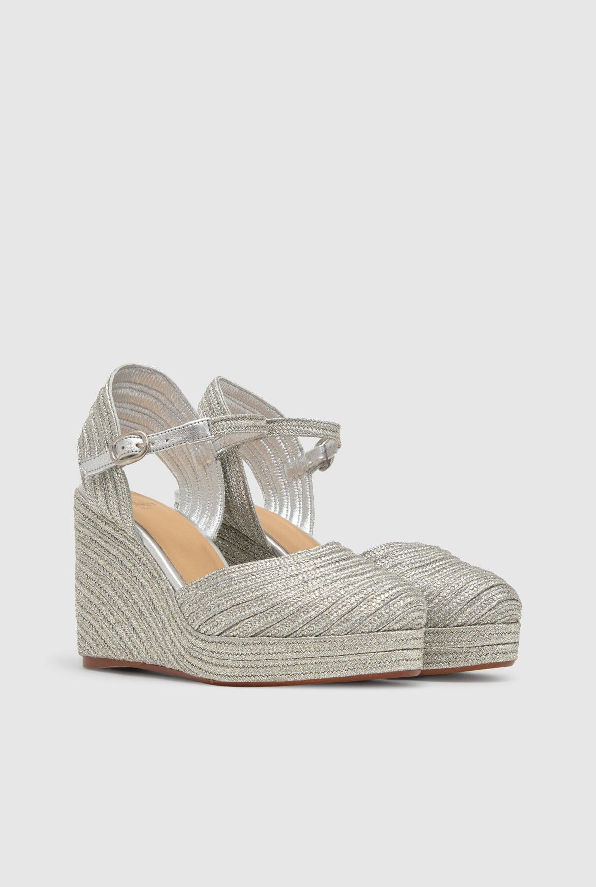 Alpargata Carolyn con tira trenzada metalizada hecha a mano, cierre de hebilla y plantilla acolchada. Tacón de 9 cm a juego con forro.