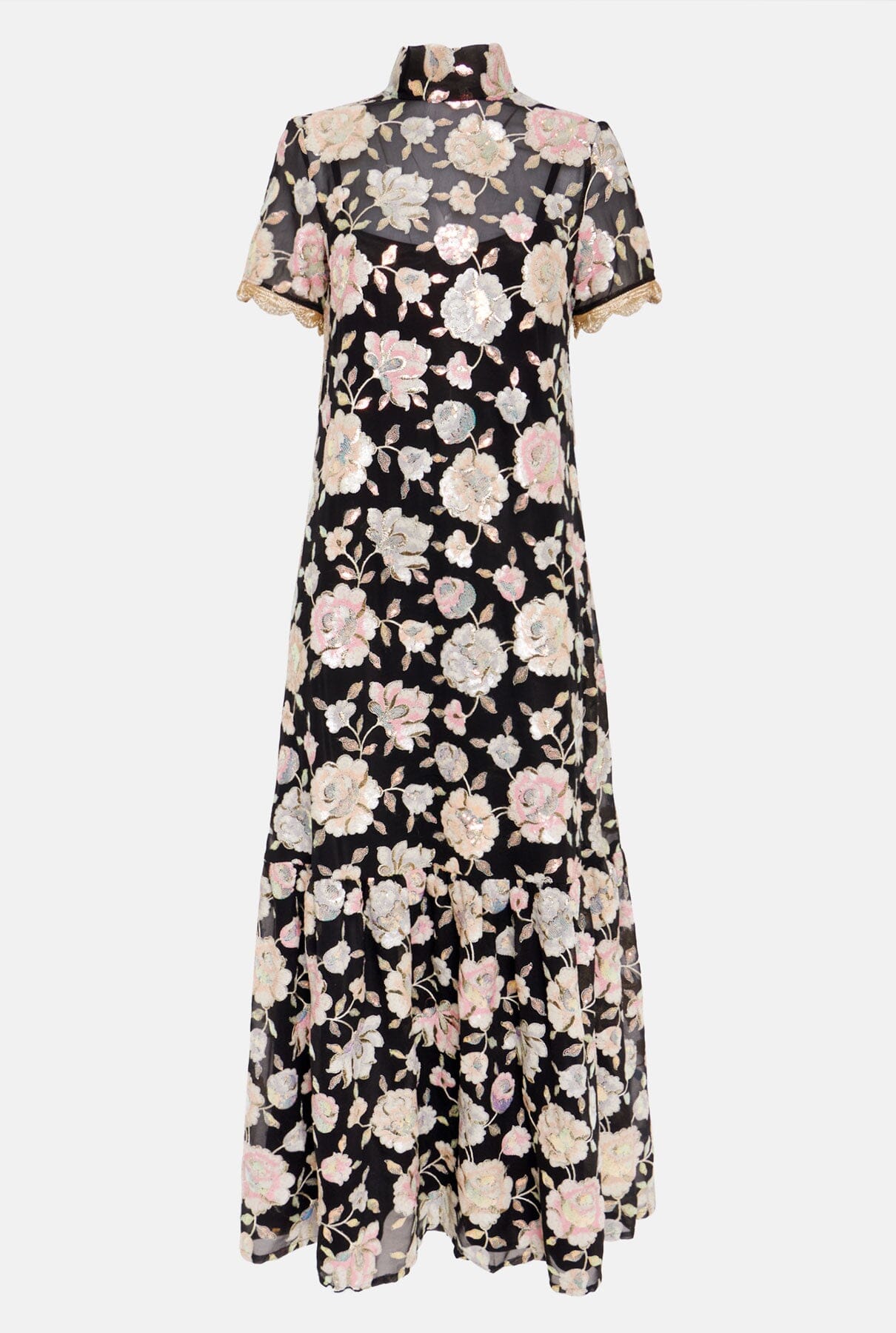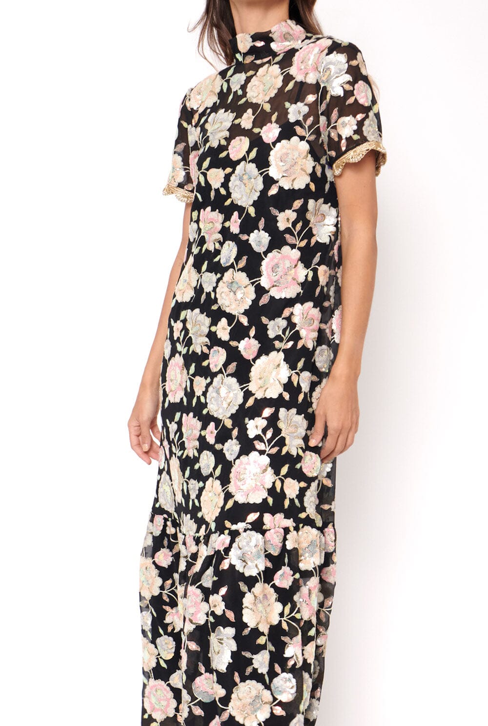 El vestido CELIA está confeccionado en georgette bordado con estampado floral y aplicaciones de lentejuelas.