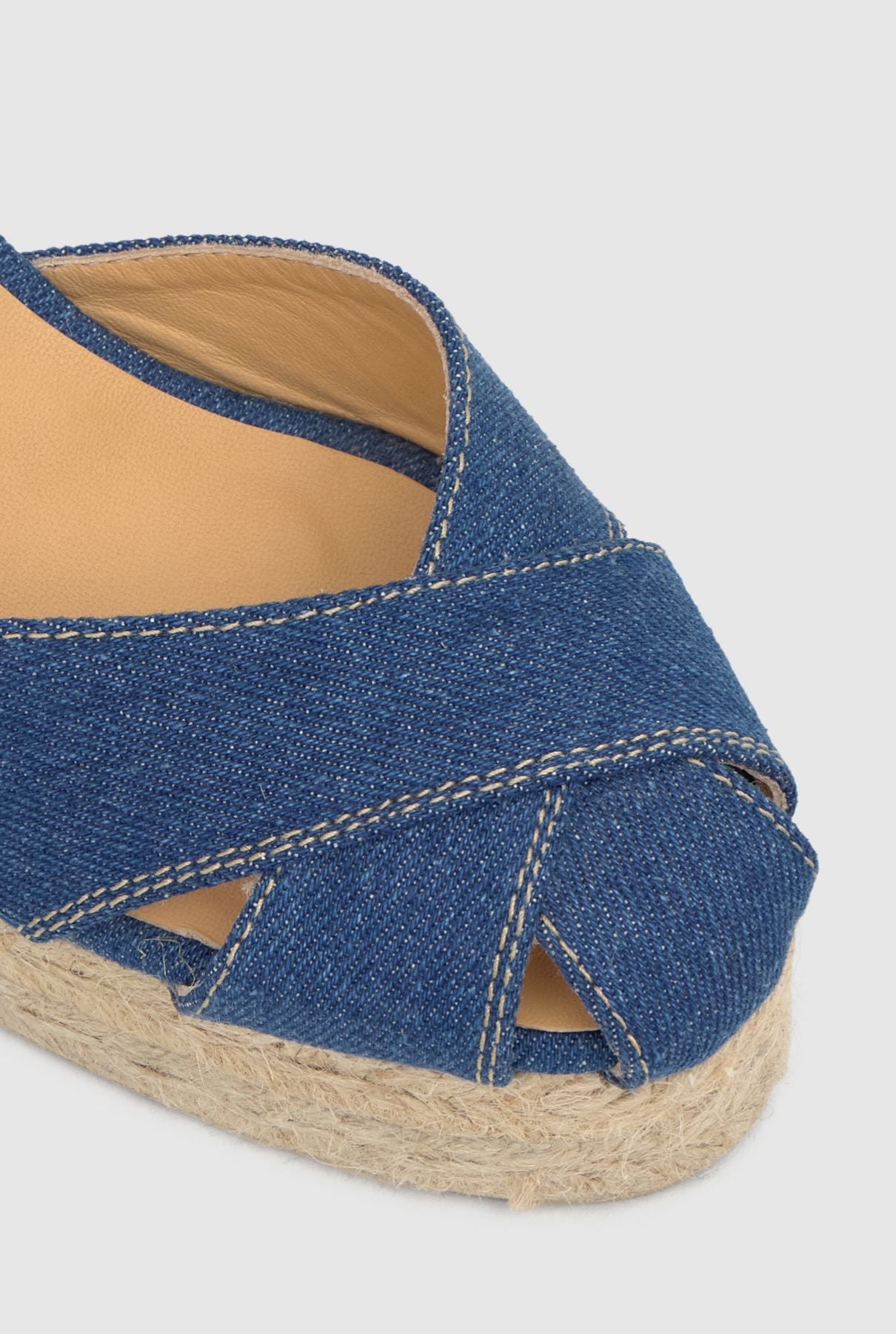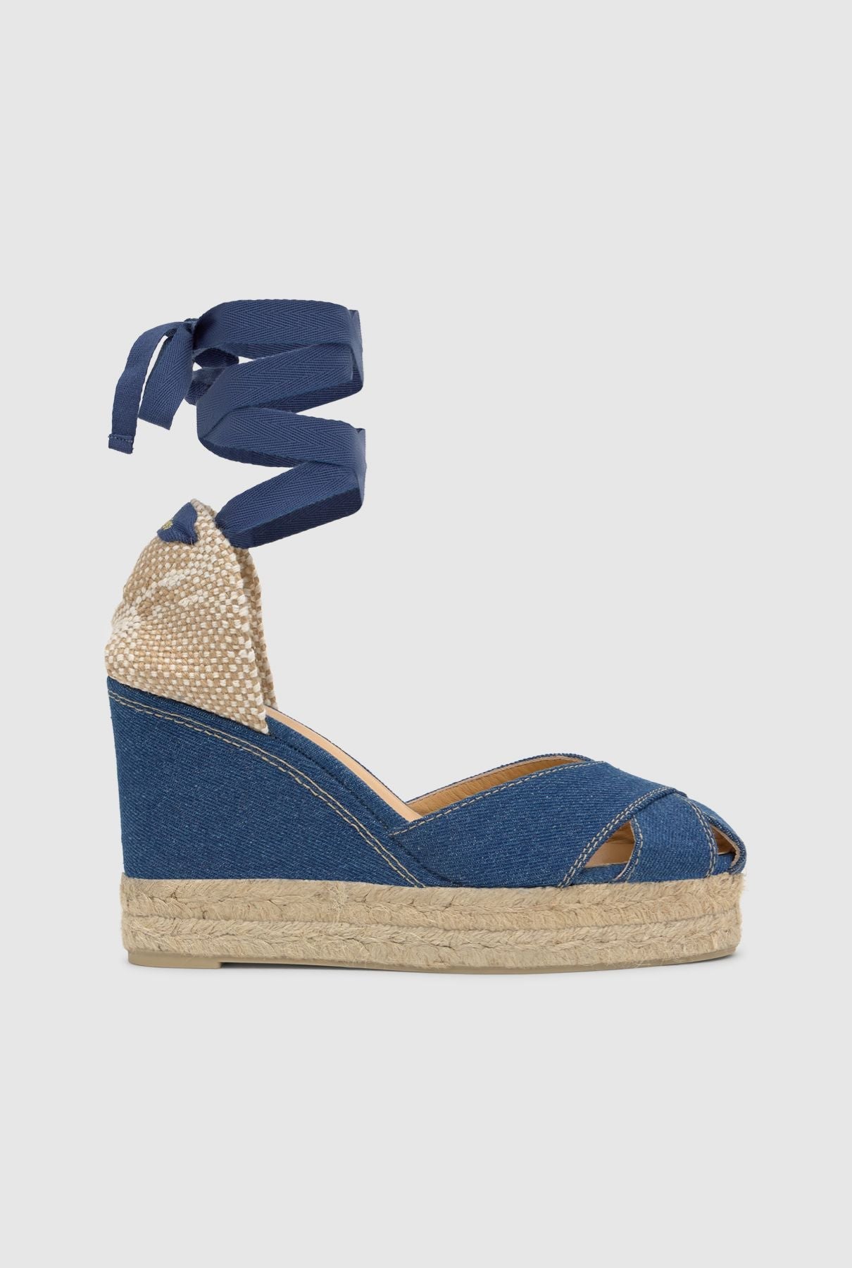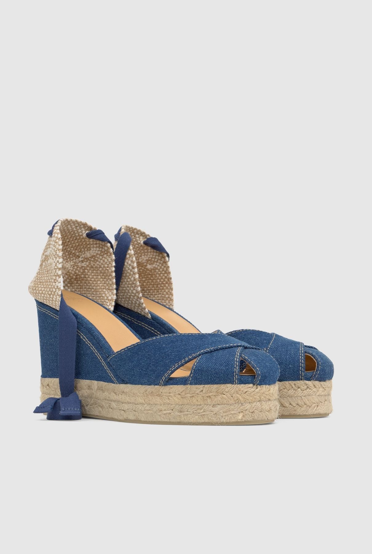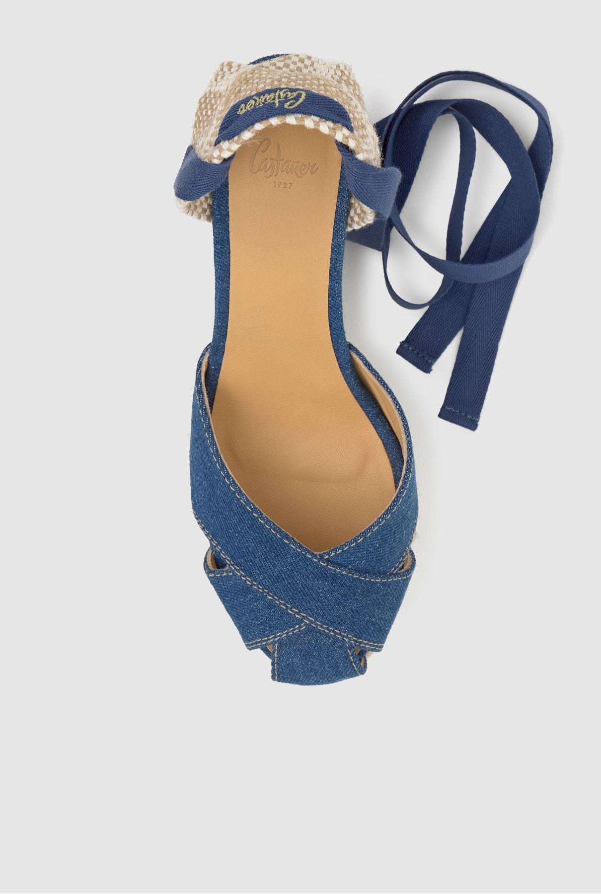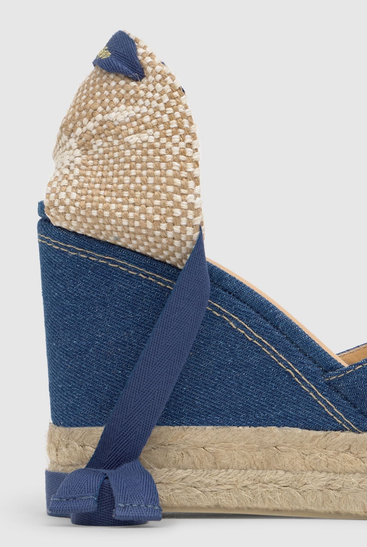 Alpargata Chabeli en denim con cierre de cinta, puntera semiabierta, plantilla acolchada y cuña de 11 cm de yute forrada a juego con doble plataforma.