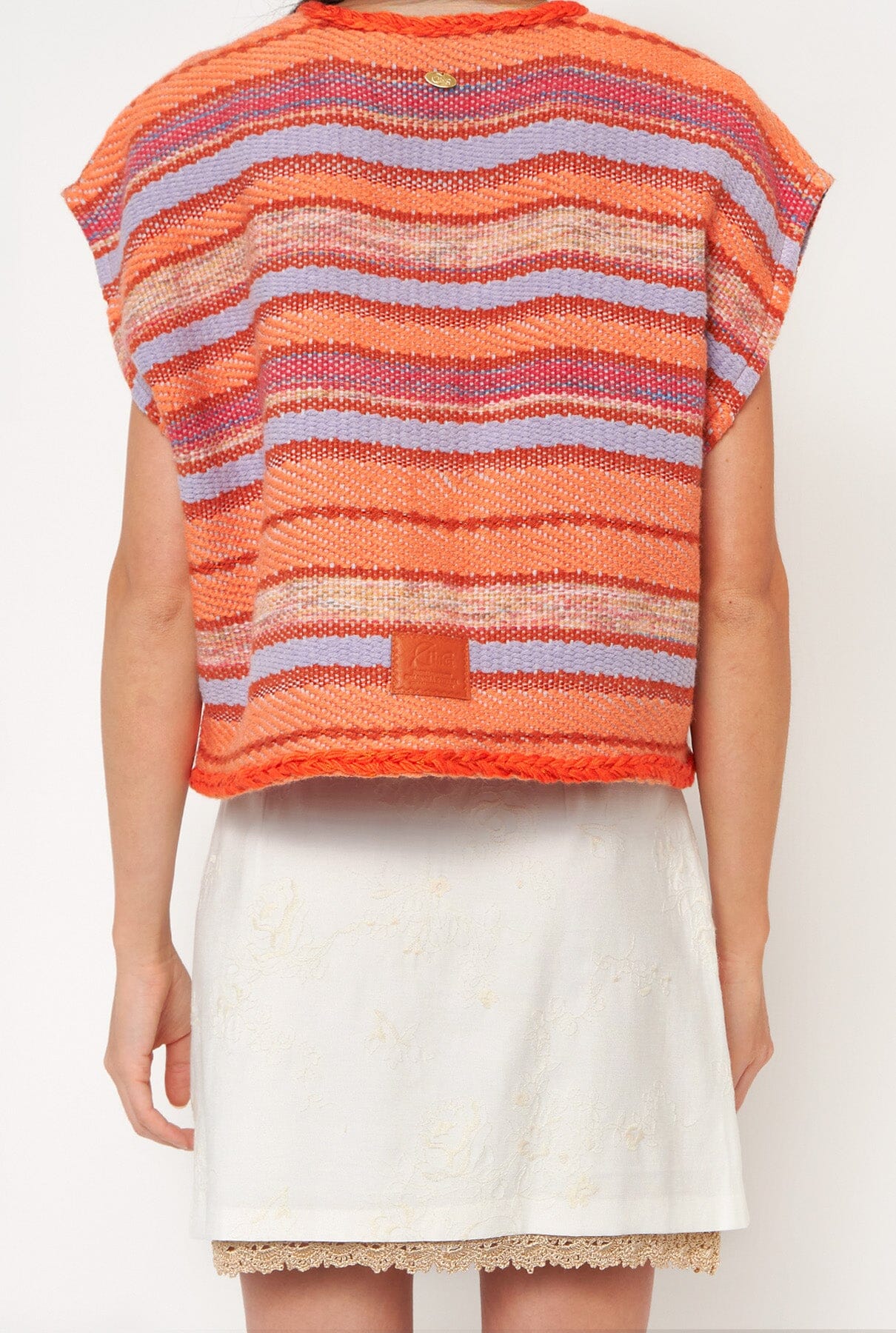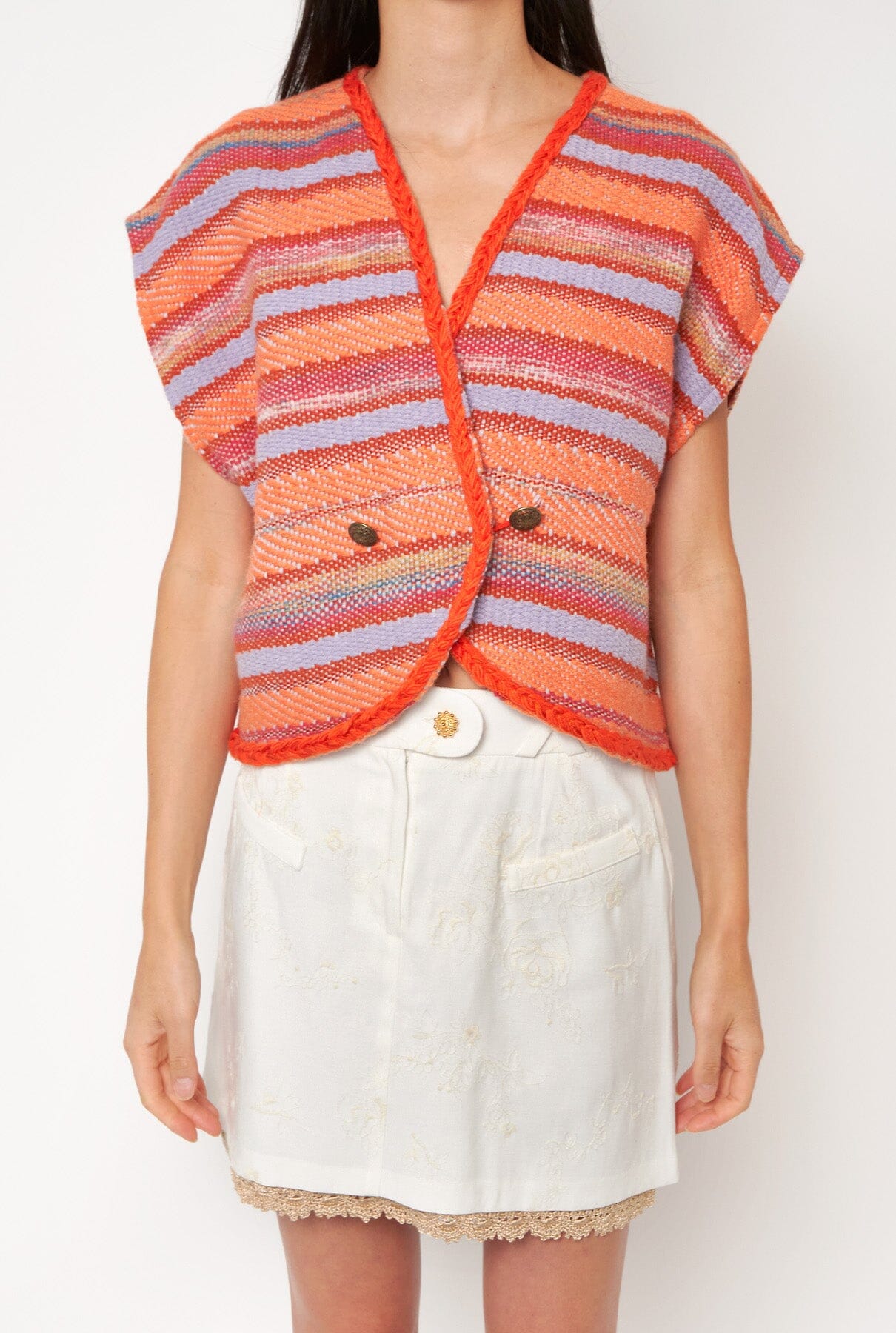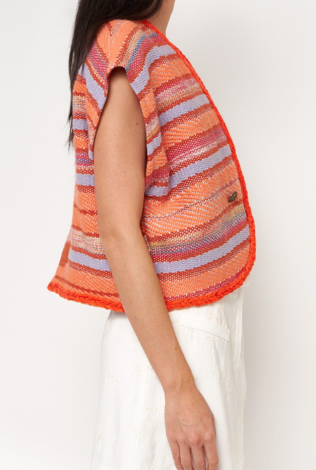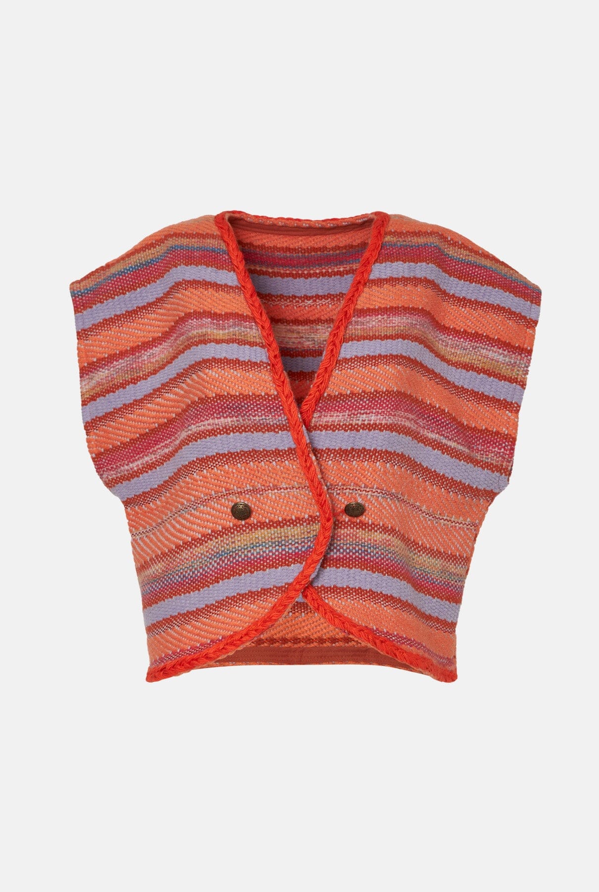 Chaleco oversize tejido en telar de pedal horizontal por artesanos tradicionales de Boyacá, Colombia, y confeccionado en A Coruña. El patrón tejido lineal es un diseño exclusivo creado conjuntamente con los artesanos. El borde trenzado en hilo de crochet también está hecho a mano y los botones de latón estilo tallado añaden un toque de elegancia.