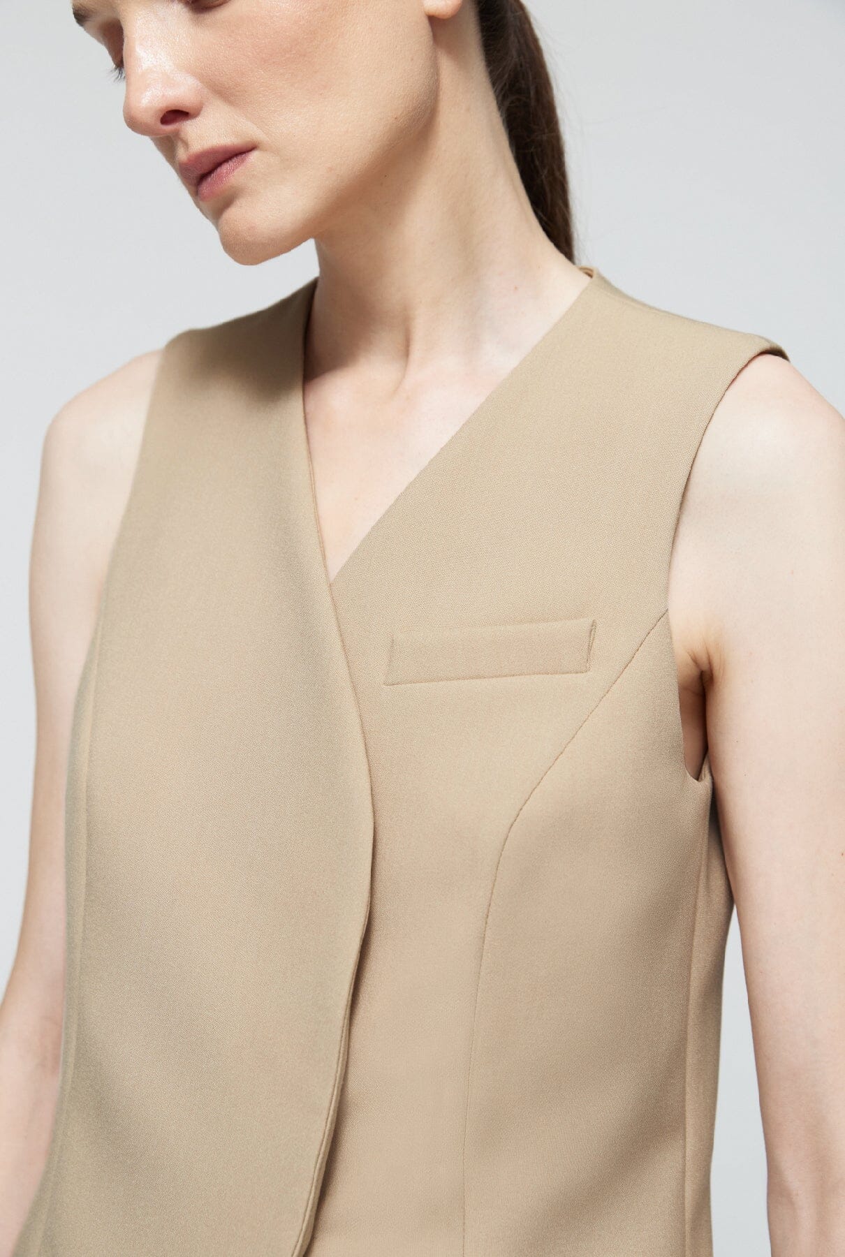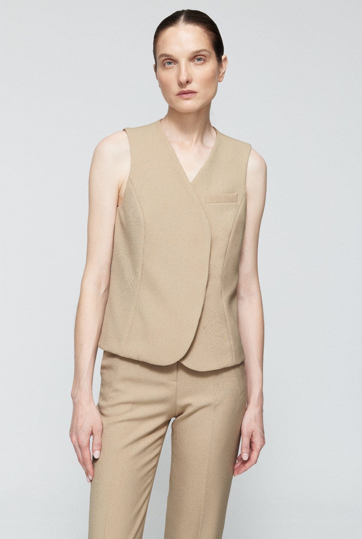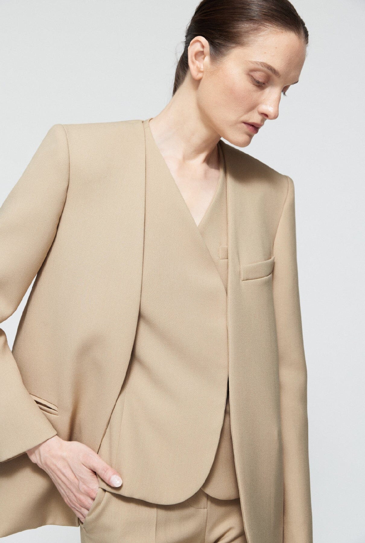 Siguiendo la línea etérea y purista de la colección, Bleis Madrid presenta por primera vez un chaleco ajustado a la cintura, con corte cruzado y cierre invisible. La precisión en su confección se muestra en cada detalle, como el bolsillo ribeteado o sus impecables costuras.