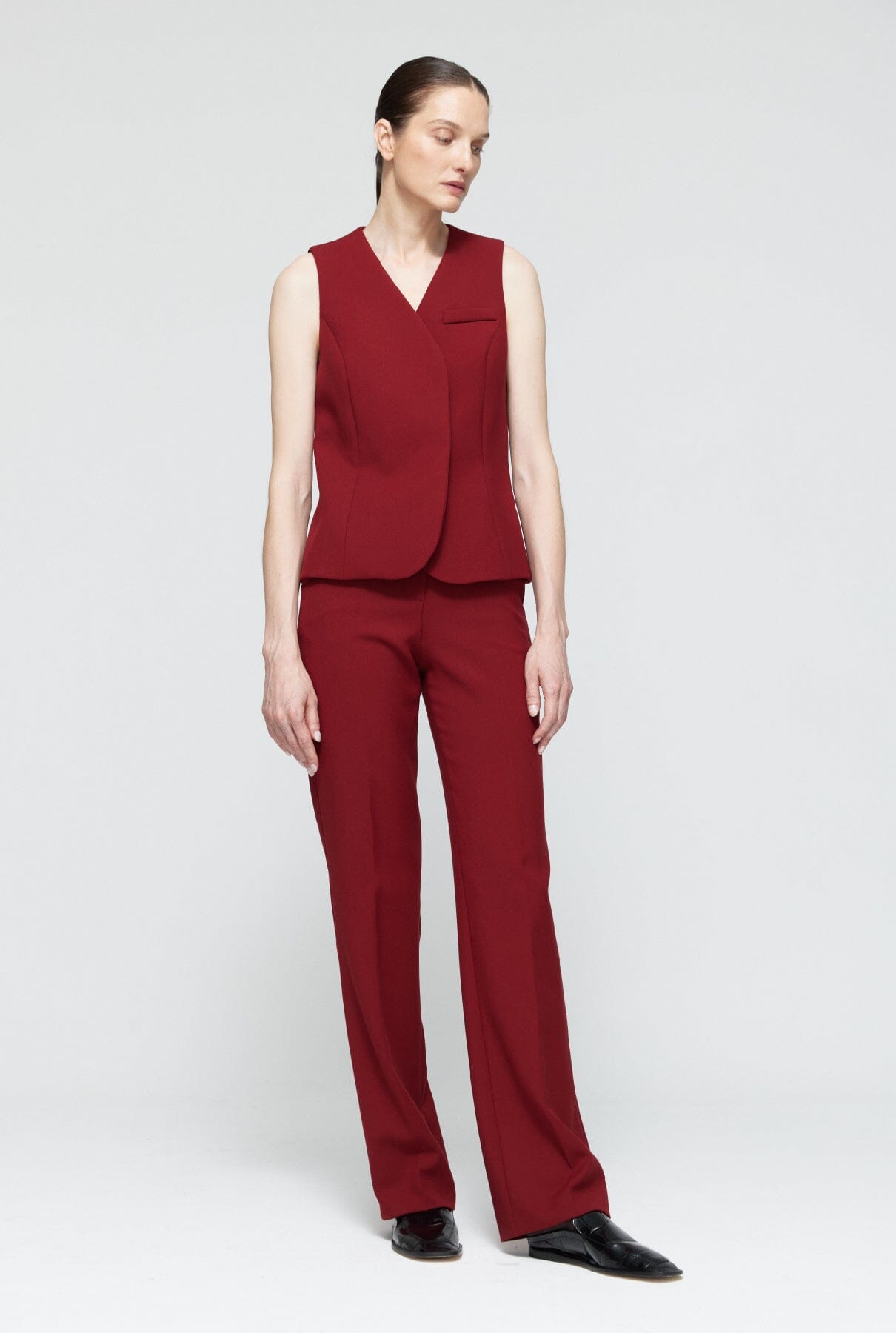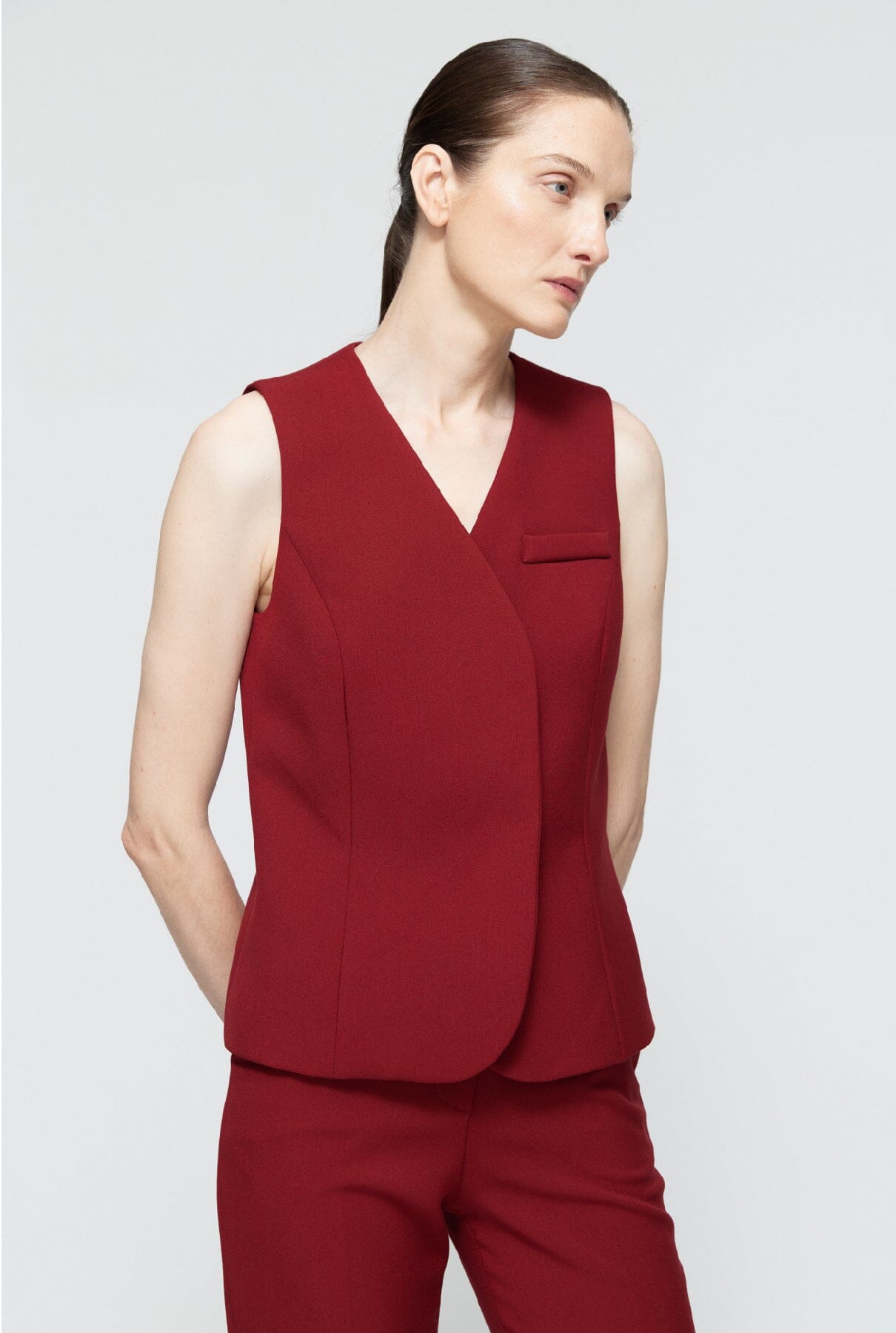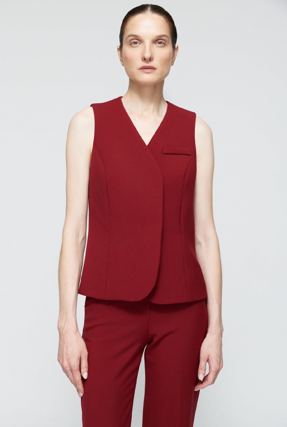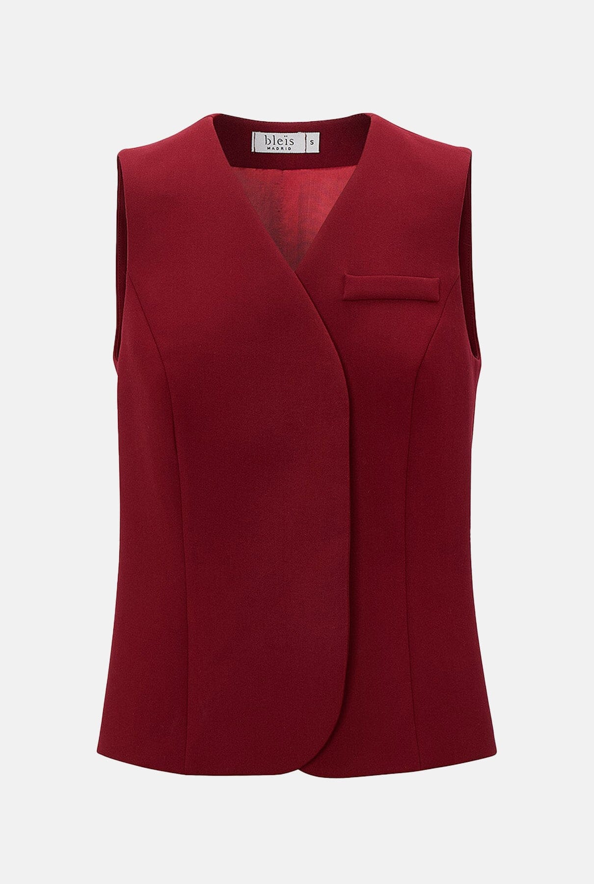 Chaleco entallado de lana burdeos. Esta pieza se reinterpreta en una versión más contemporánea con corte cruzado y cierre con botones invisibles para un acabado impecable.