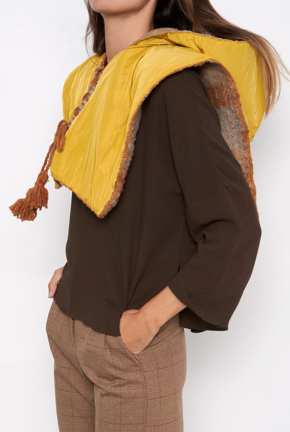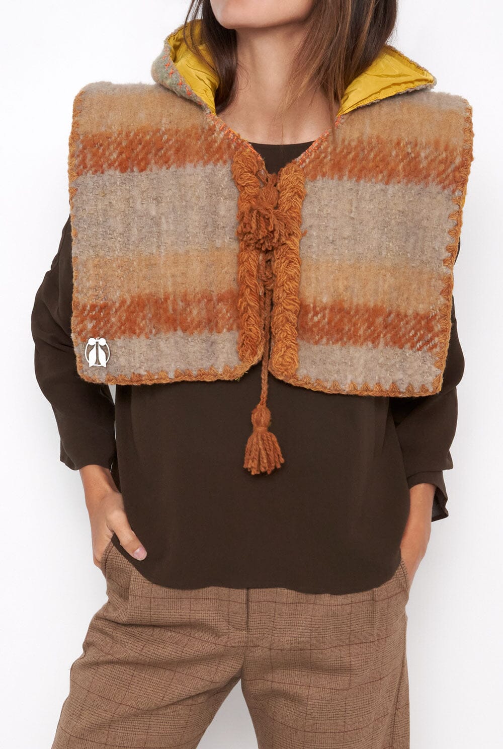 Chaleco confeccionado en lana virgen tejida en telar de lanzadera horizontal y lana teñida en técnicas artesanales con 100% frutos de la montaña. Este chaleco está forrado con un tejido 100% viscosa, mayoritariamente impermeable apto para la temporada de lluvias.