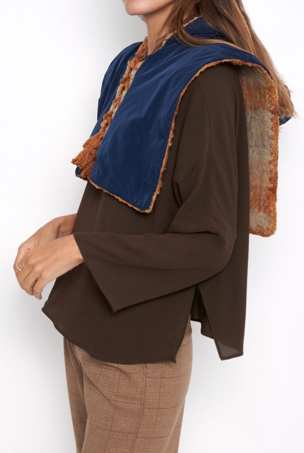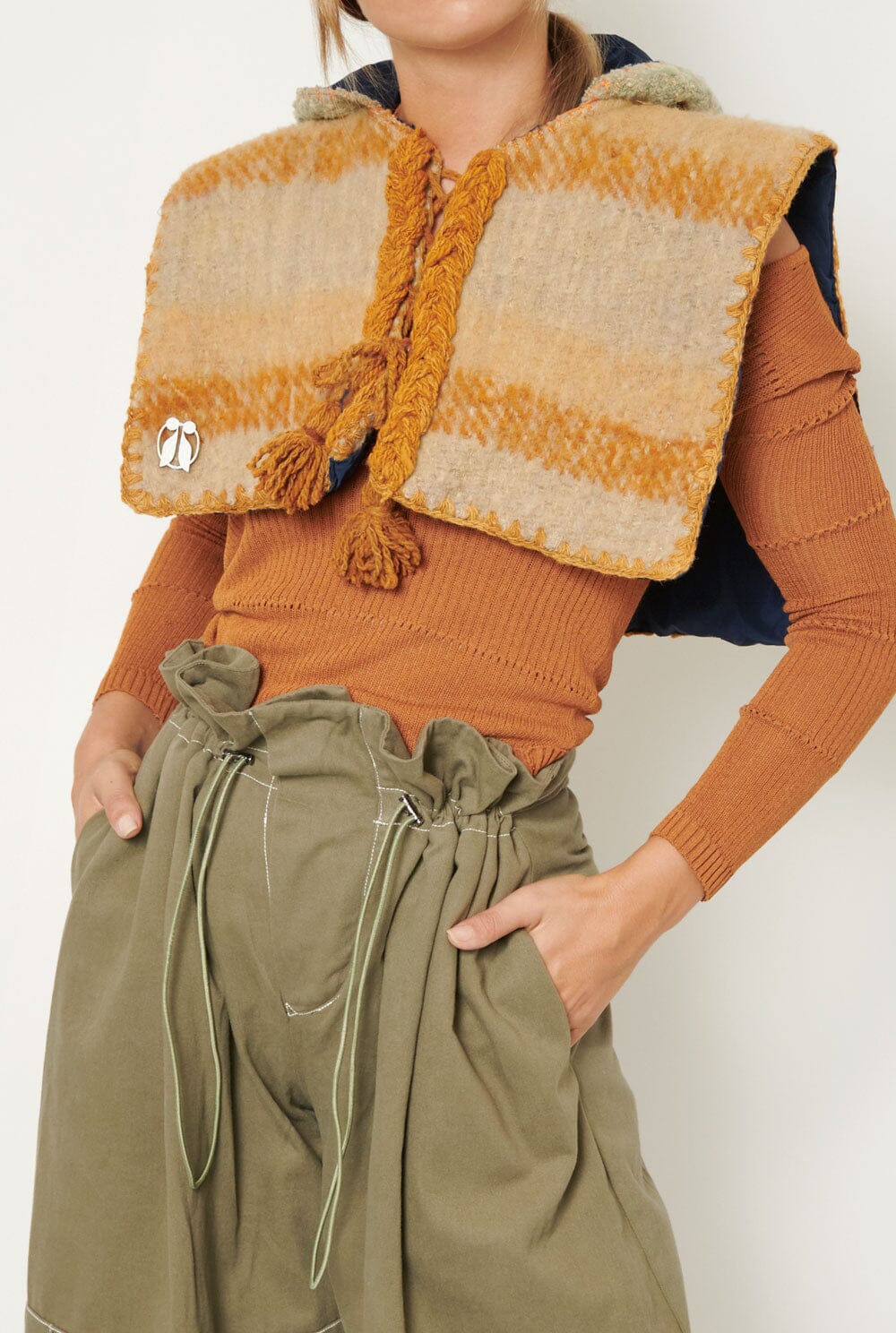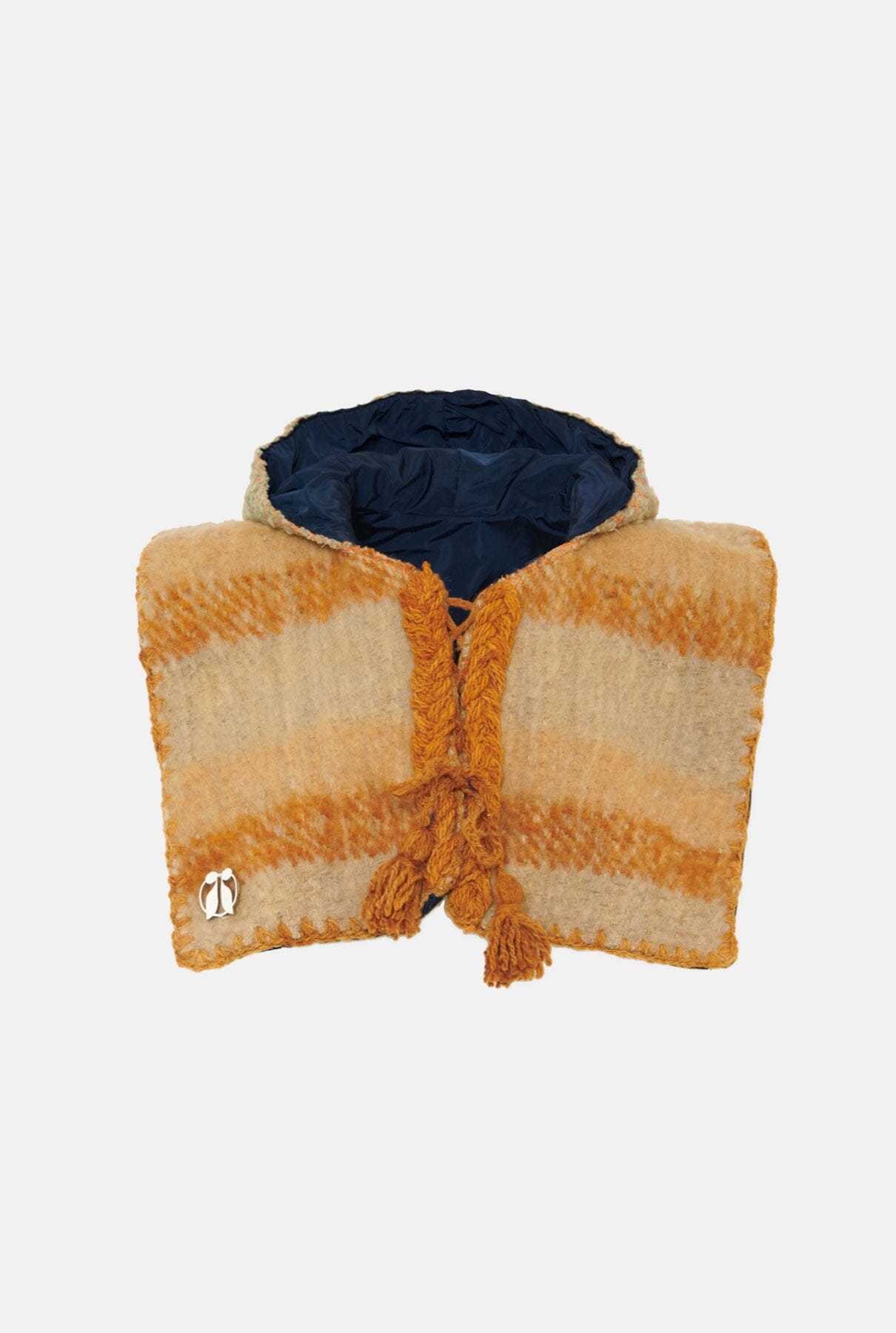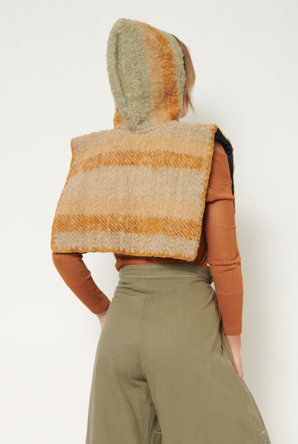 Chaleco confeccionado en lana virgen tejida en telar de lanzadera horizontal y lana teñida en técnicas artesanales con 100% frutos de la montaña. Este chaleco está forrado con un tejido 100% viscosa, mayoritariamente impermeable apto para la temporada de lluvias.