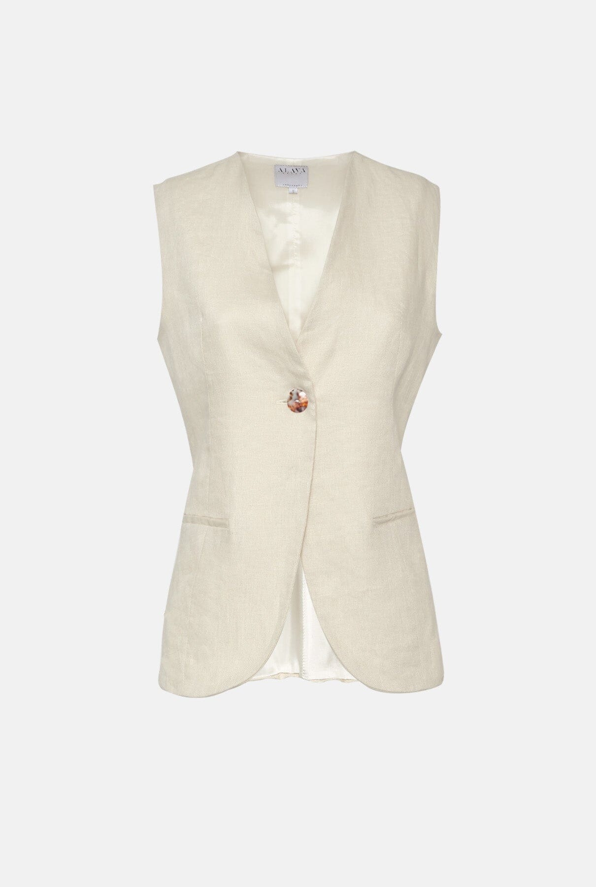 Chaleco confeccionado artesanalmente en nuestro taller de Lanzarote. Chaleco con escote en pico y manga larga. Falsos bolsillos ribeteados en la parte delantera. Forro interior a juego. Cierre frontal con botón de nácar.