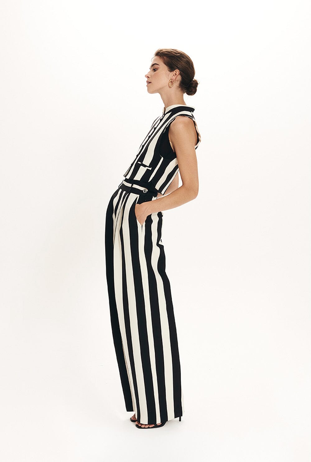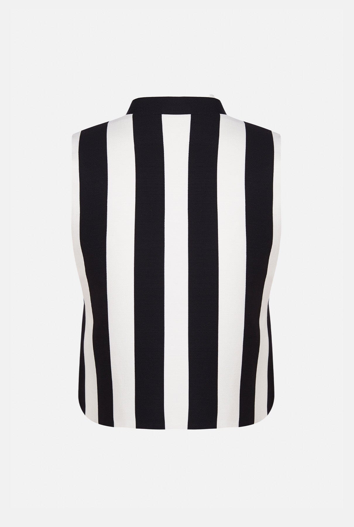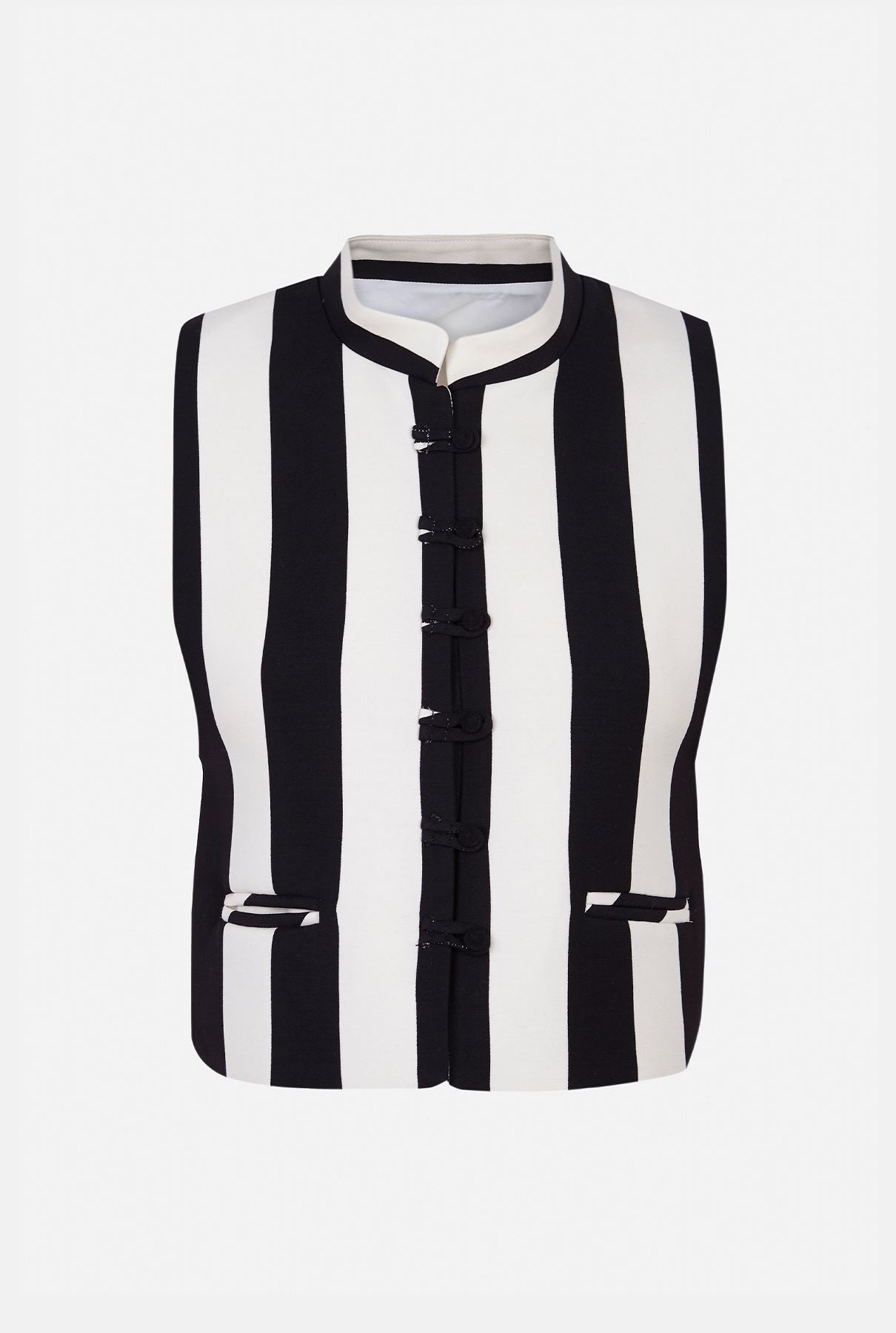 Chaleco/top de rayas blancas y negras. Tiene cuello mao y se abrocha con botón y ojales forrados.