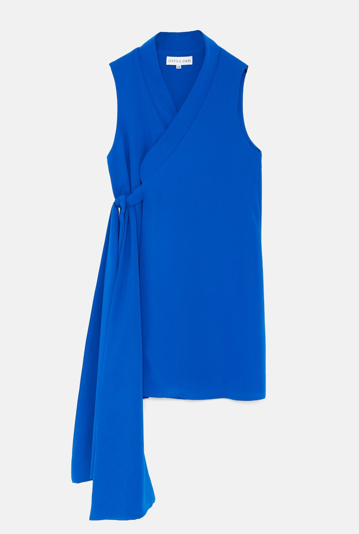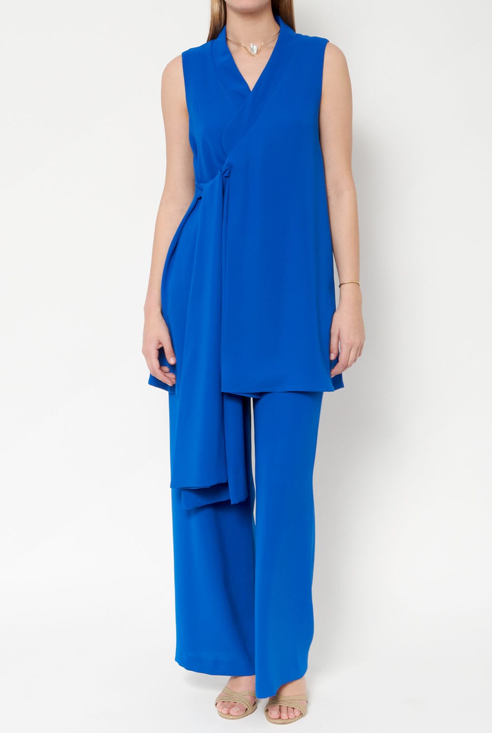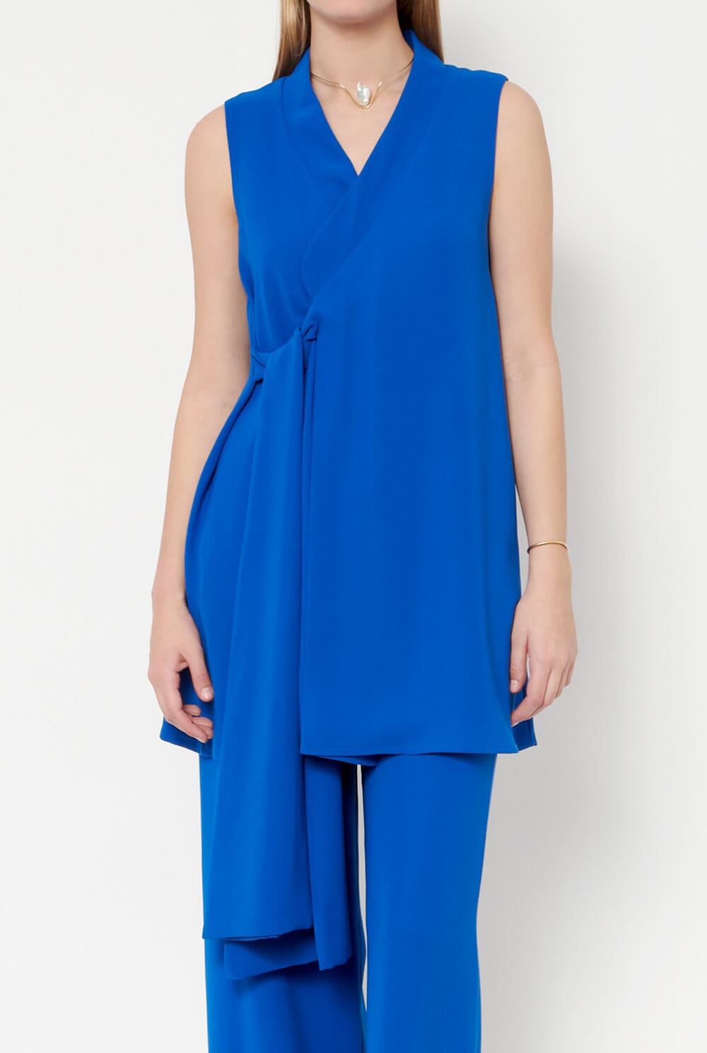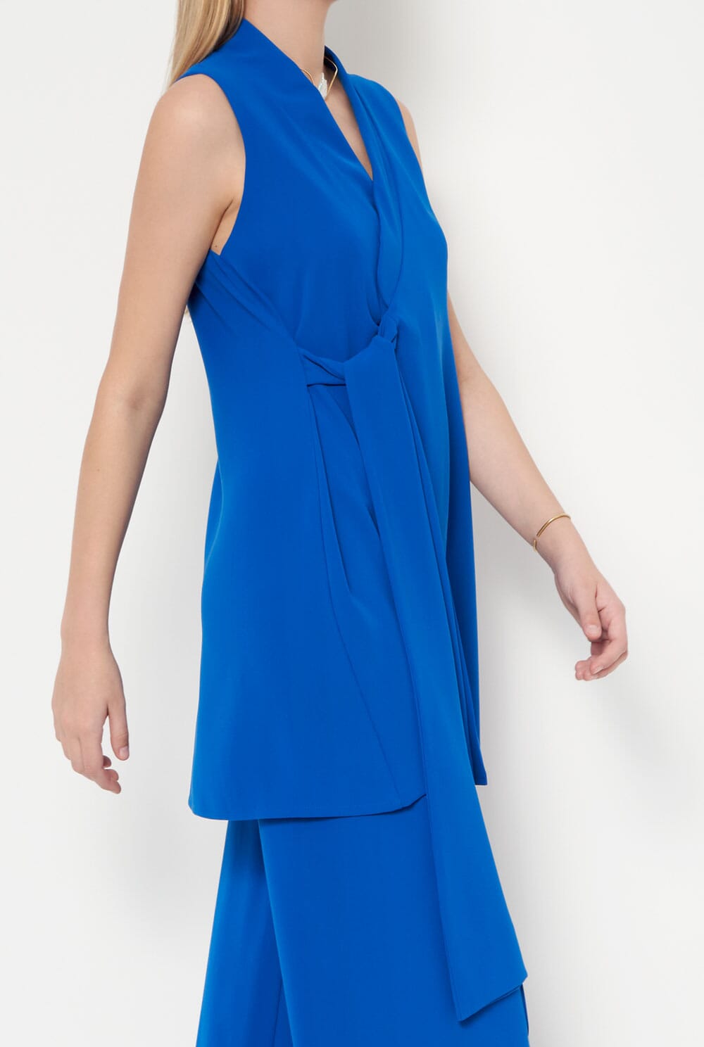 Chaleco cuello smoking, cierra con un gran lazo en el lado izquierdo. Tiene una caída espectacular.