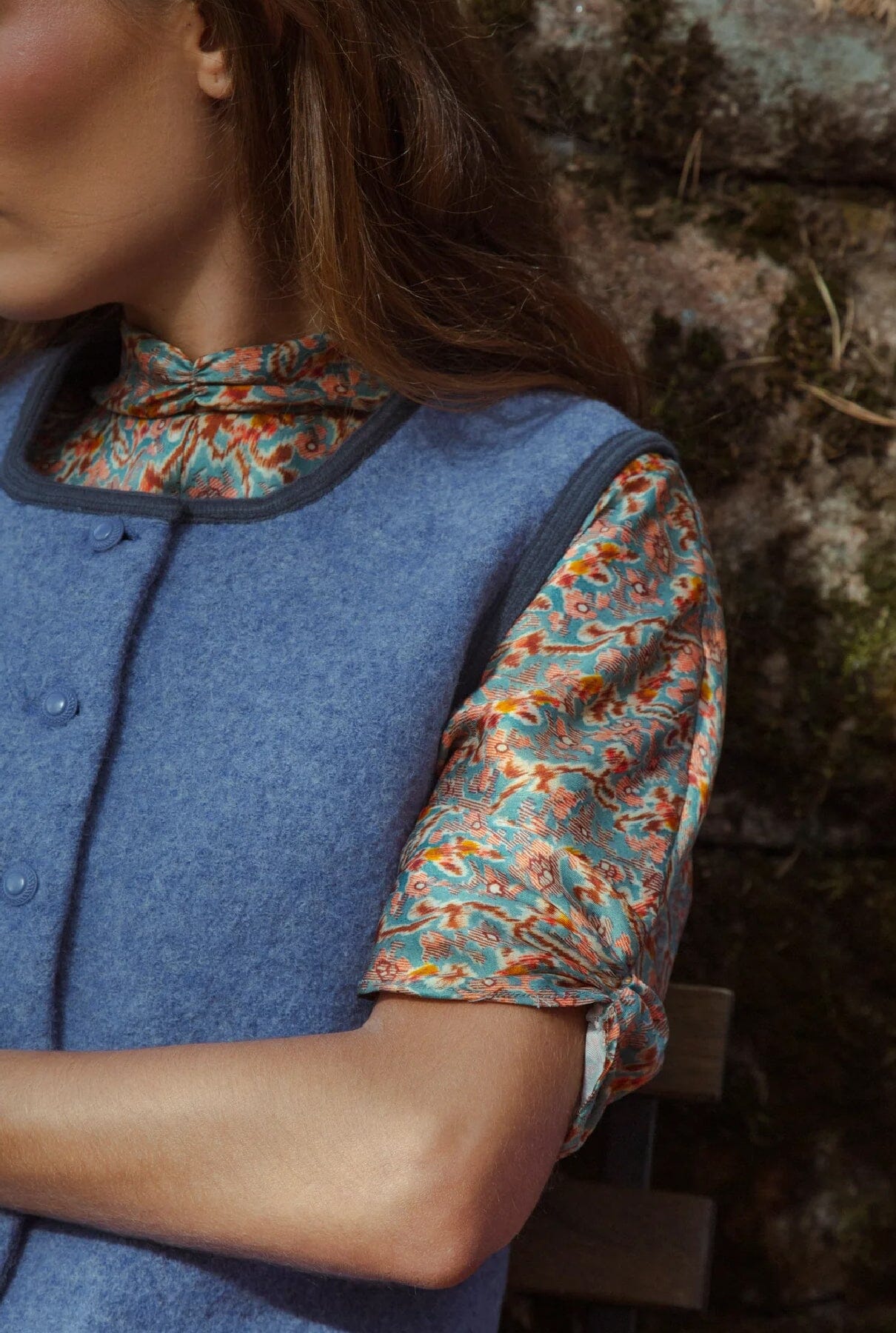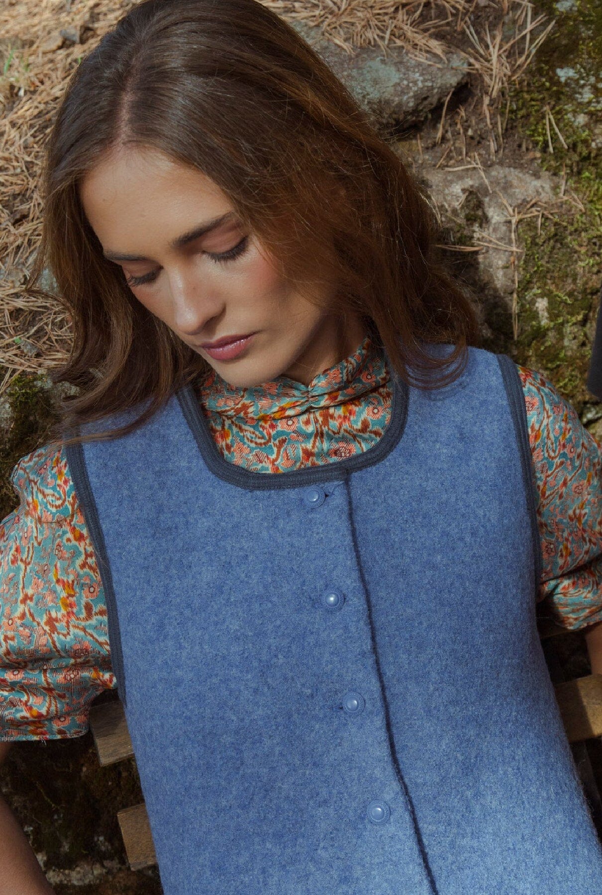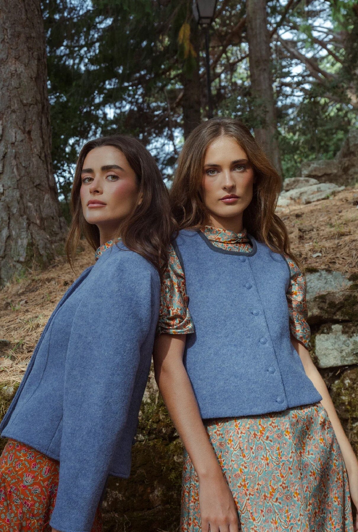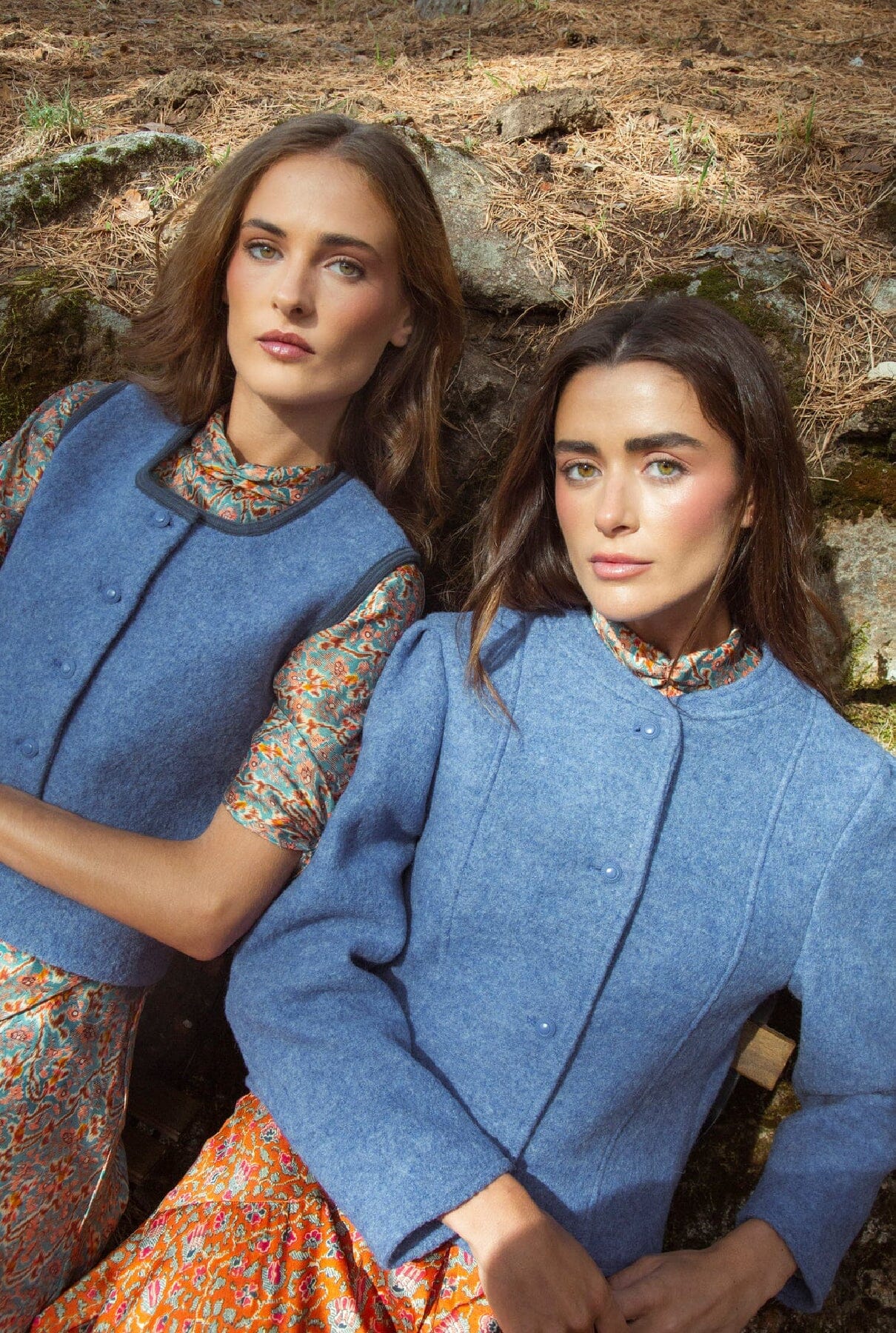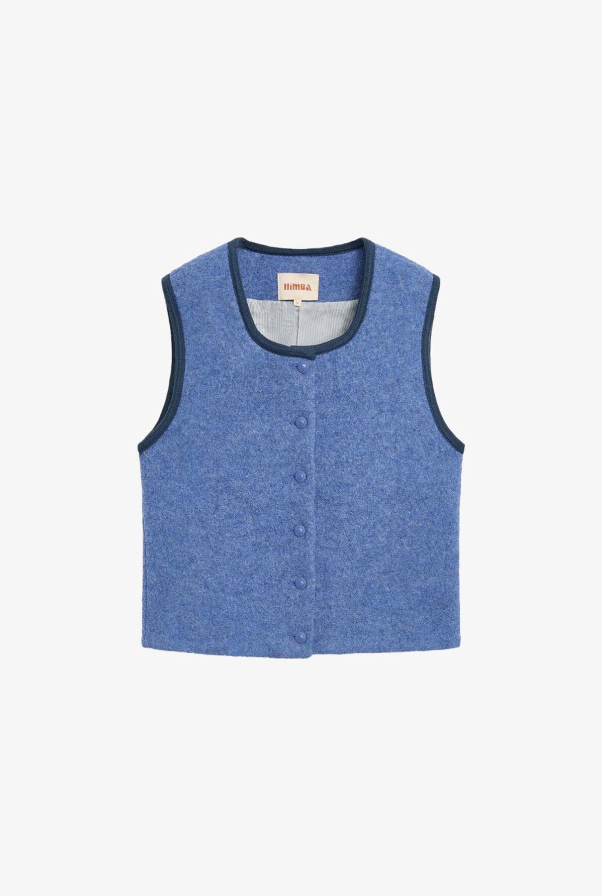 Chaleco de lana con botones forrados y cuello caja. Presenta el uso de ribetes en azul oscuro que crean un contraste con el tono más claro del chaleco. Ideal para combinar con una camisa blanca.