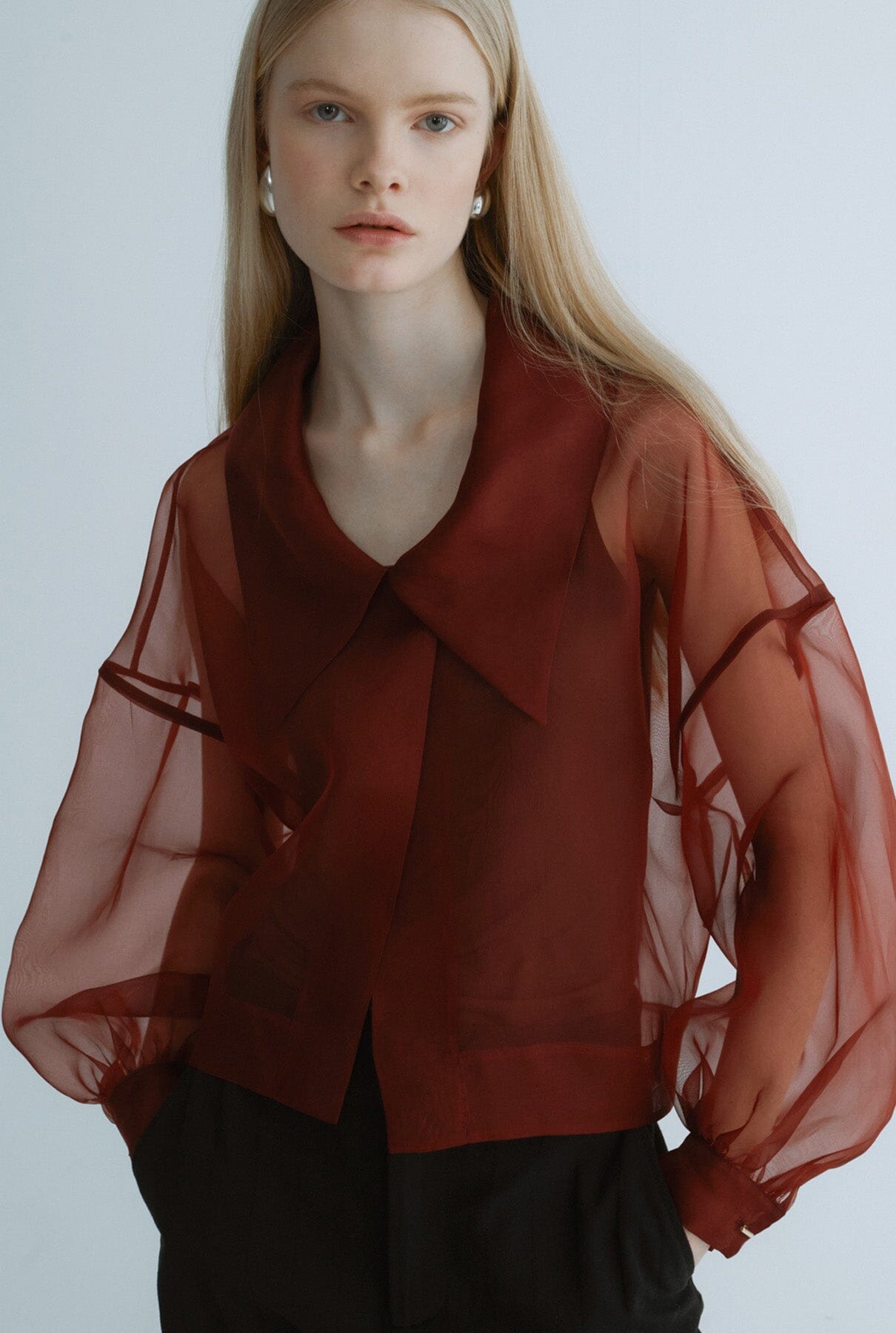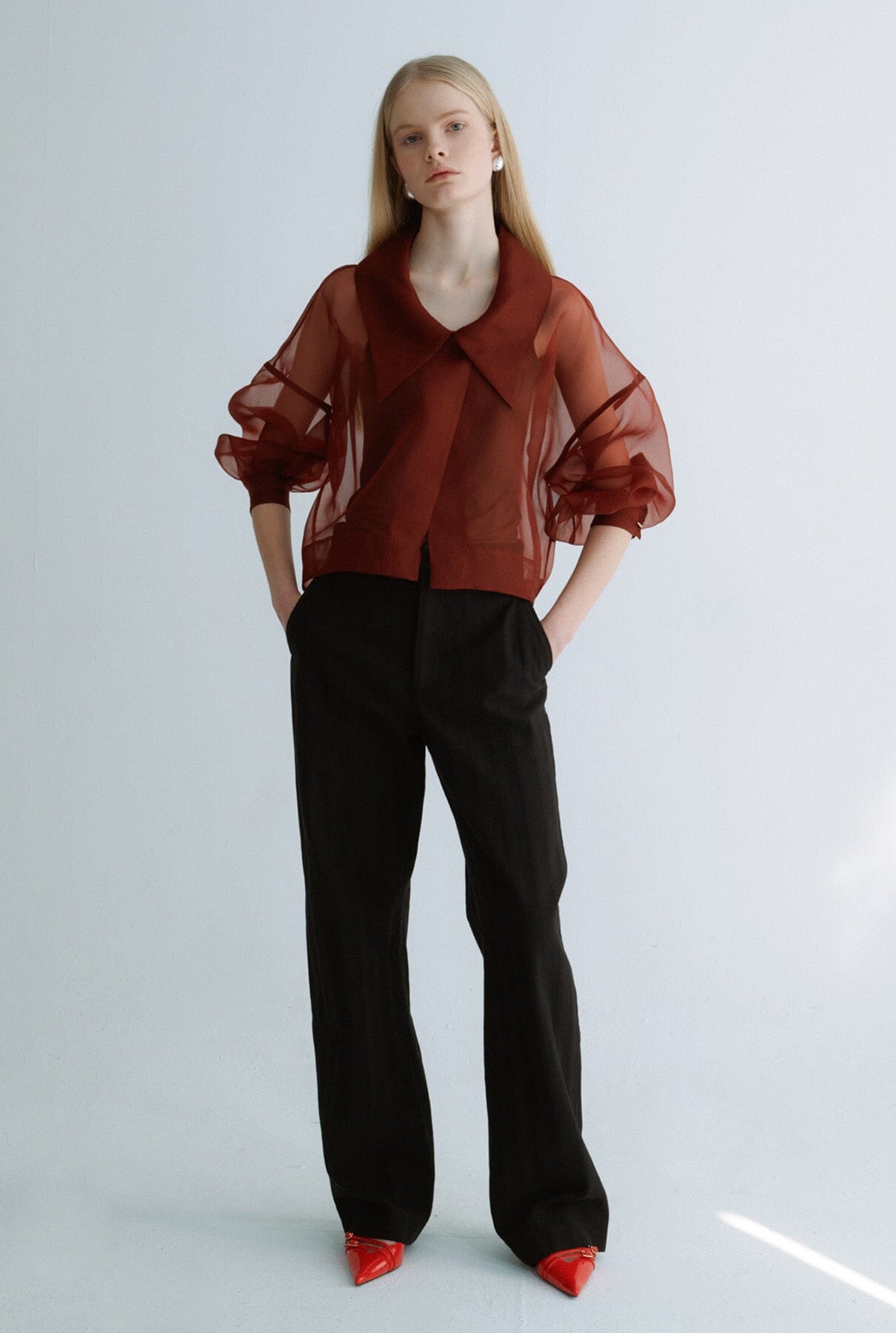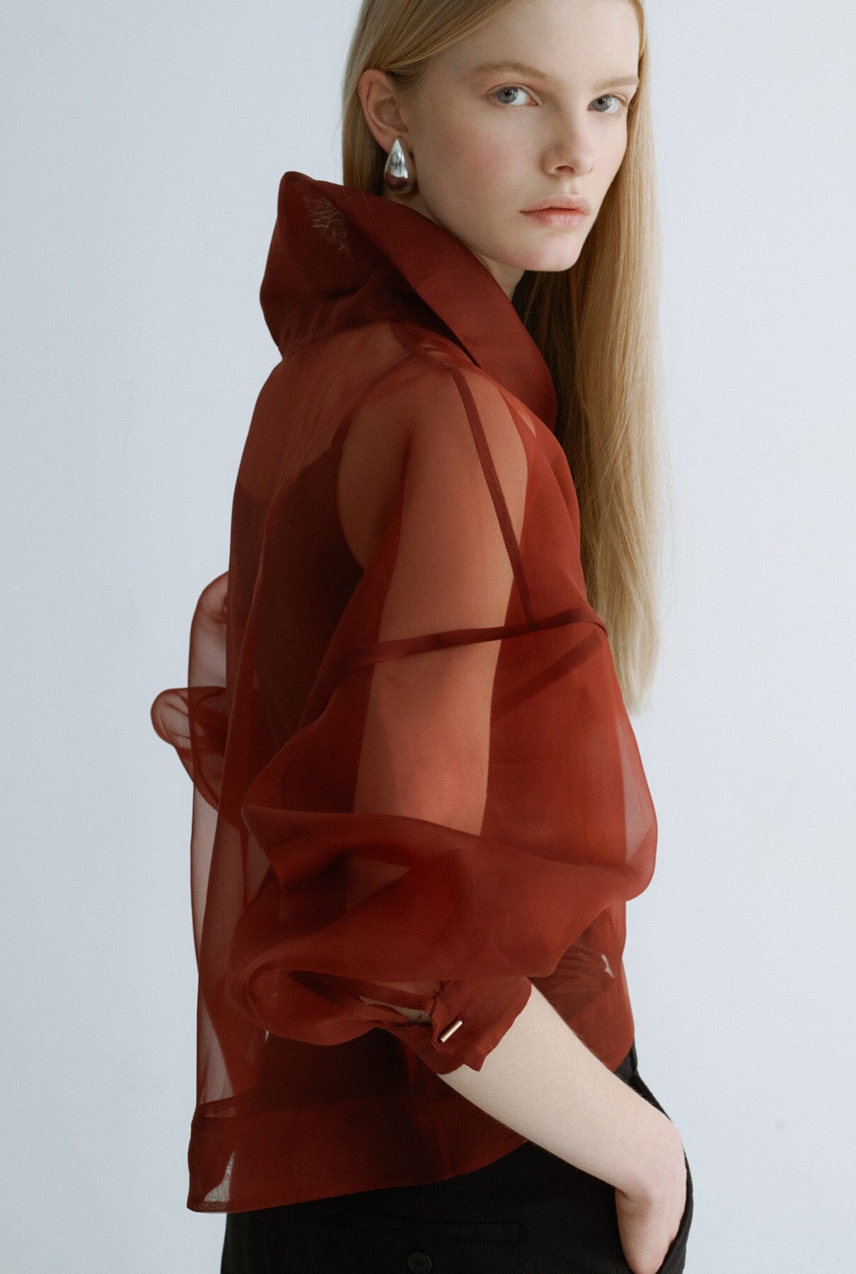 Chaqueta corta Miguel Marinero en organza color terracota. Modelo moderno con maxicuello camisero y puños ajustables con botón de presión.