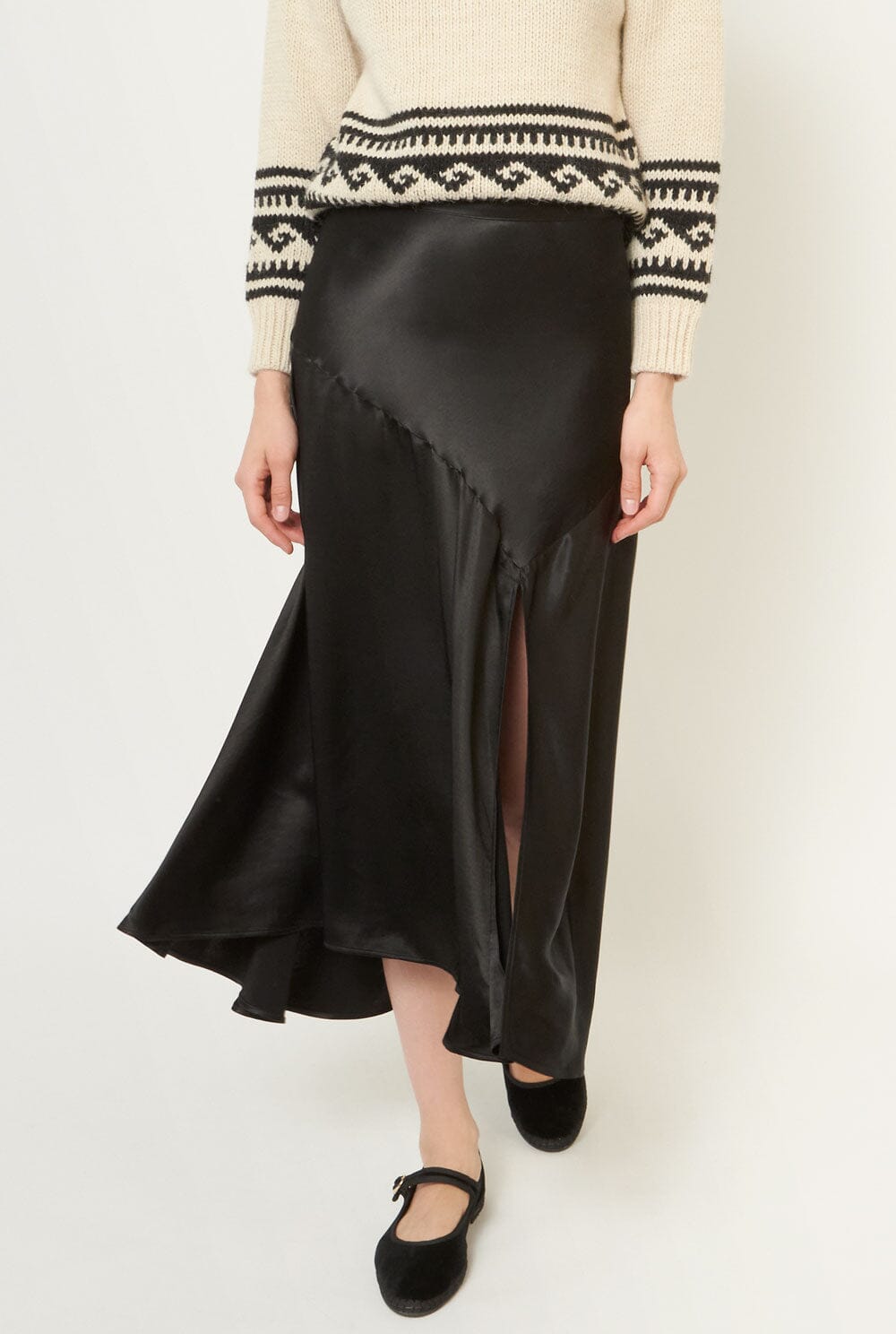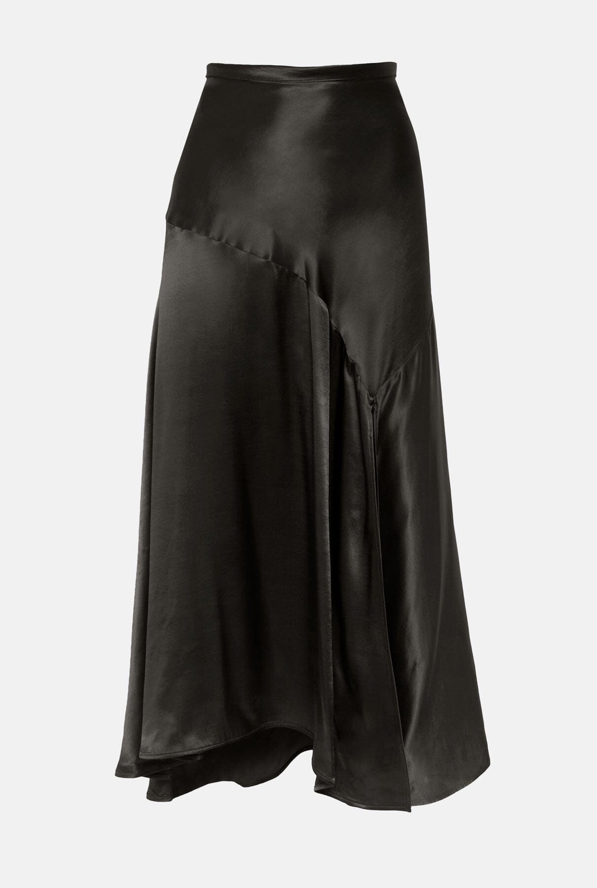 Falda midi de raso con talle alto y abertura lateral delantera hasta medio muslo. Con volante en el bajo de corte evasé. Cierre de cremallera lateral oculta.