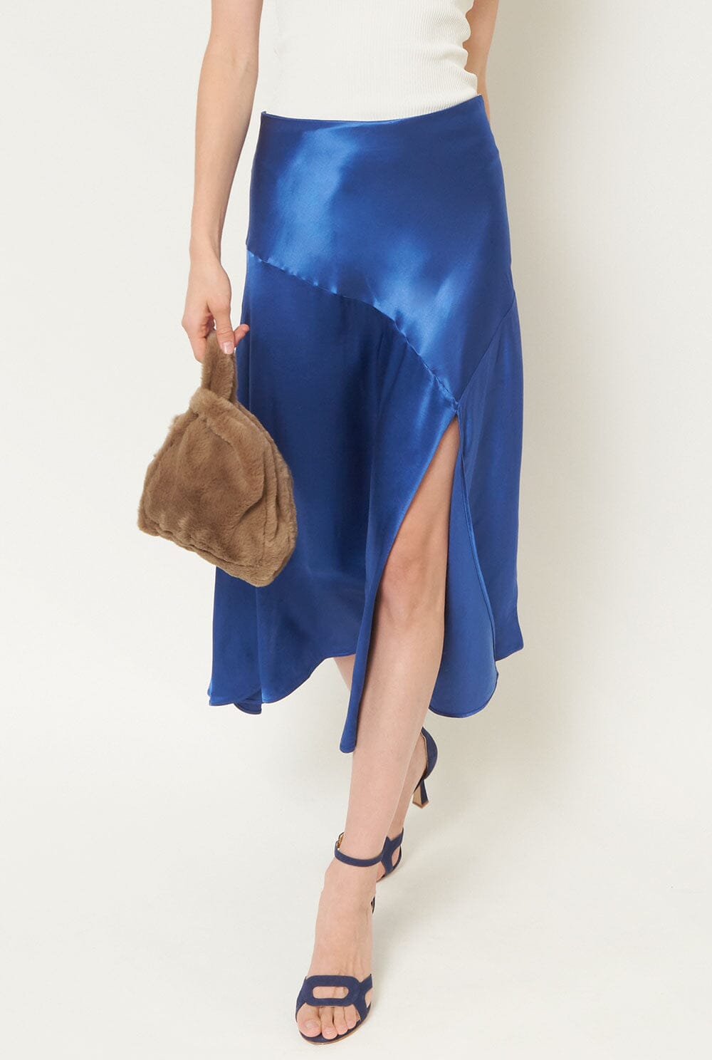Falda midi de raso con talle alto y abertura lateral delantera hasta medio muslo. Con volante en el bajo de corte evasé. Cierre de cremallera lateral oculta.