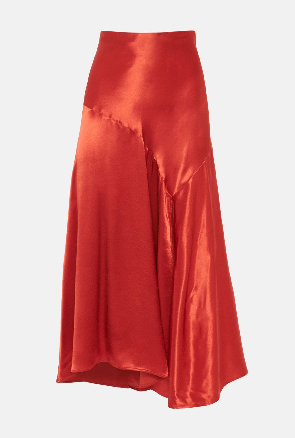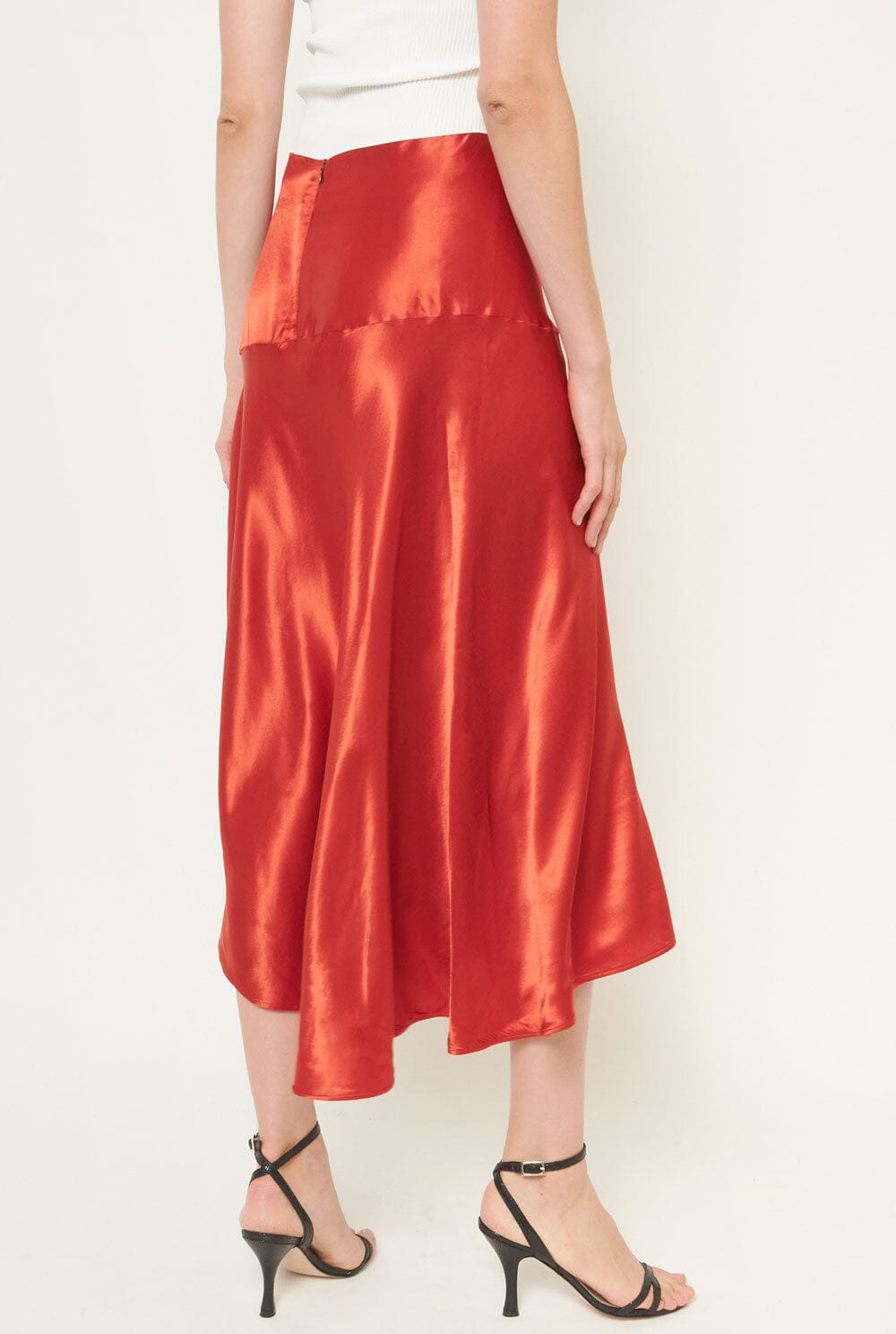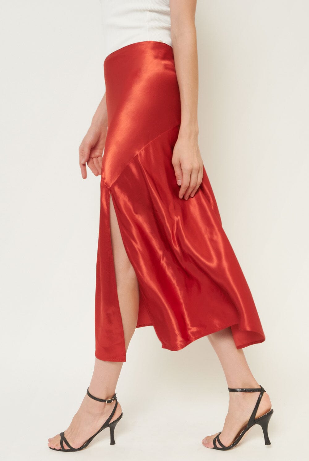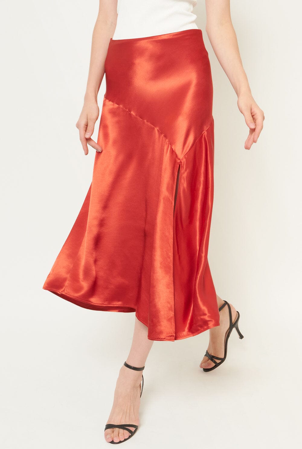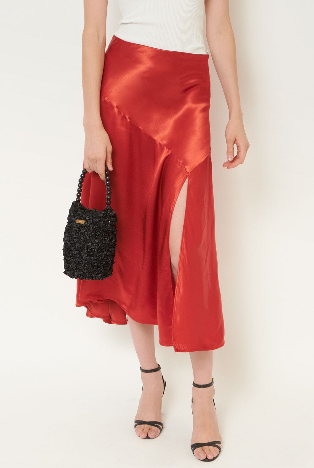 Falda midi de raso con talle alto y abertura lateral delantera hasta medio muslo. Con volante en el bajo de corte evasé. Cierre de cremallera lateral oculta.