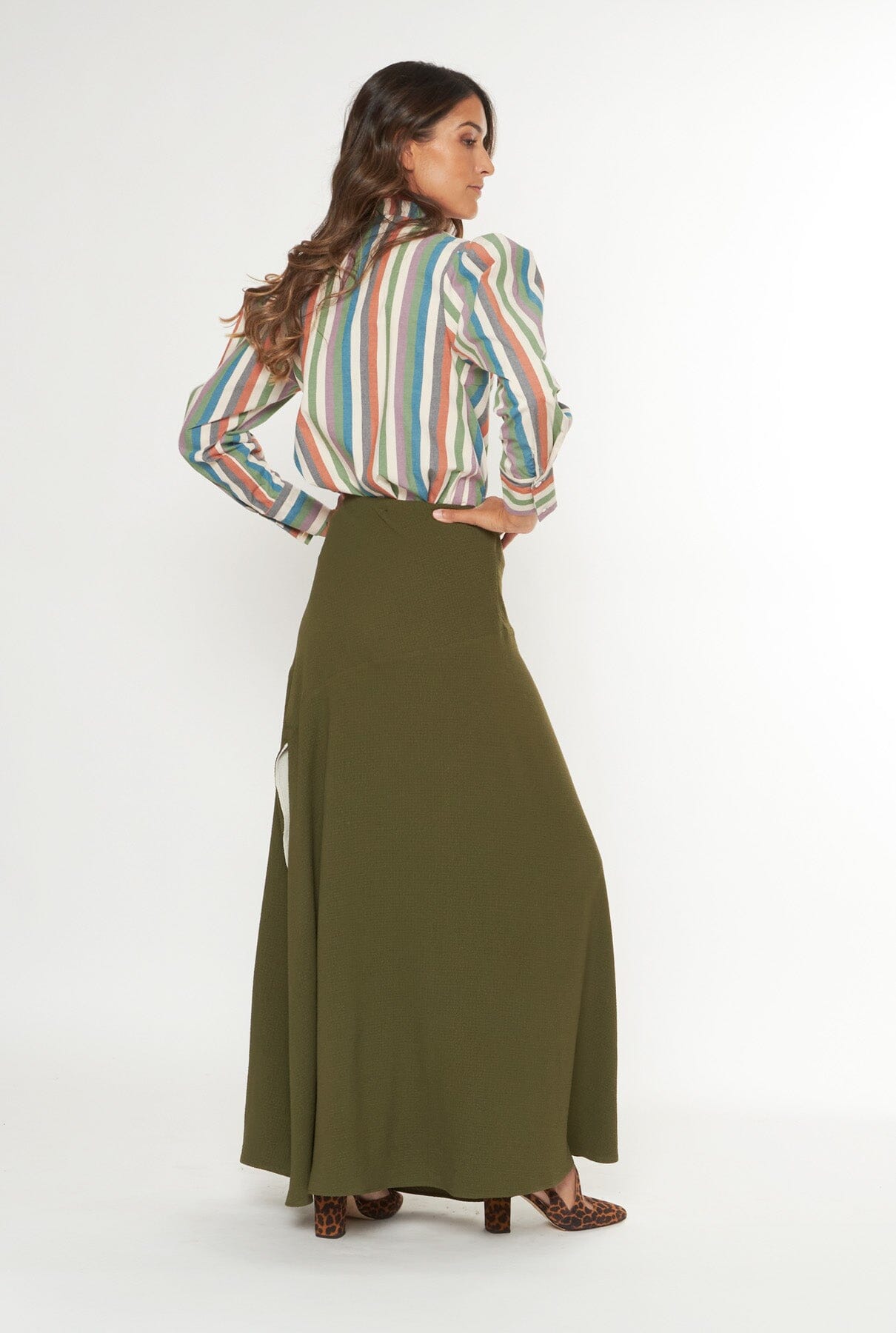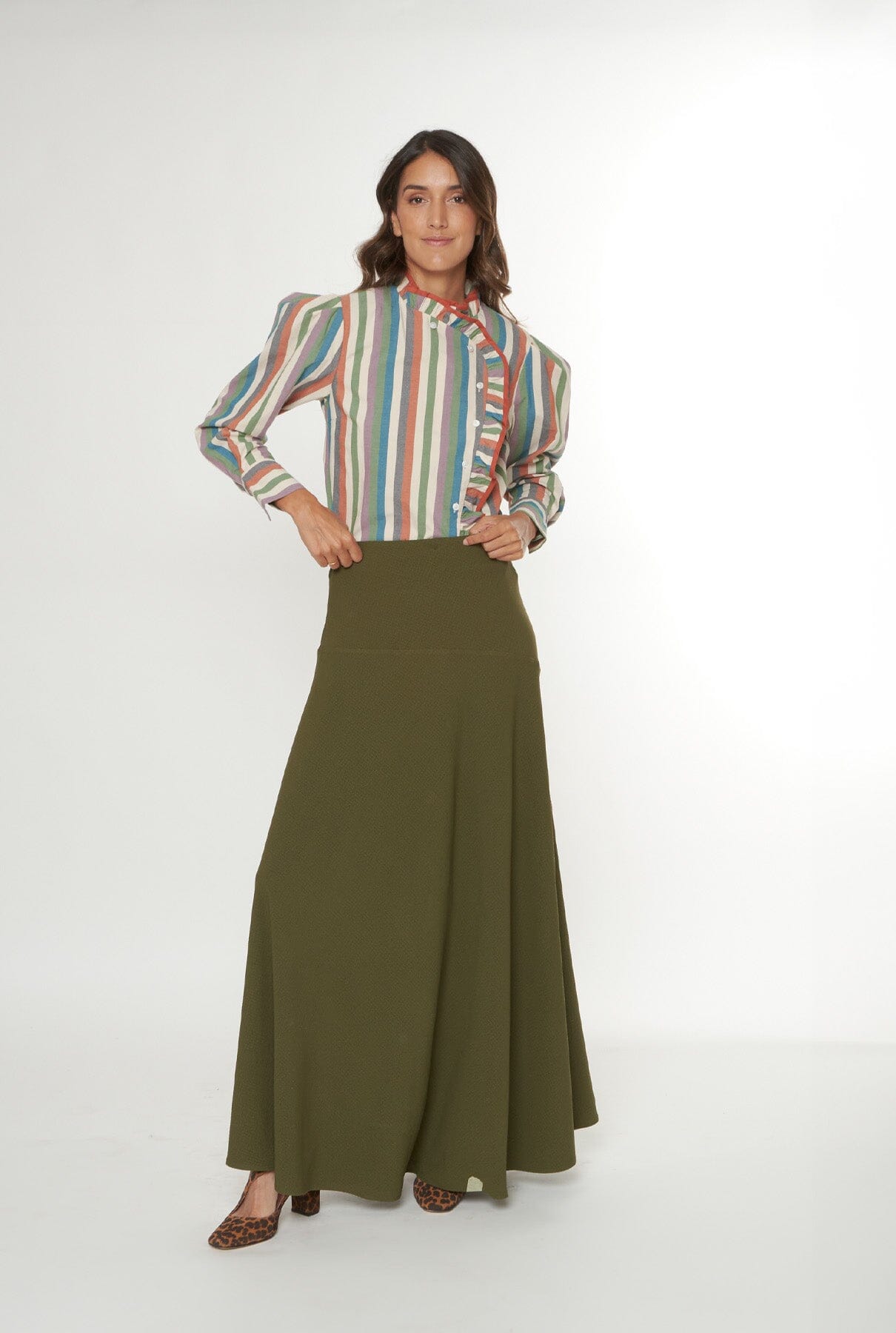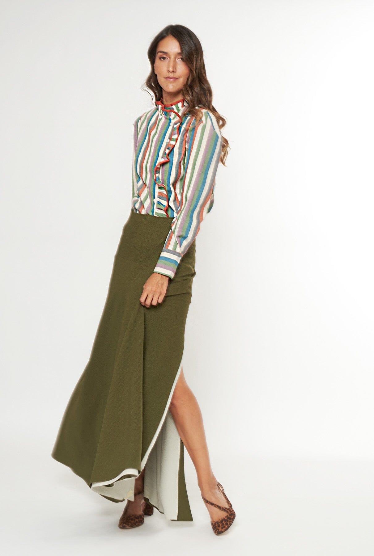 Falda larga de tiro alto con abertura lateral delantera hasta medio muslo. Tiene doble capa, la superior en color verde caqui y la inferior en color beige. Con un volante en la parte inferior de corte evasé que le da movimiento. Cierre con cremallera lateral.