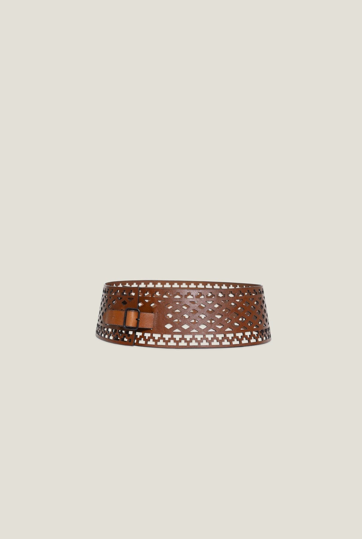 Cinturón calado tipo corsé elaborado en piel de vacuno de curtición vegetal color avellana.