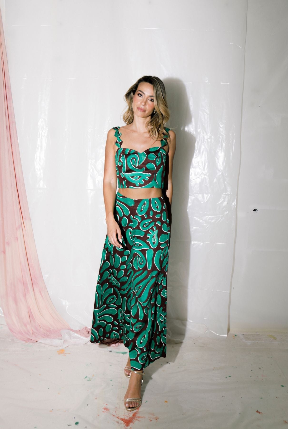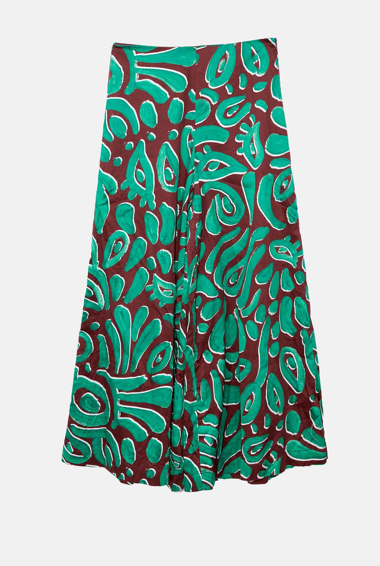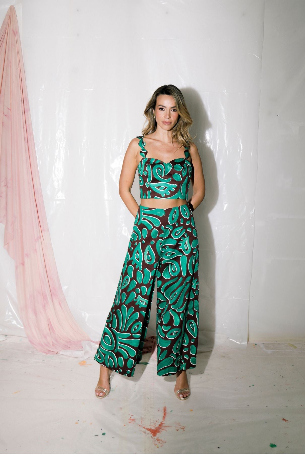 Pantalón de tiro alto y pernera ancha, confeccionado en tejido 100 % algodón. Corte holgado y caída fluida. Estampado exclusivo de Arena Martínez.