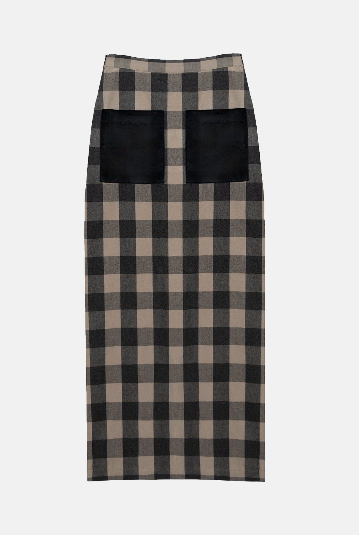 Falda recta de estampado de grandes cuadros vichy en tonos negro y humo. Cierre con cremallera en espalda. Tiene 2 bolsillos de plastrón en terciopelo negro a contraste. Abertura en el bajo en espalda para mayor comodidad.