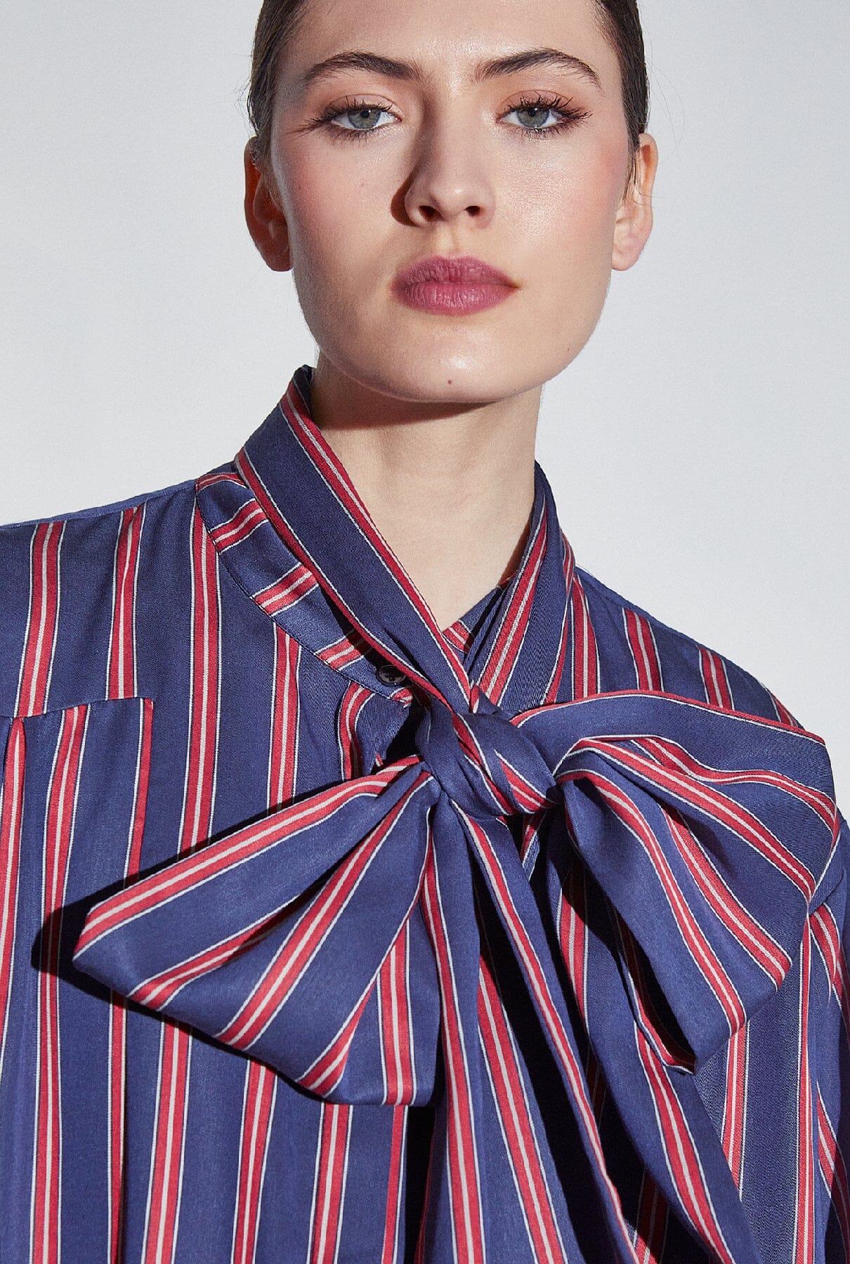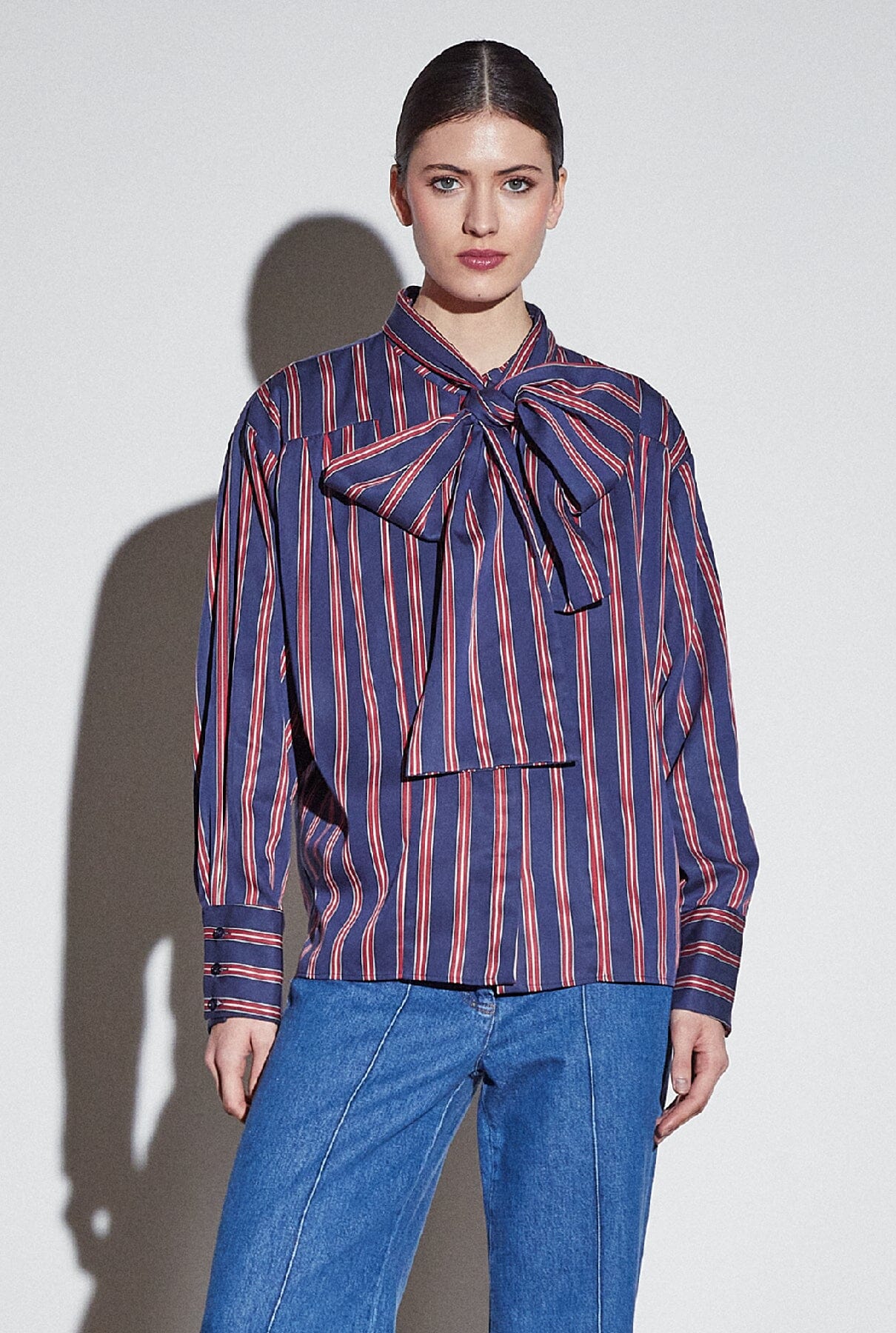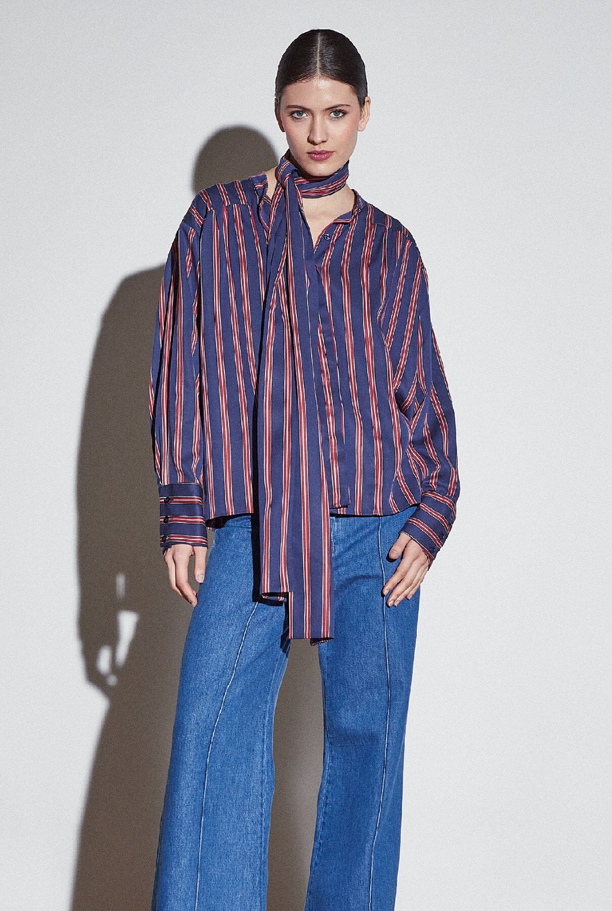 Esta camisa de manga larga a rayas de color rojo y azul tiene puños anchos y un detalle de encaje que permite infinitas posibilidades de estilo. La prenda versátil perfecta para realzar tus looks.