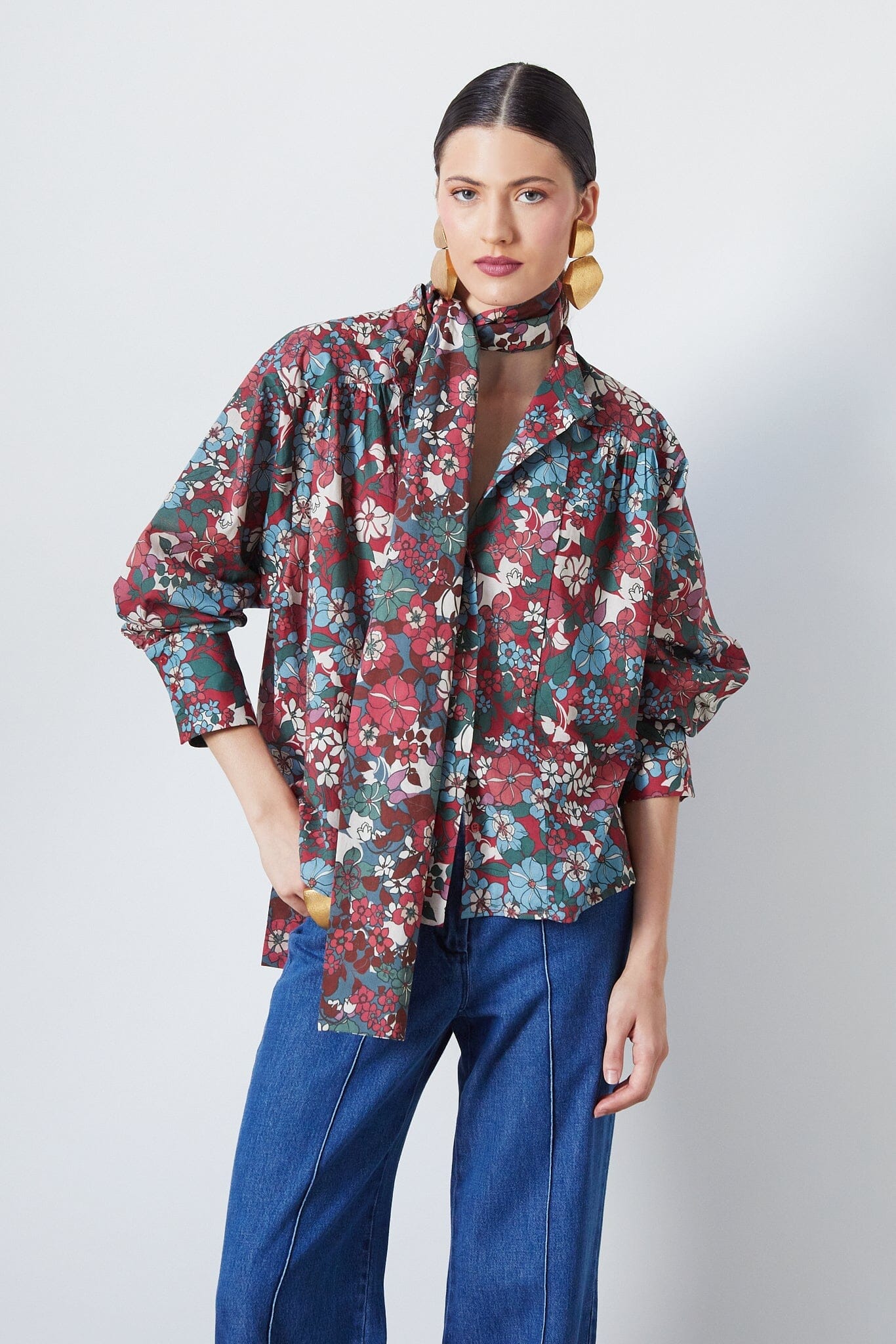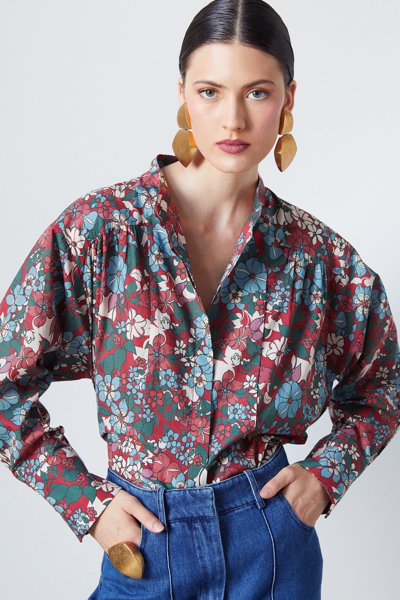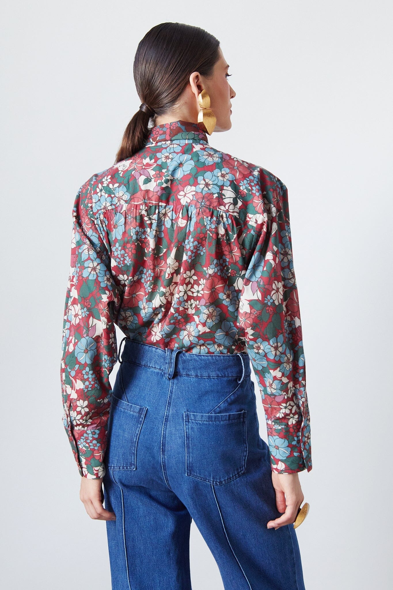 Esta camisa floreciente de manga larga en color granate presenta puños anchos y un detalle de encaje que permite infinitas posibilidades de estilo. La prenda versátil perfecta para realzar tus looks.
