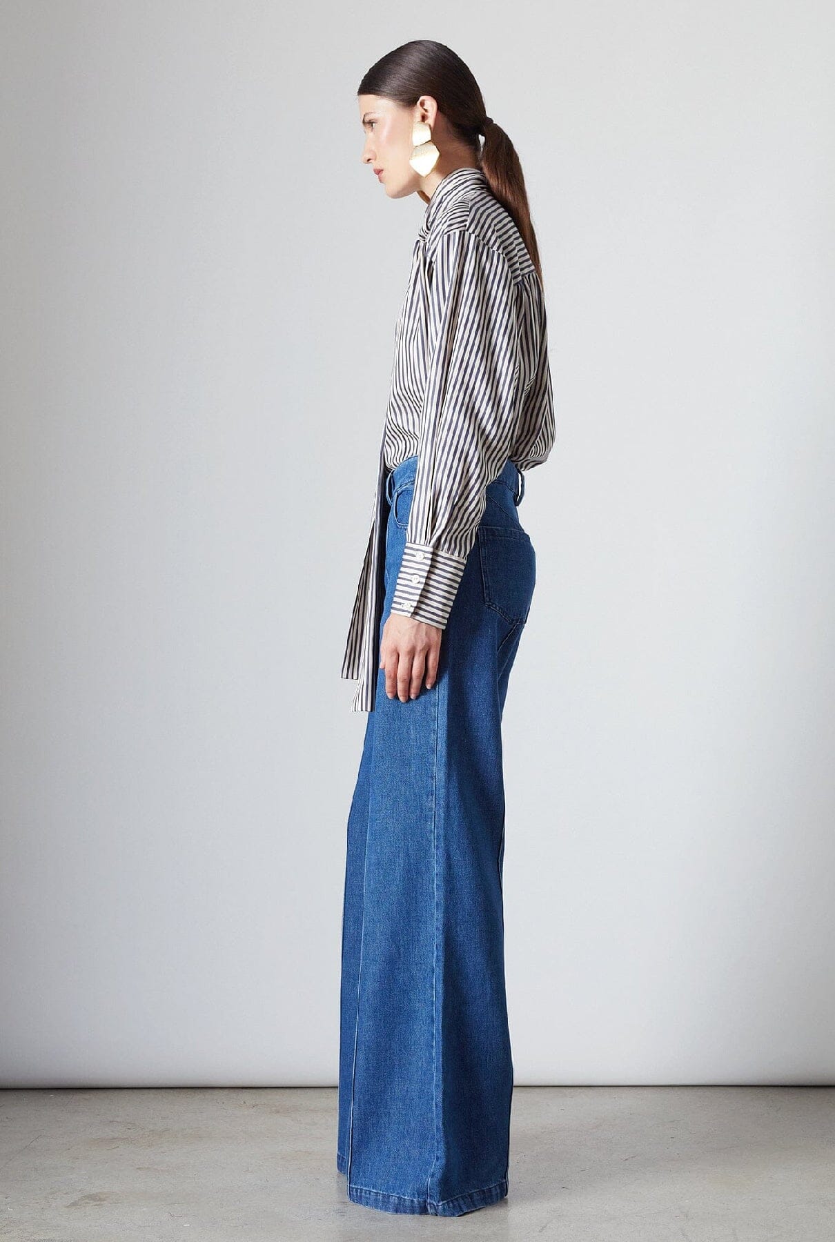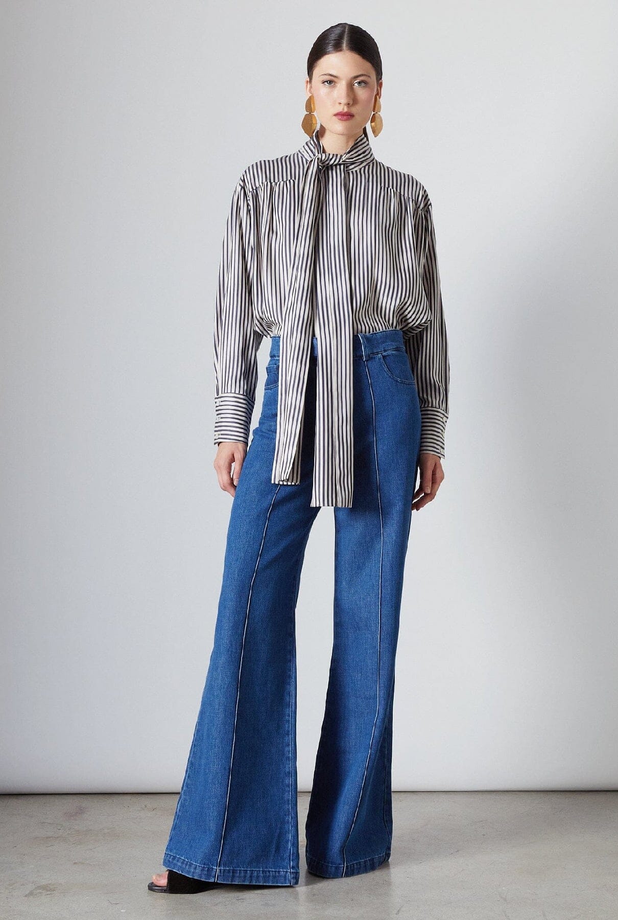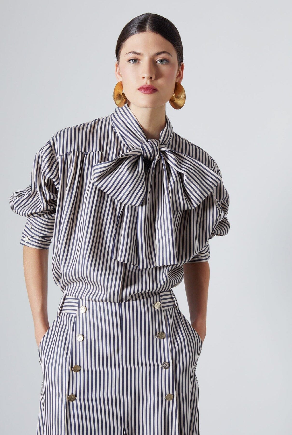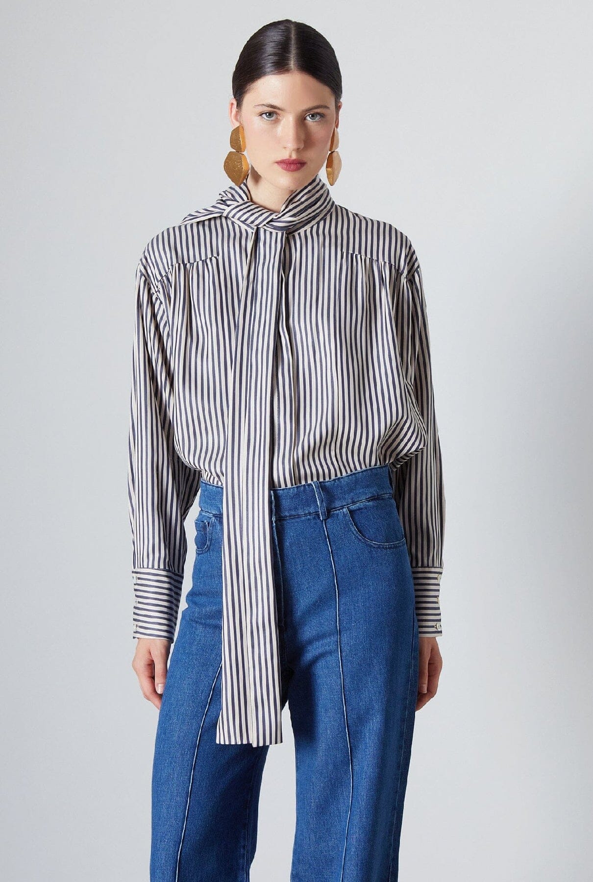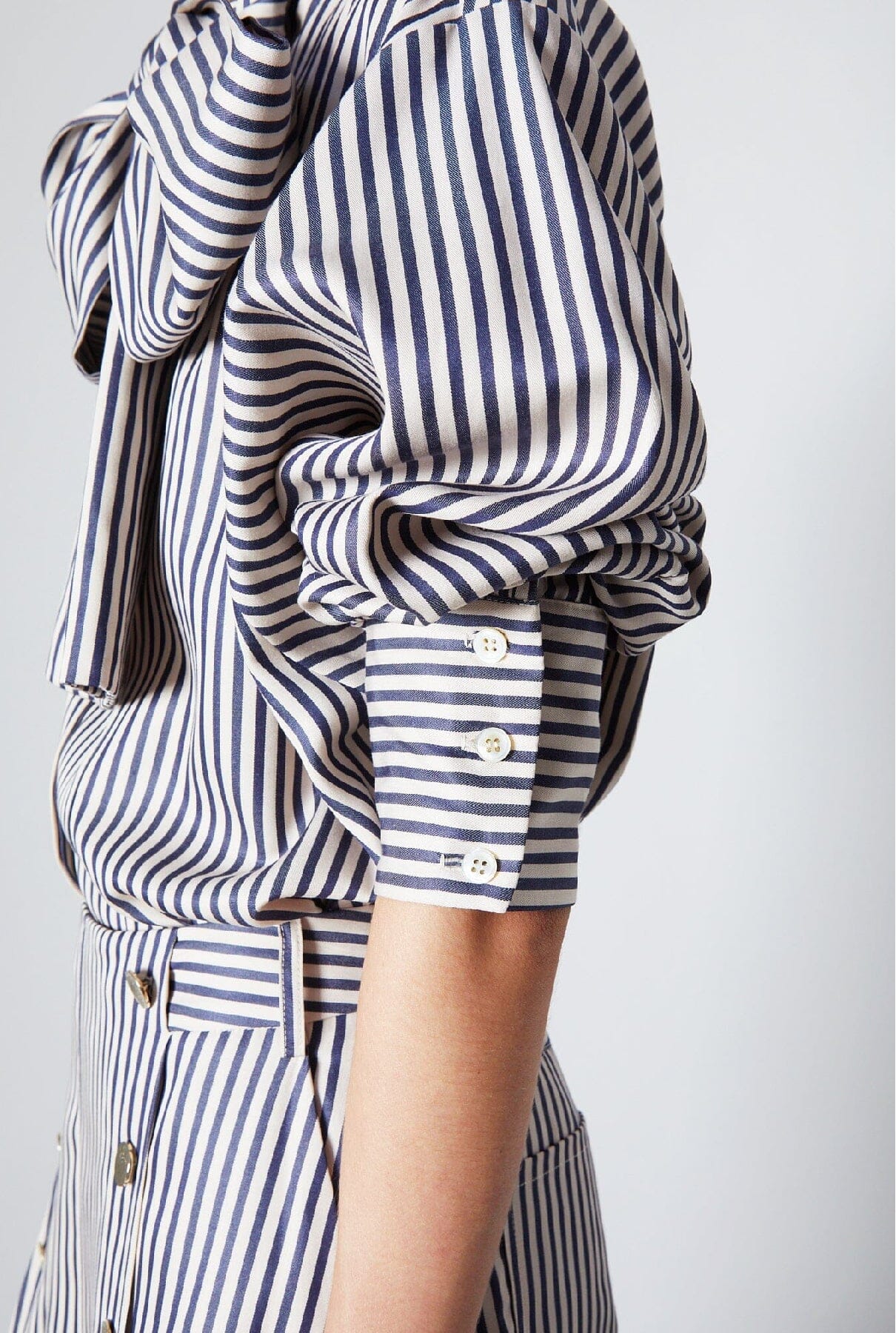 Esta camisa de rayas de color azul marino y manga larga presenta puños anchos y un detalle de encaje que permite infinitas posibilidades de estilo. La prenda versátil perfecta para realzar tus looks.