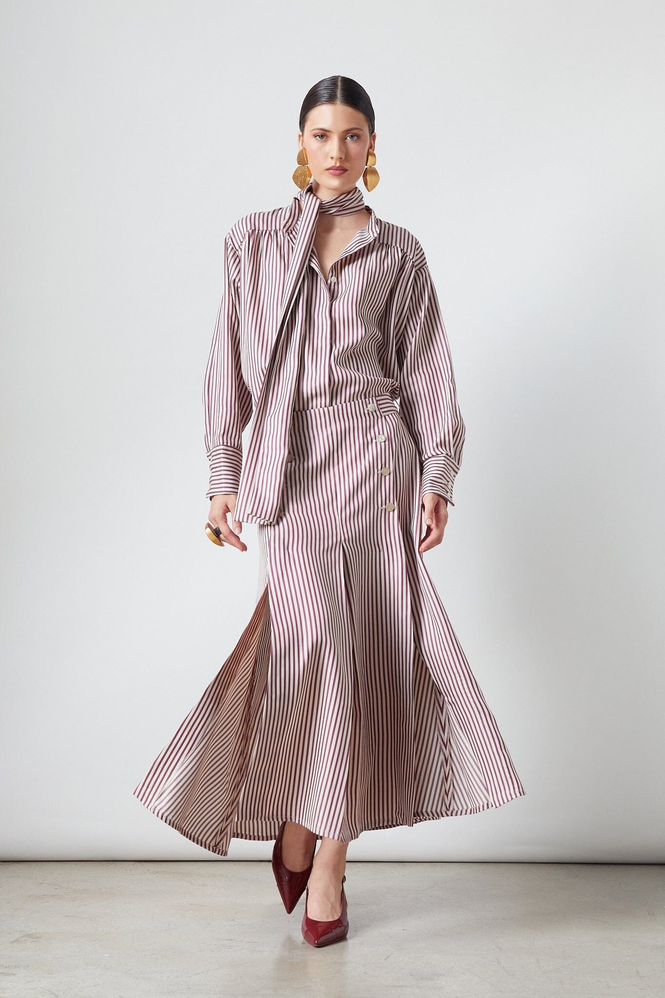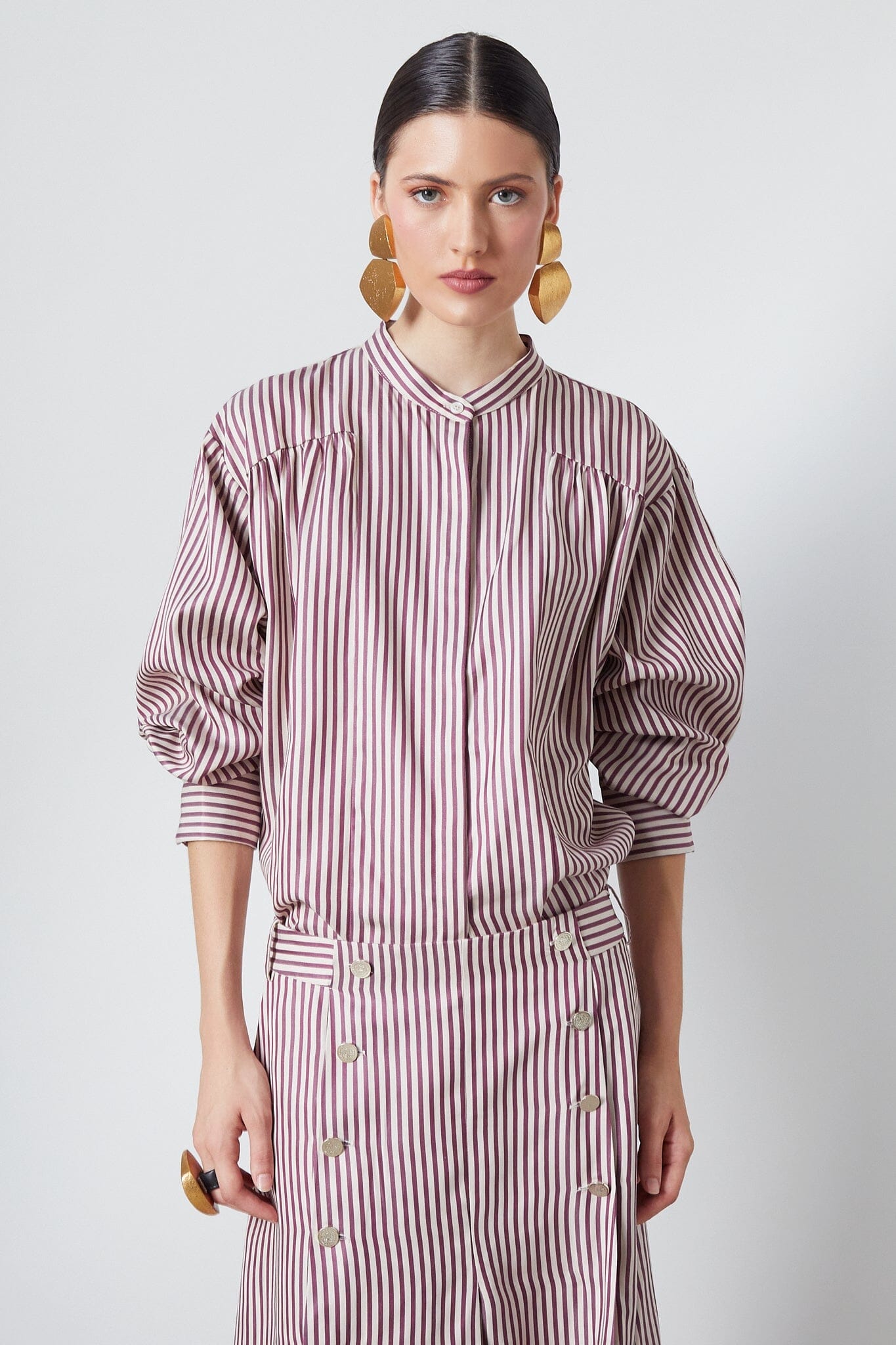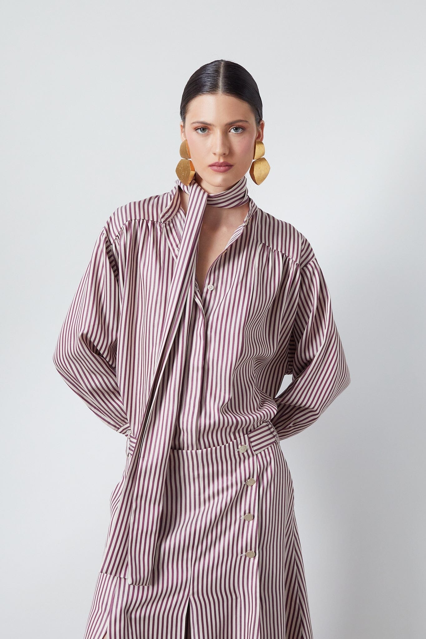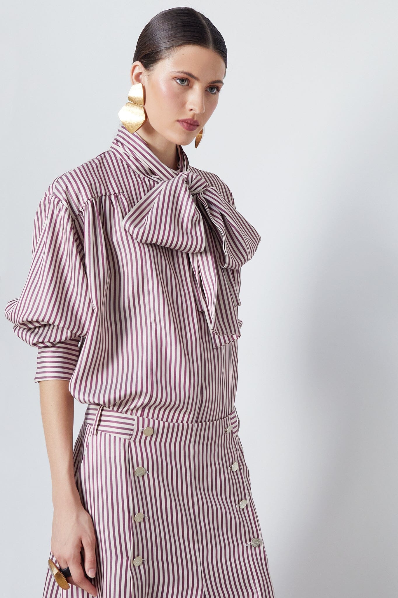 Esta camisa de rayas color vino de manga larga presenta puños anchos y un detalle de encaje que permite infinitas posibilidades de estilo. La prenda versátil perfecta para realzar tus looks.