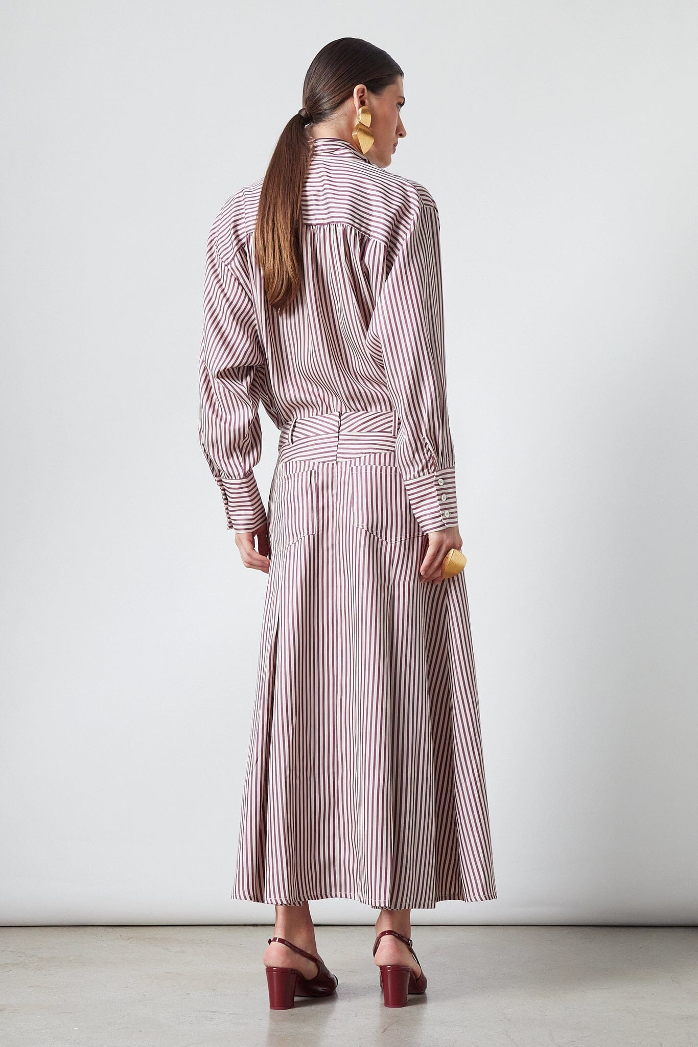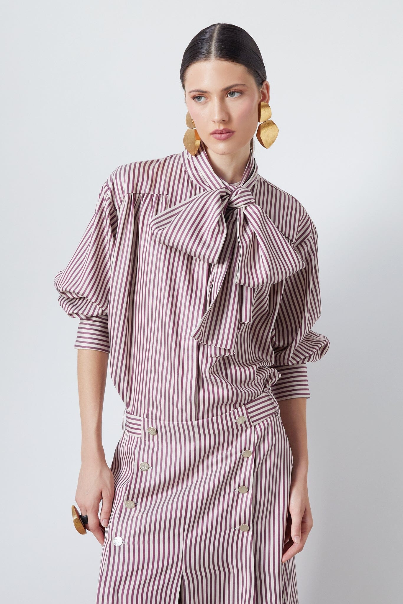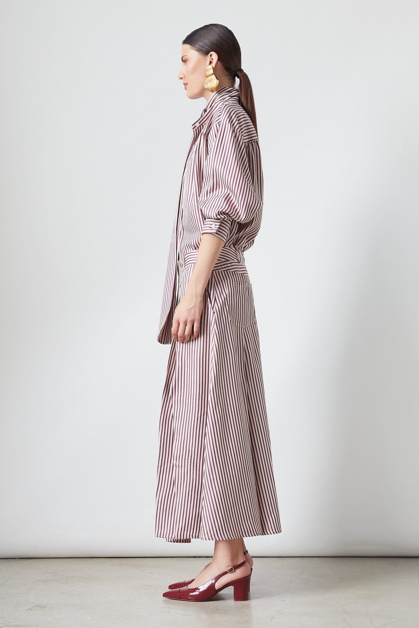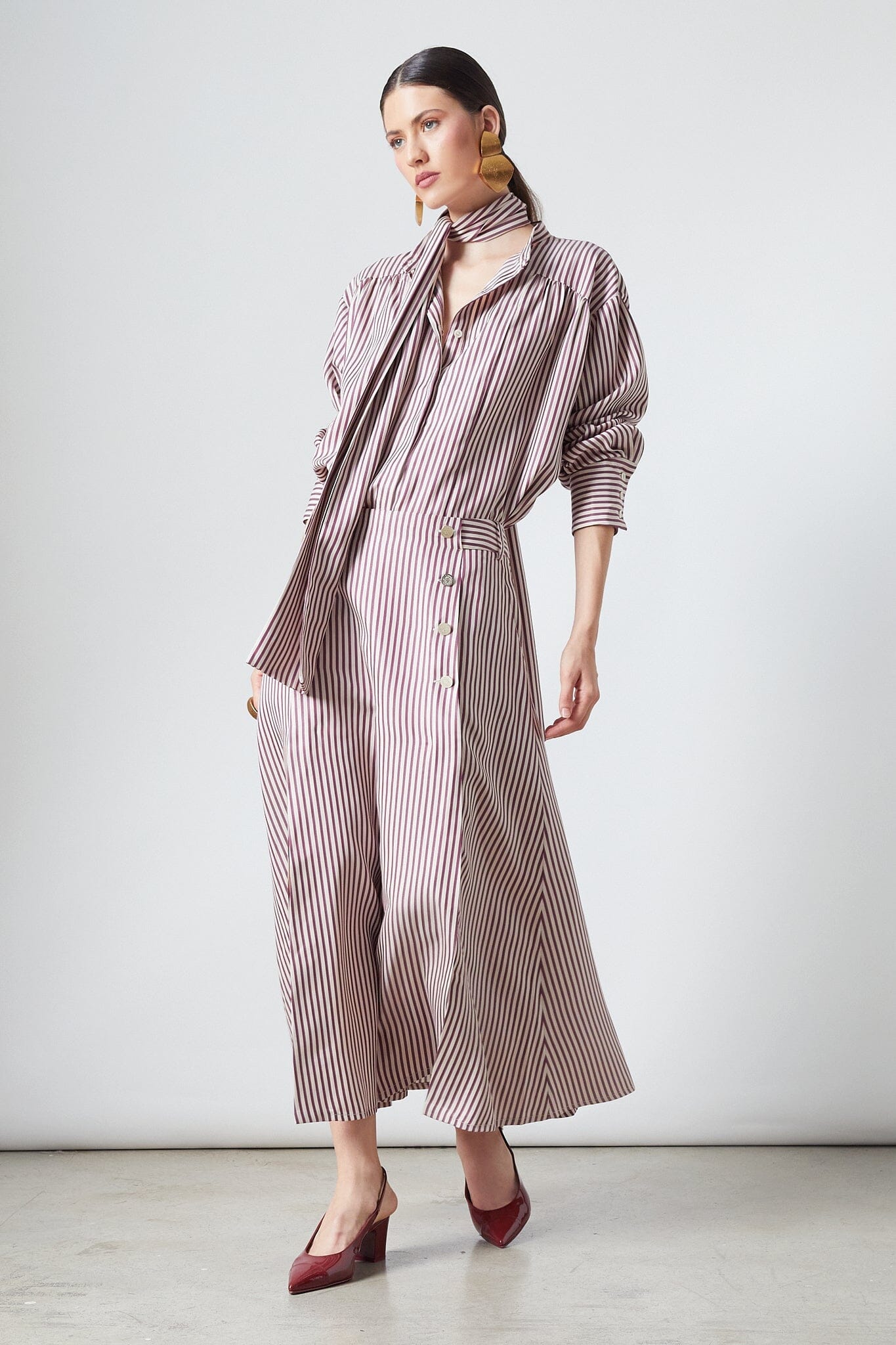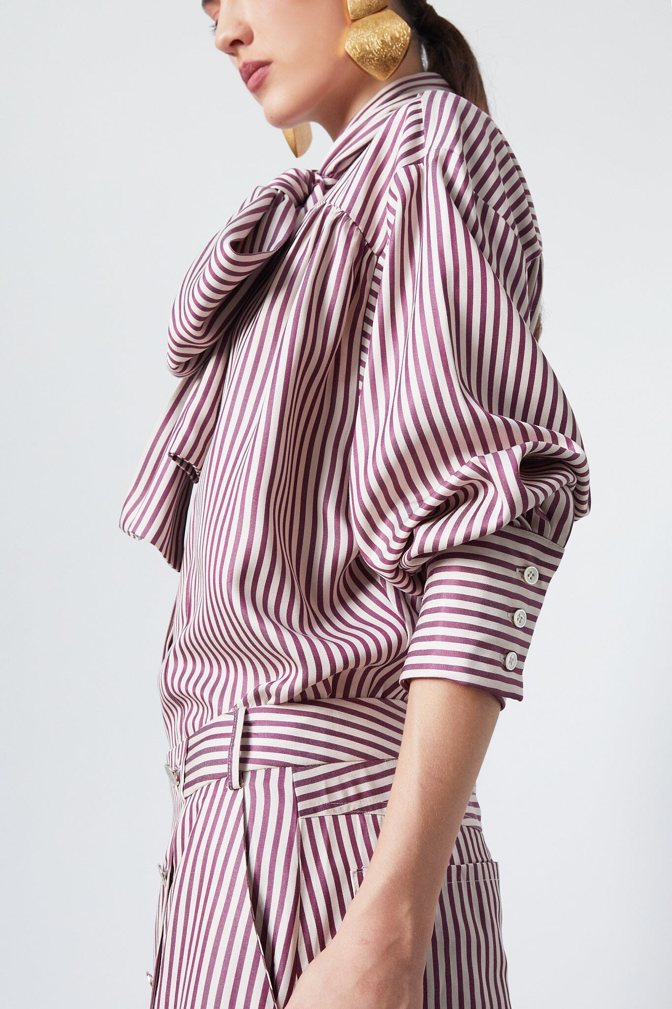 Esta camisa de rayas color vino de manga larga presenta puños anchos y un detalle de encaje que permite infinitas posibilidades de estilo. La prenda versátil perfecta para realzar tus looks.