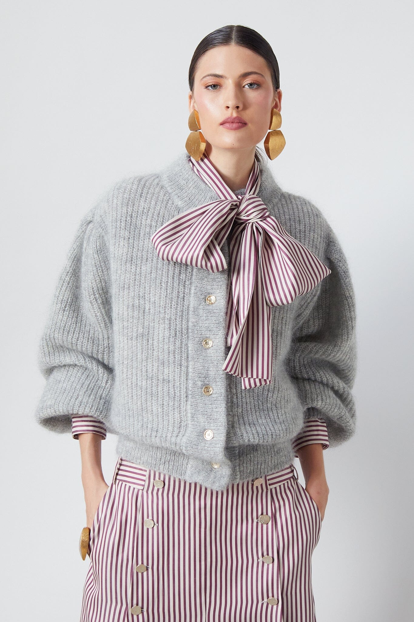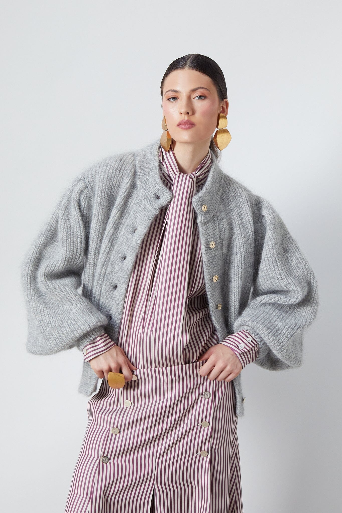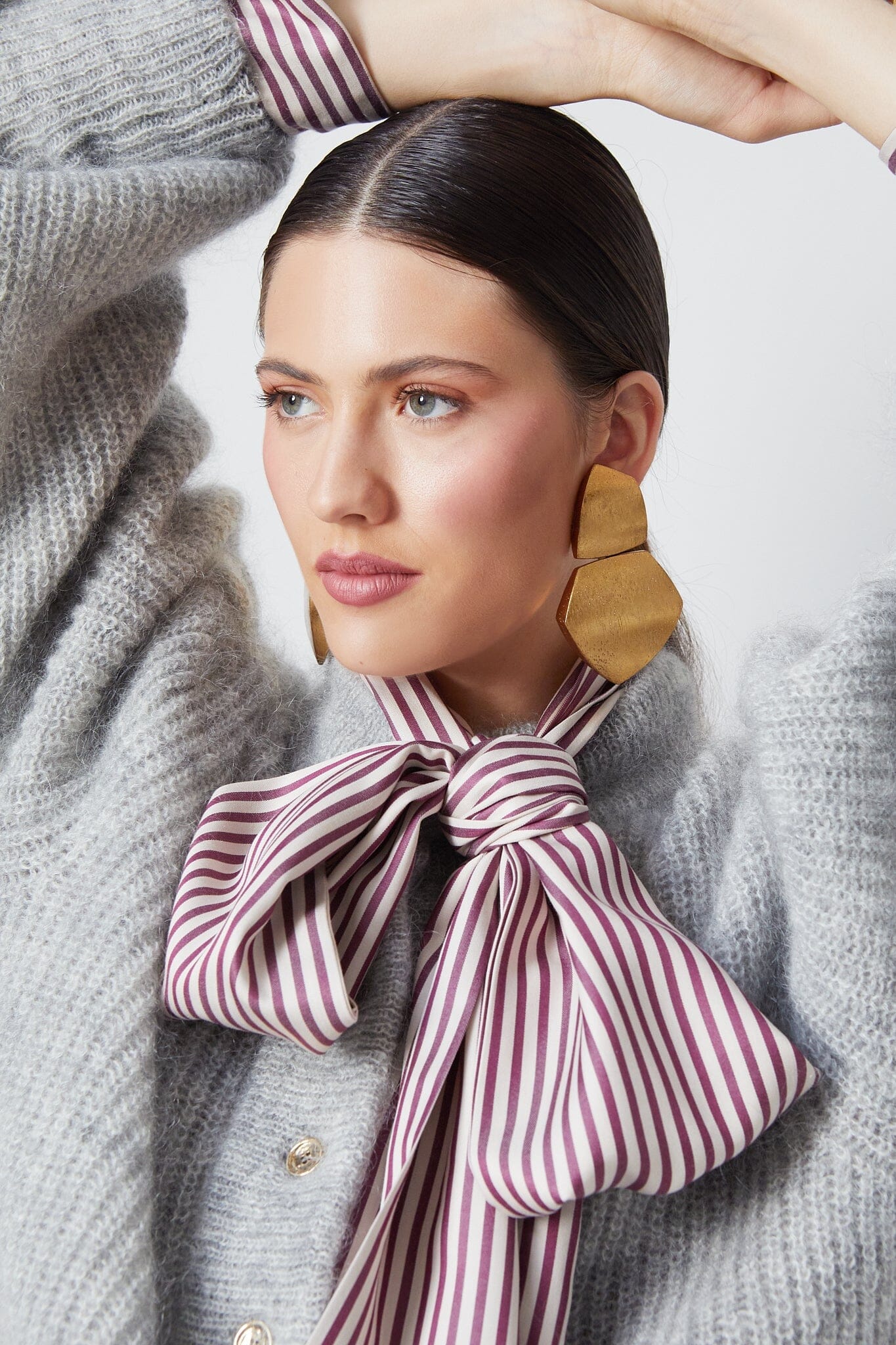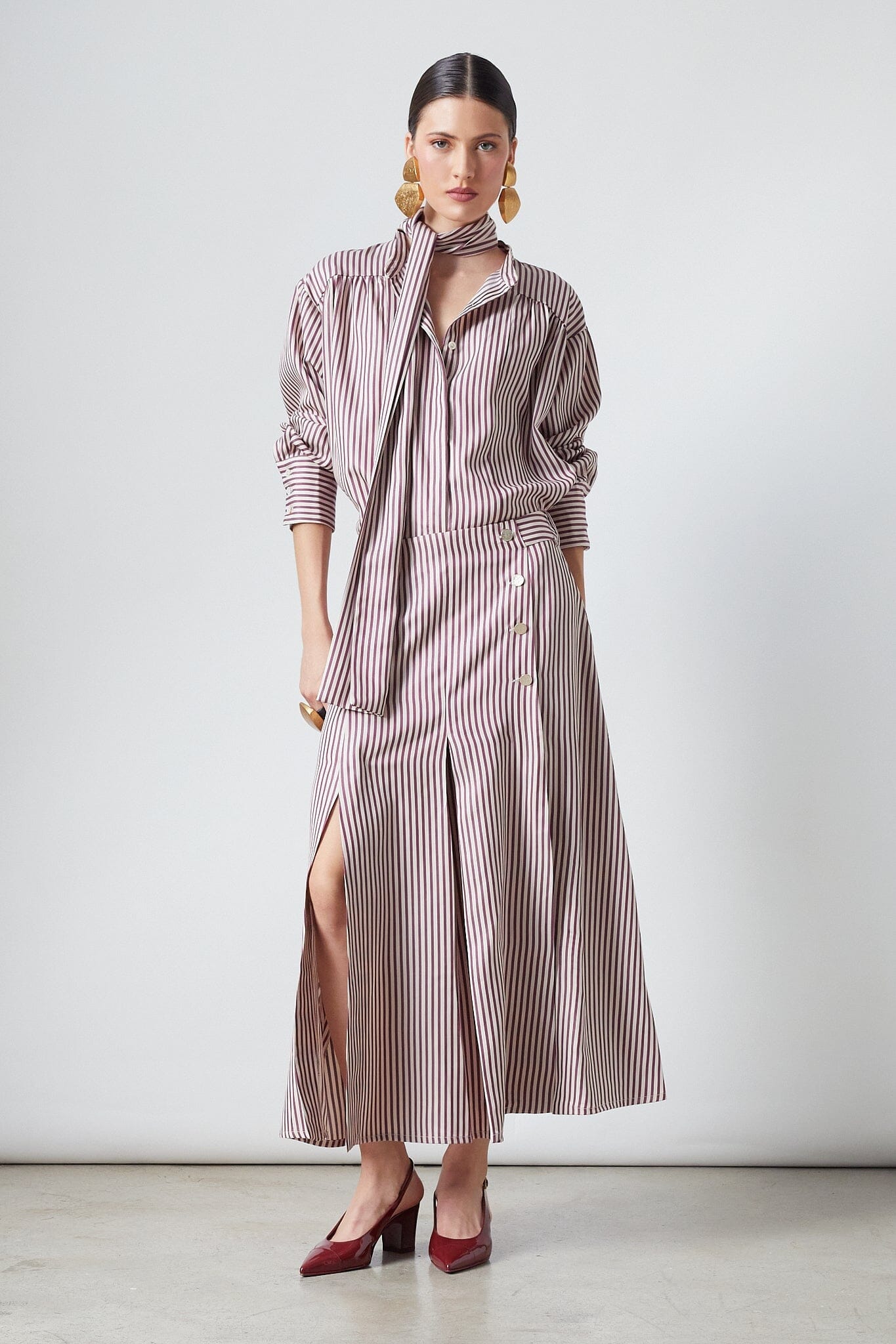 Esta camisa de rayas color vino de manga larga presenta puños anchos y un detalle de encaje que permite infinitas posibilidades de estilo. La prenda versátil perfecta para realzar tus looks.