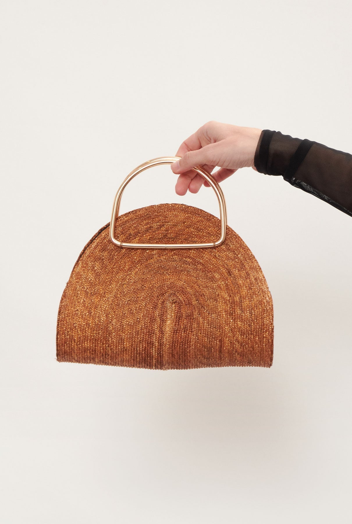 Clutch fabricado en paja de trigo de 4-5 mm cosido a mano en España, forrado en seda, con dos asas de metal. Posibilidad de otros colores. Diseñado por Nana Golmar