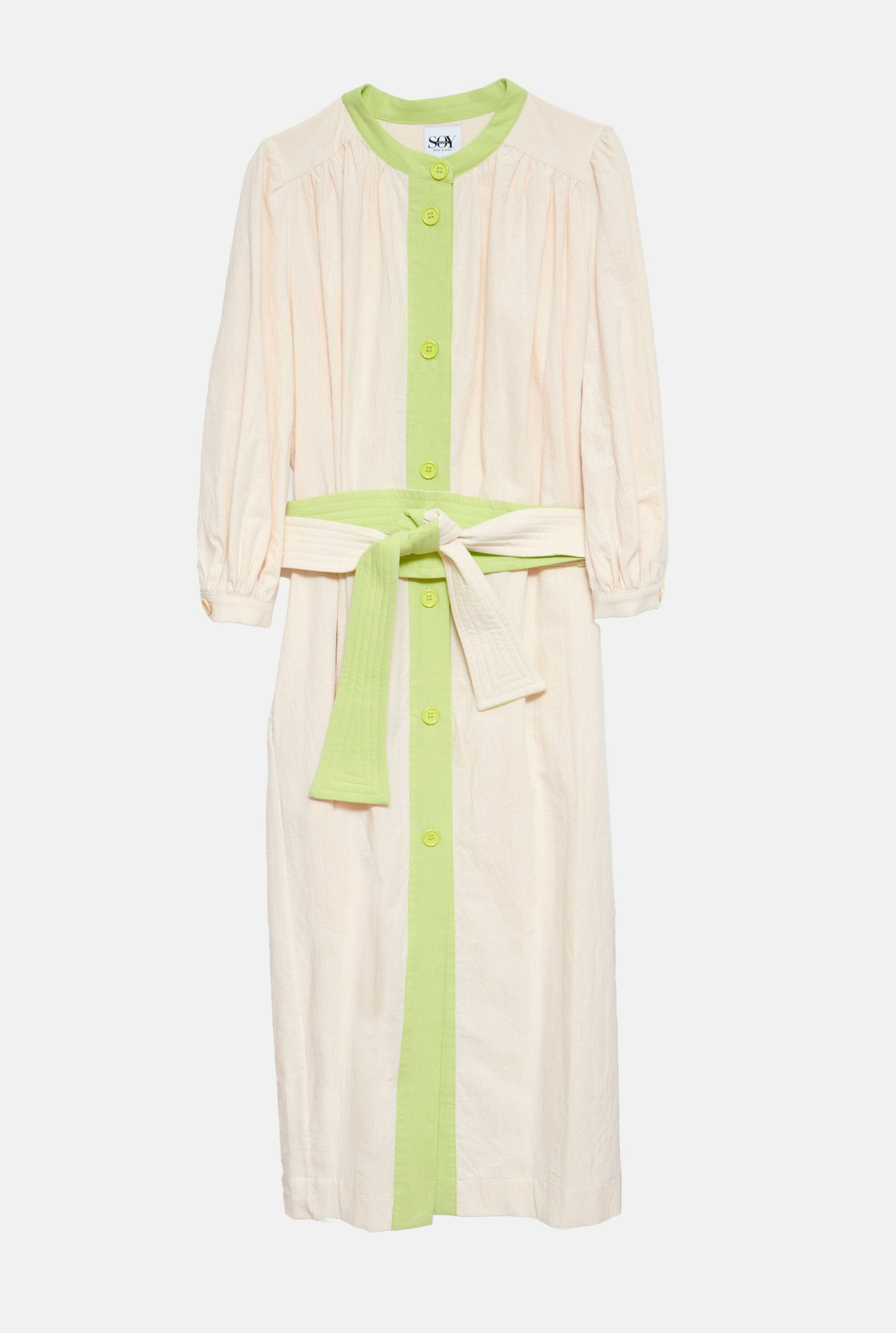 Vestido midi con abertura central de arriba abajo y 7 botones. Mangas largas con puños ajustados a la muñeca y abrochados con botón. Vestido versátil para cualquier ocasión.