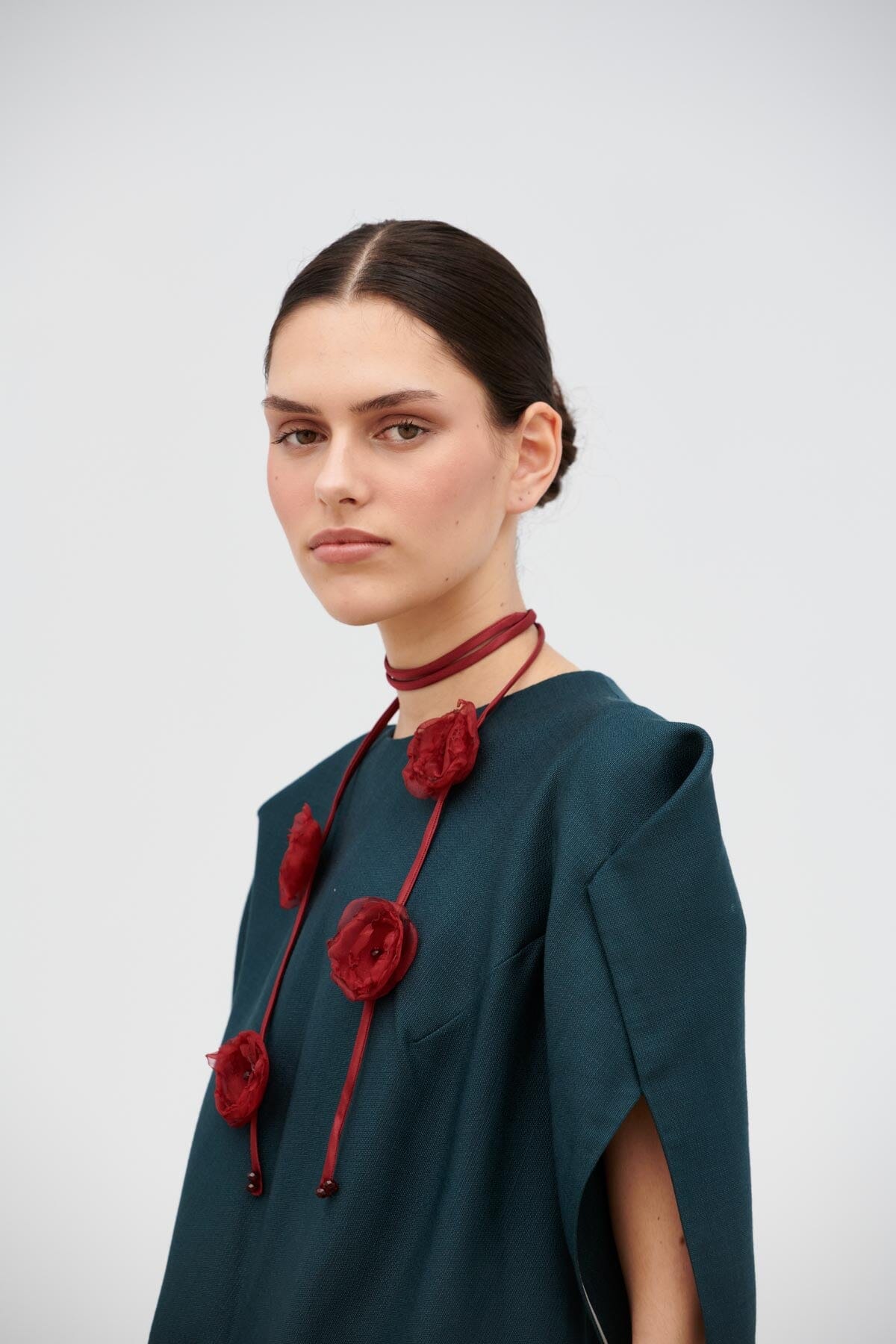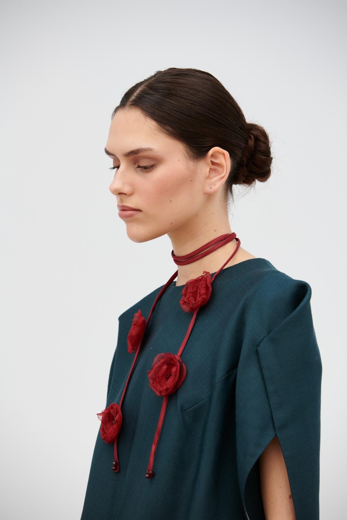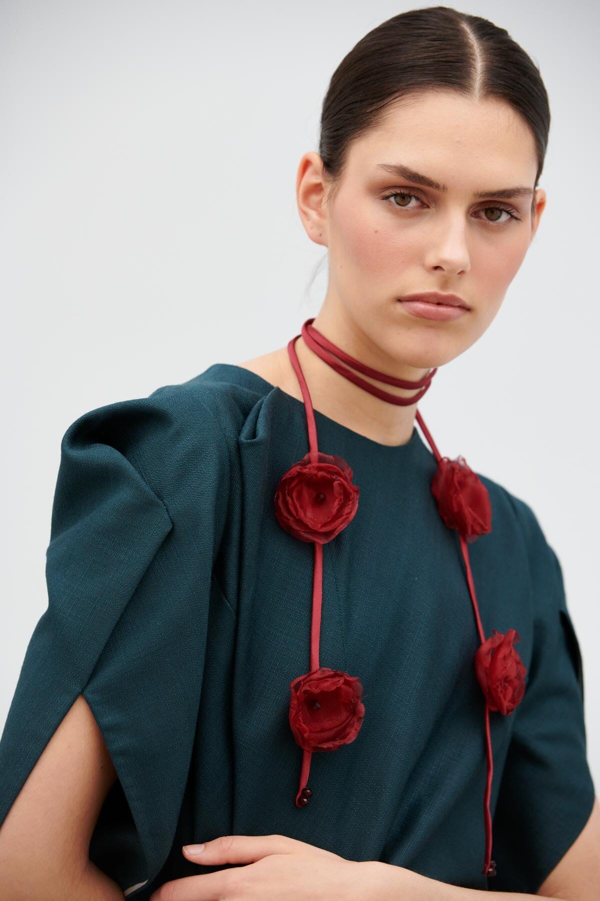 Collar de satén hecho a mano con flores de organza y detalles de diamantes de imitación a juego.