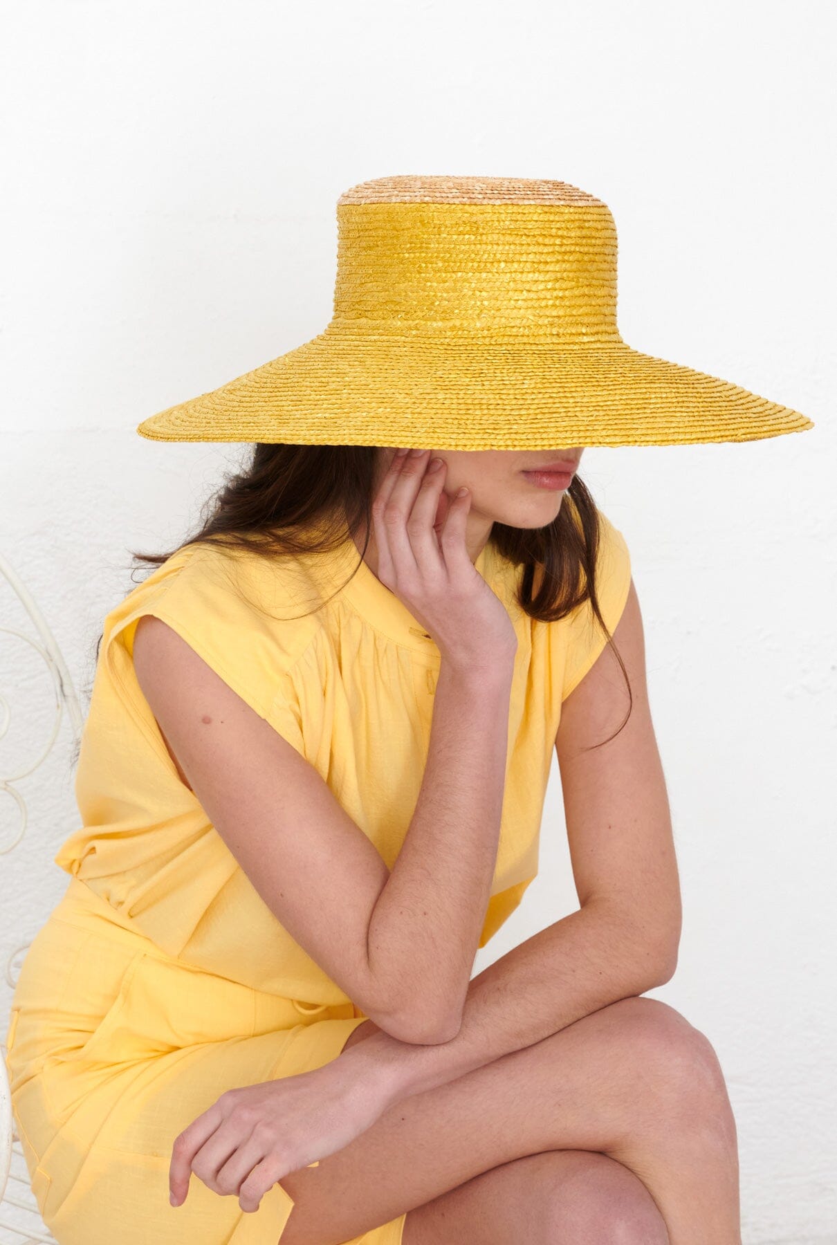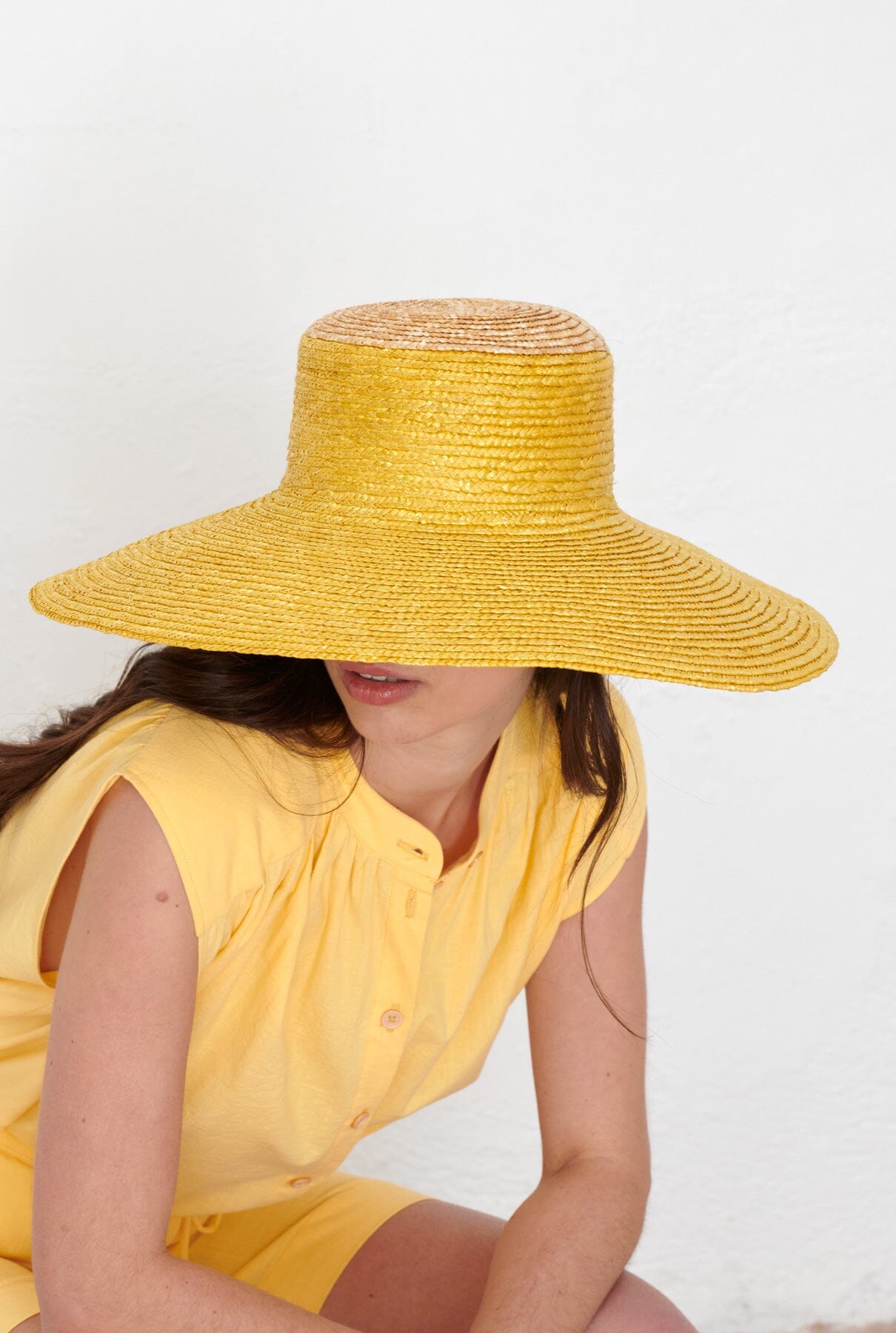 Sombrero de copa alta y recta, con ala ancha. Fabricado en paja de trigo teñida de amarillo.