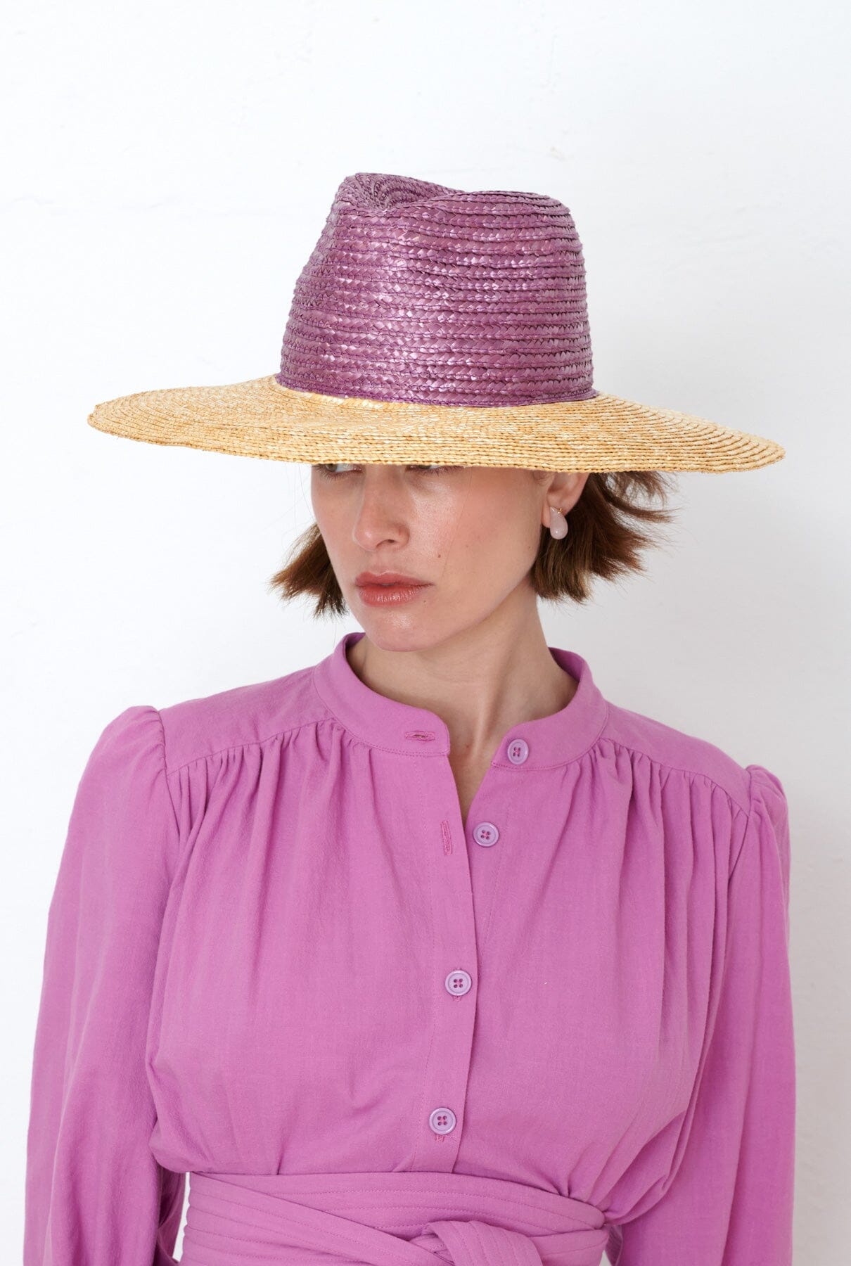 Sombrero de ala ancha y copa alta con una muesca característica. Perfecto para un look elegante o para realzar un look de diario. Hecho de paja de trigo teñida de morado en la copa y natural en el ala.