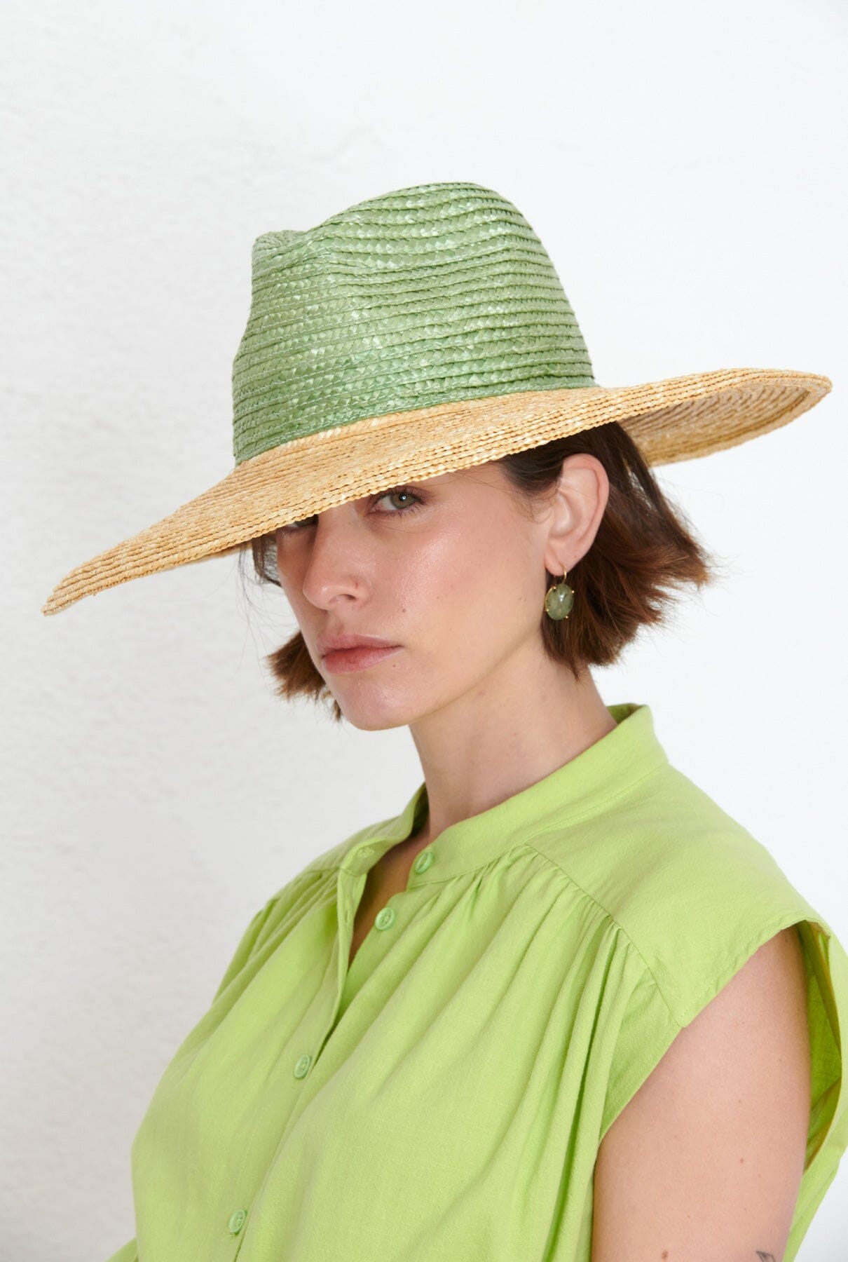 Sombrero de ala ancha y copa alta con una muesca característica. Perfecto para un look elegante o para realzar un look de diario. Hecho de paja de trigo teñida de verde en la copa y natural en el ala.