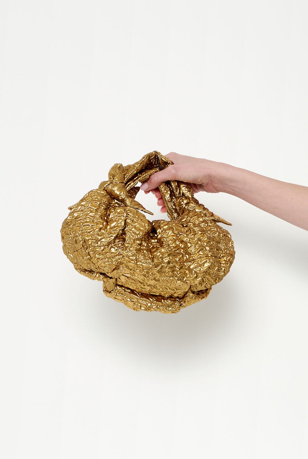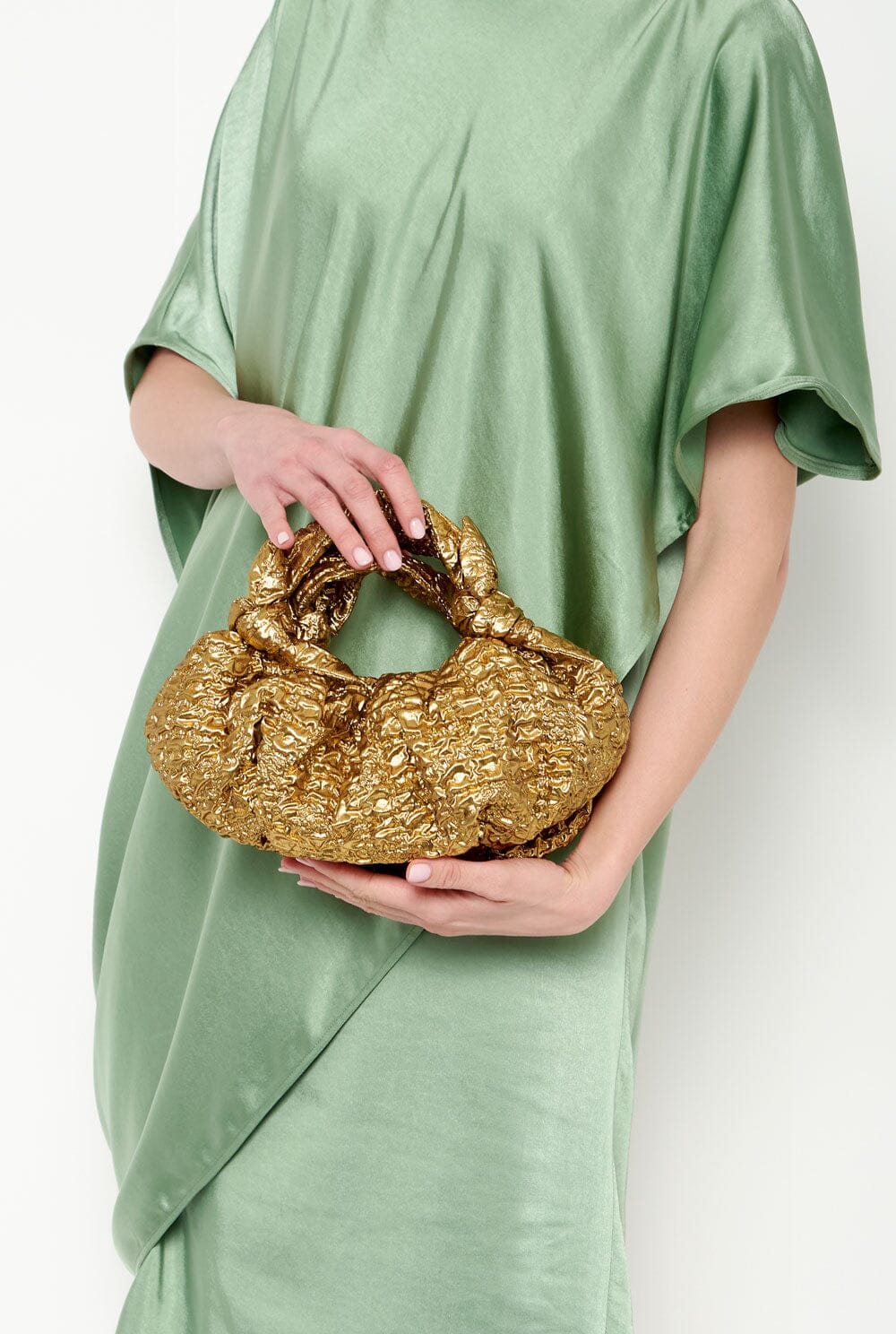 El bolso Bernatta está confeccionado en tejido lustroso y brillante. Es un pochette suave con asas anudadas y cierre de botón.