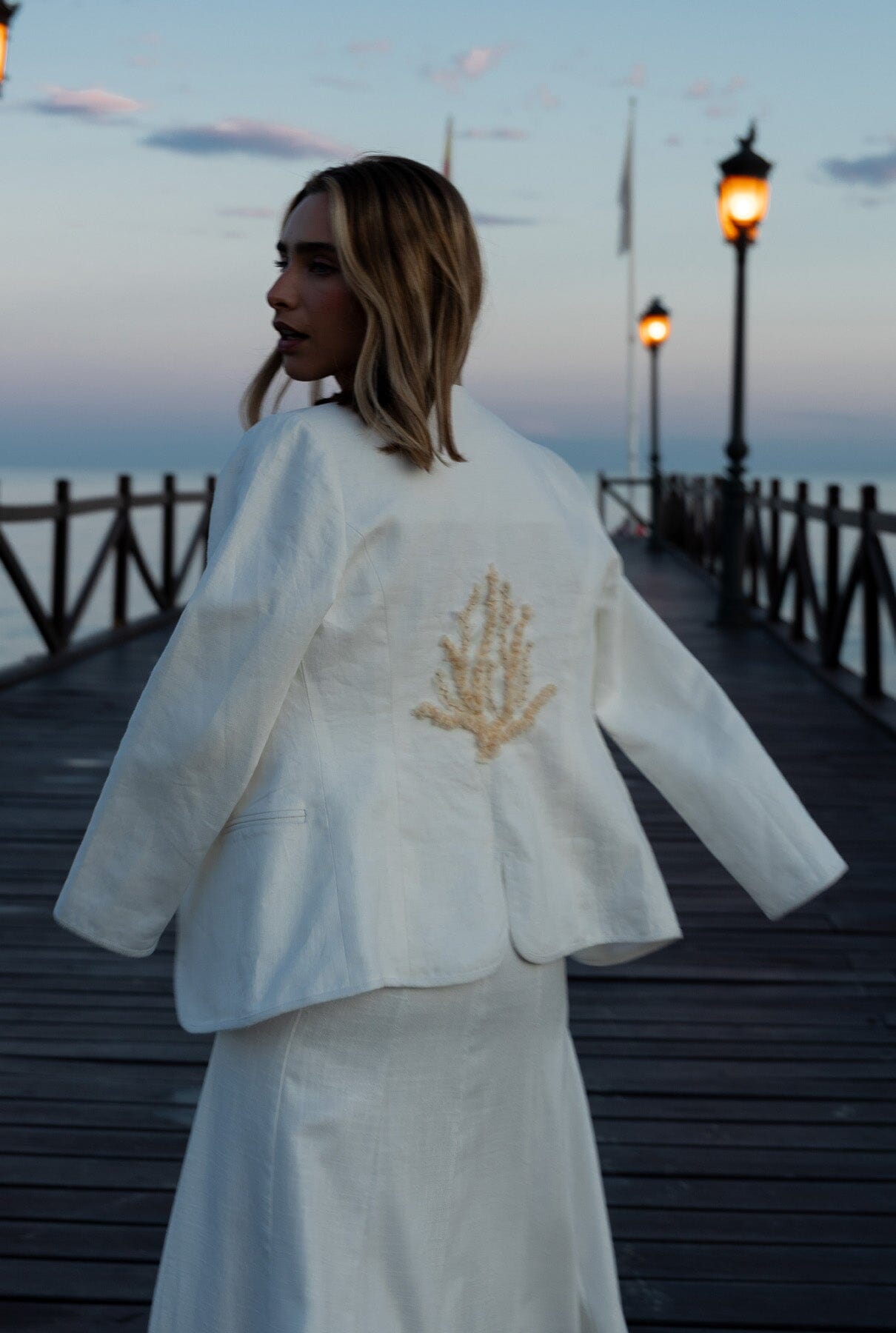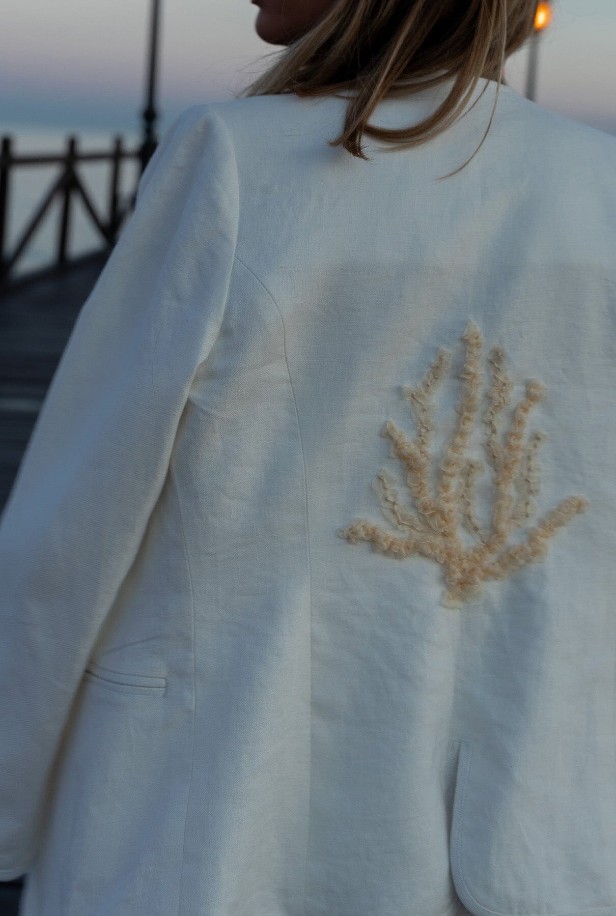 Esta chaqueta destaca por el detalle coral en la espalda, hecha a mano con organza.