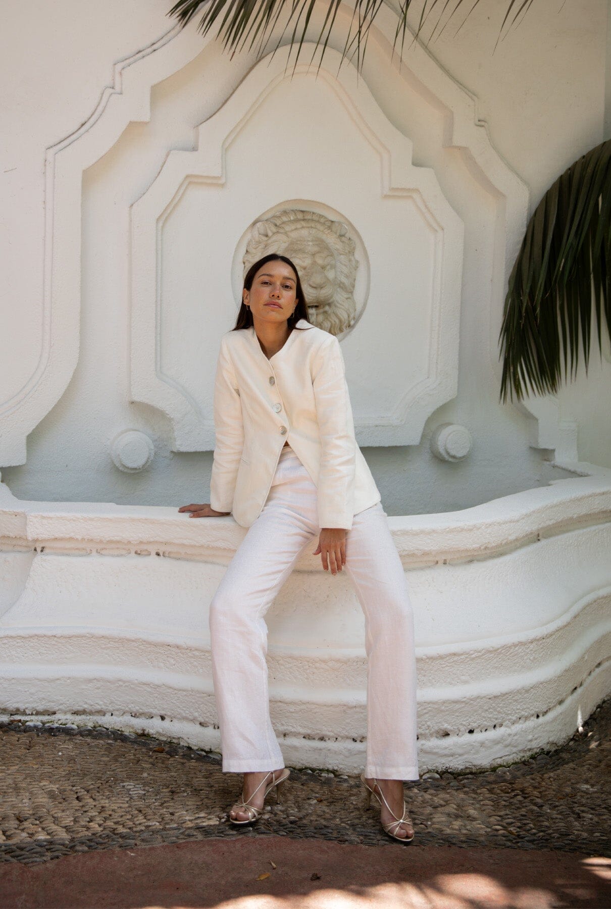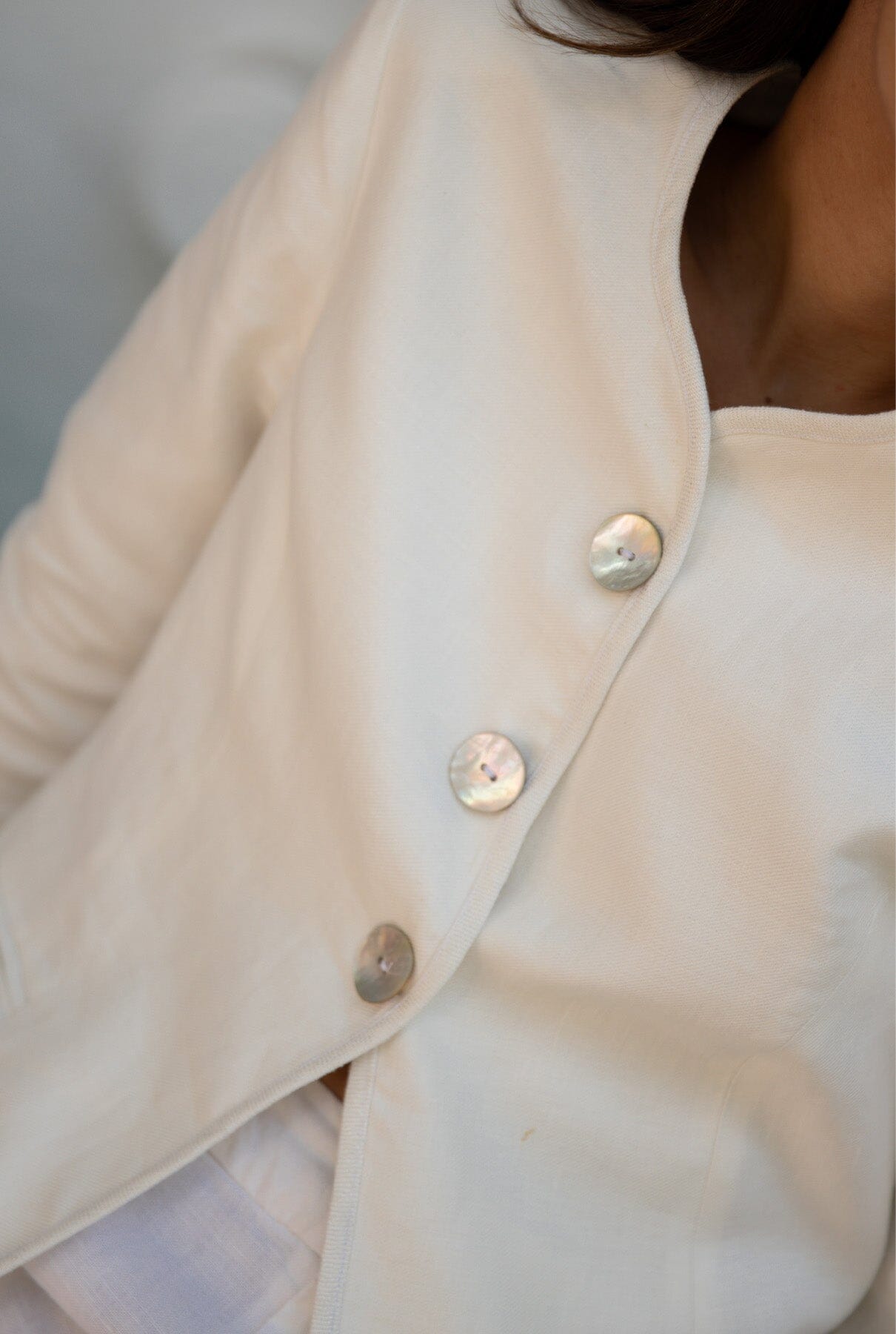 Chaqueta estilo austriaca confeccionada en lino 100% de máxima calidad. Esta chaqueta presenta tres botones de nácar y un color crudo con un ligero tono plateado.