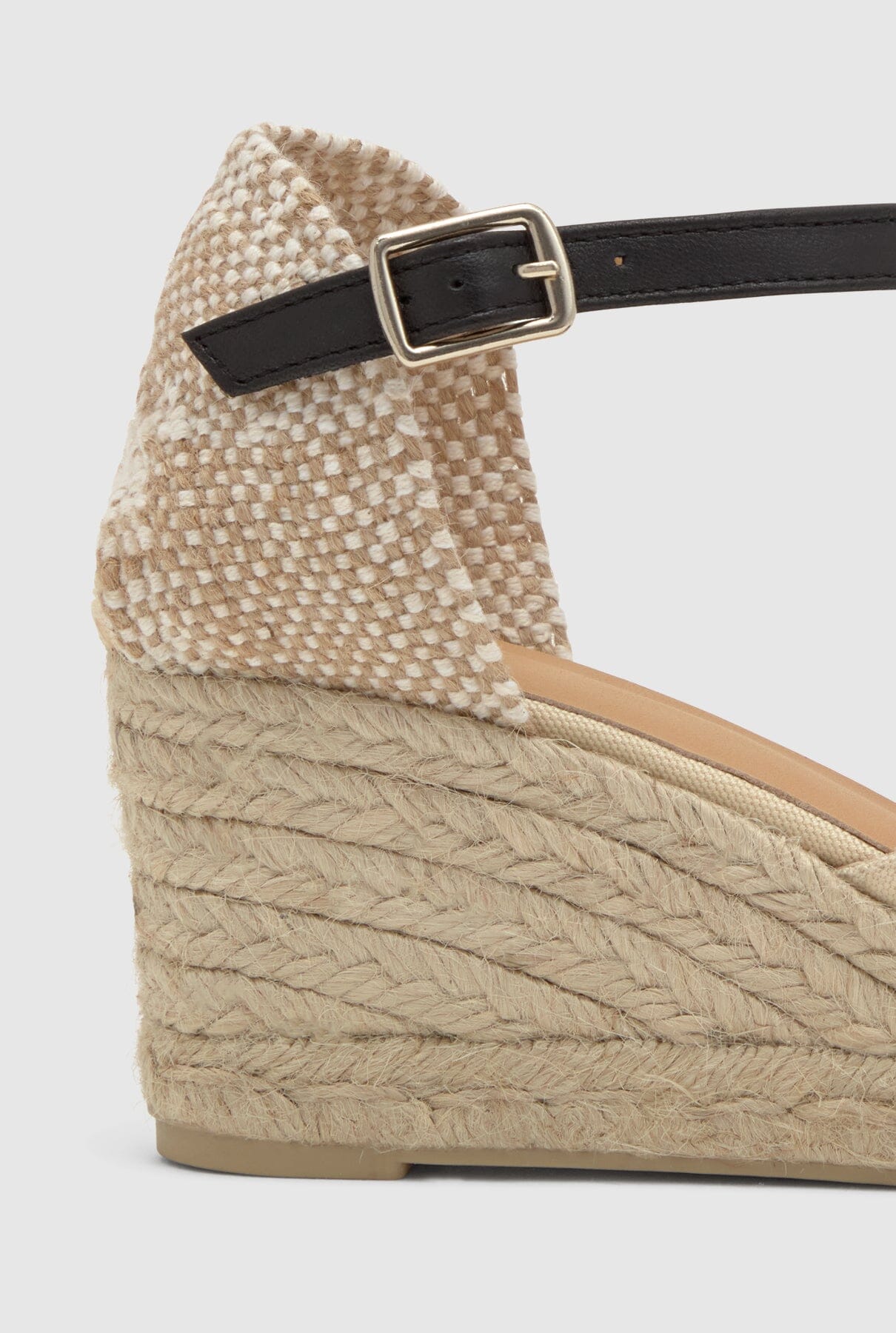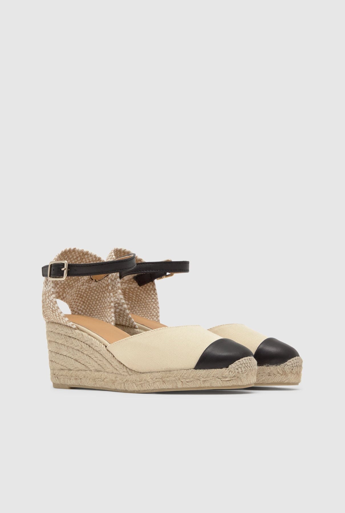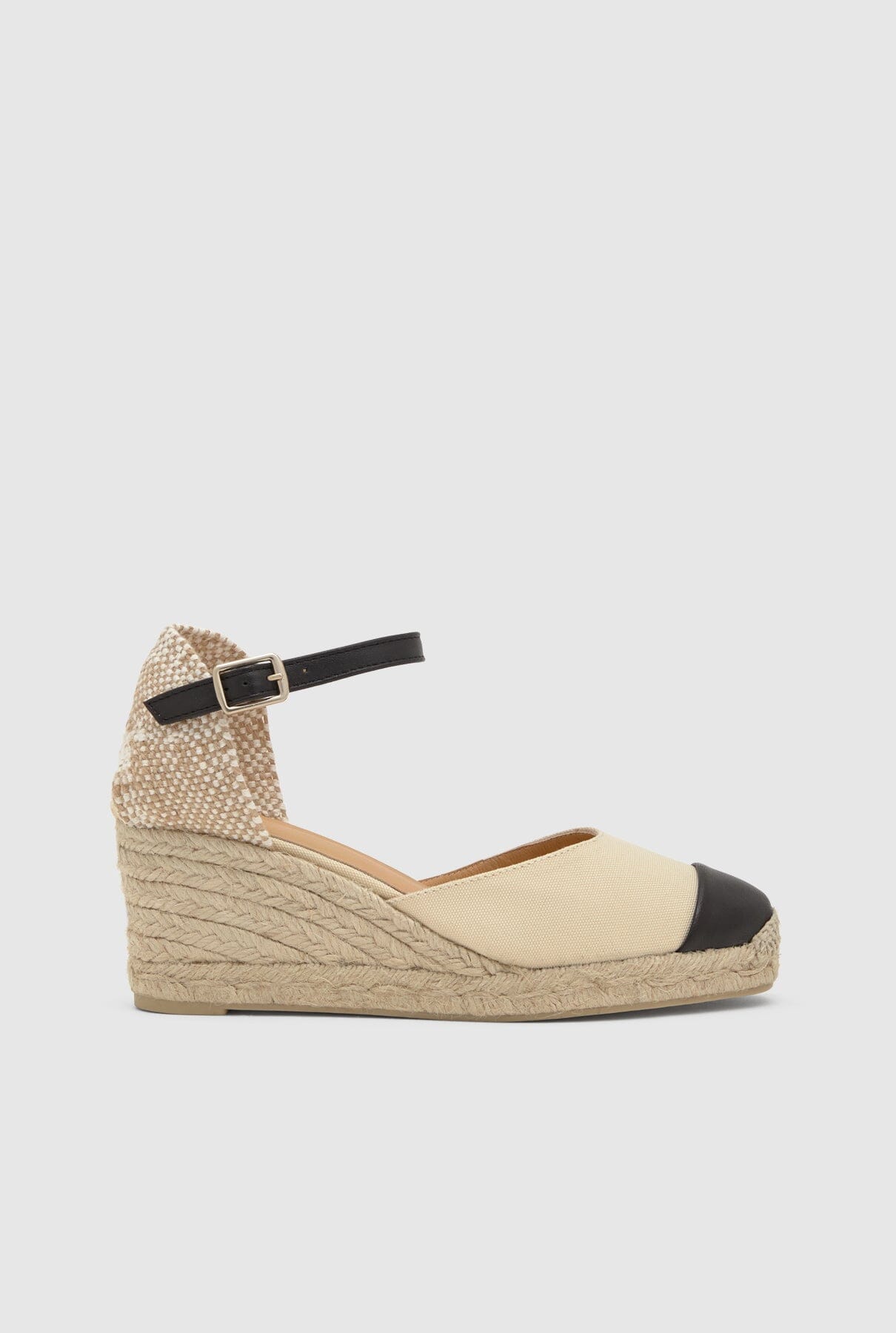 Alpargata coralina elaborada en algodón orgánico, con cierre de pulsera, puntera de piel, plantilla acolchada y cuña de yute de 7 cm.