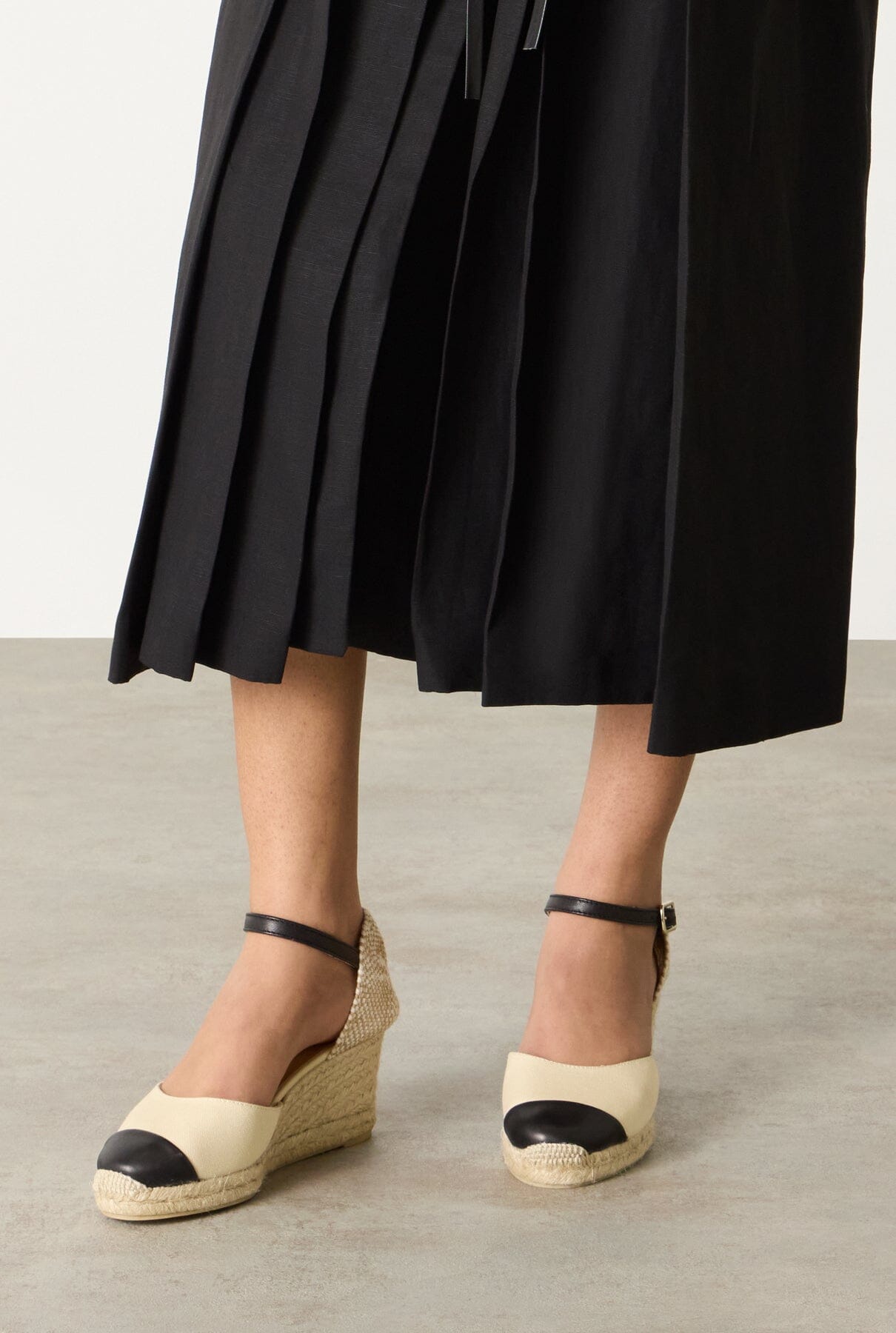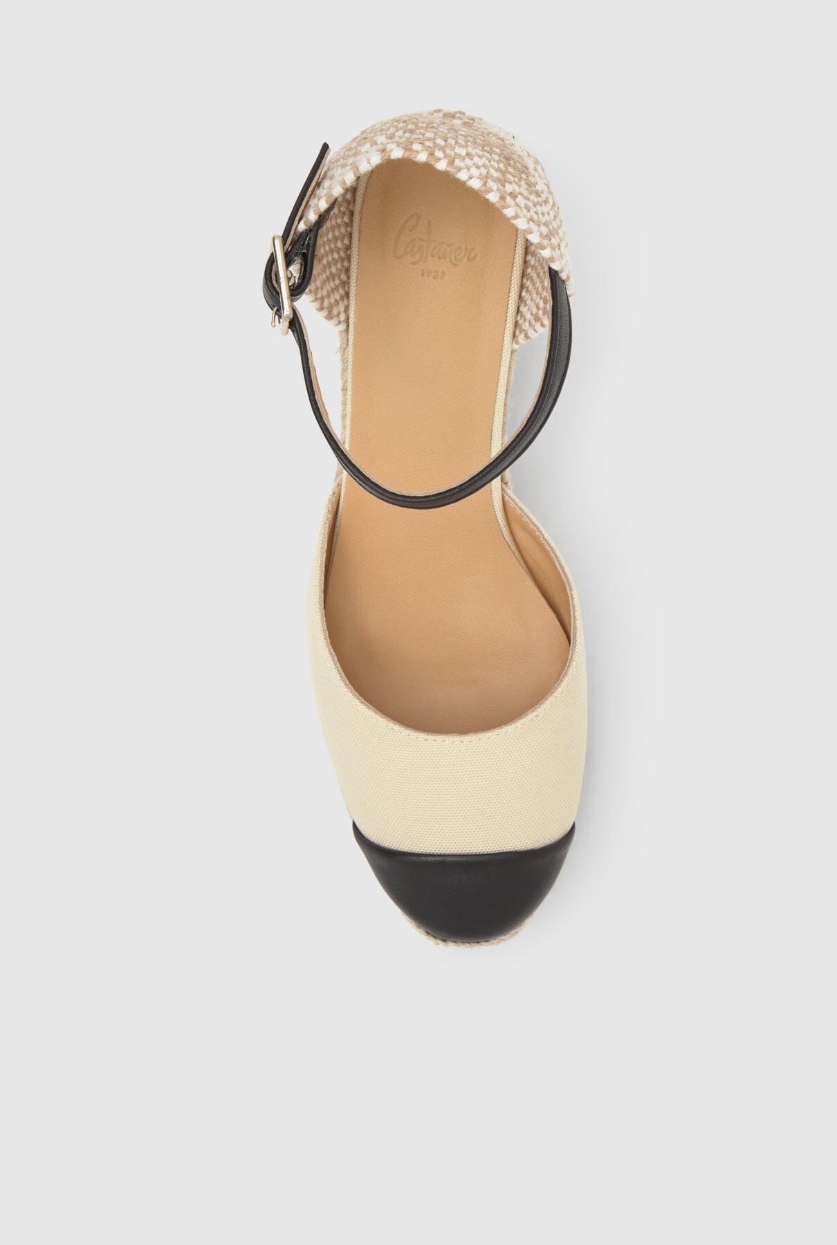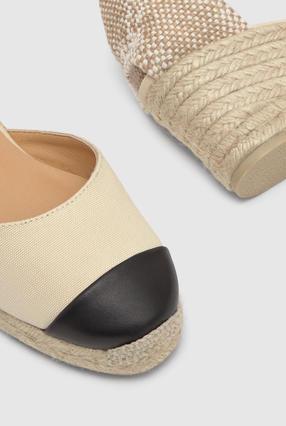 Alpargata coralina elaborada en algodón orgánico, con cierre de pulsera, puntera de piel, plantilla acolchada y cuña de yute de 7 cm.