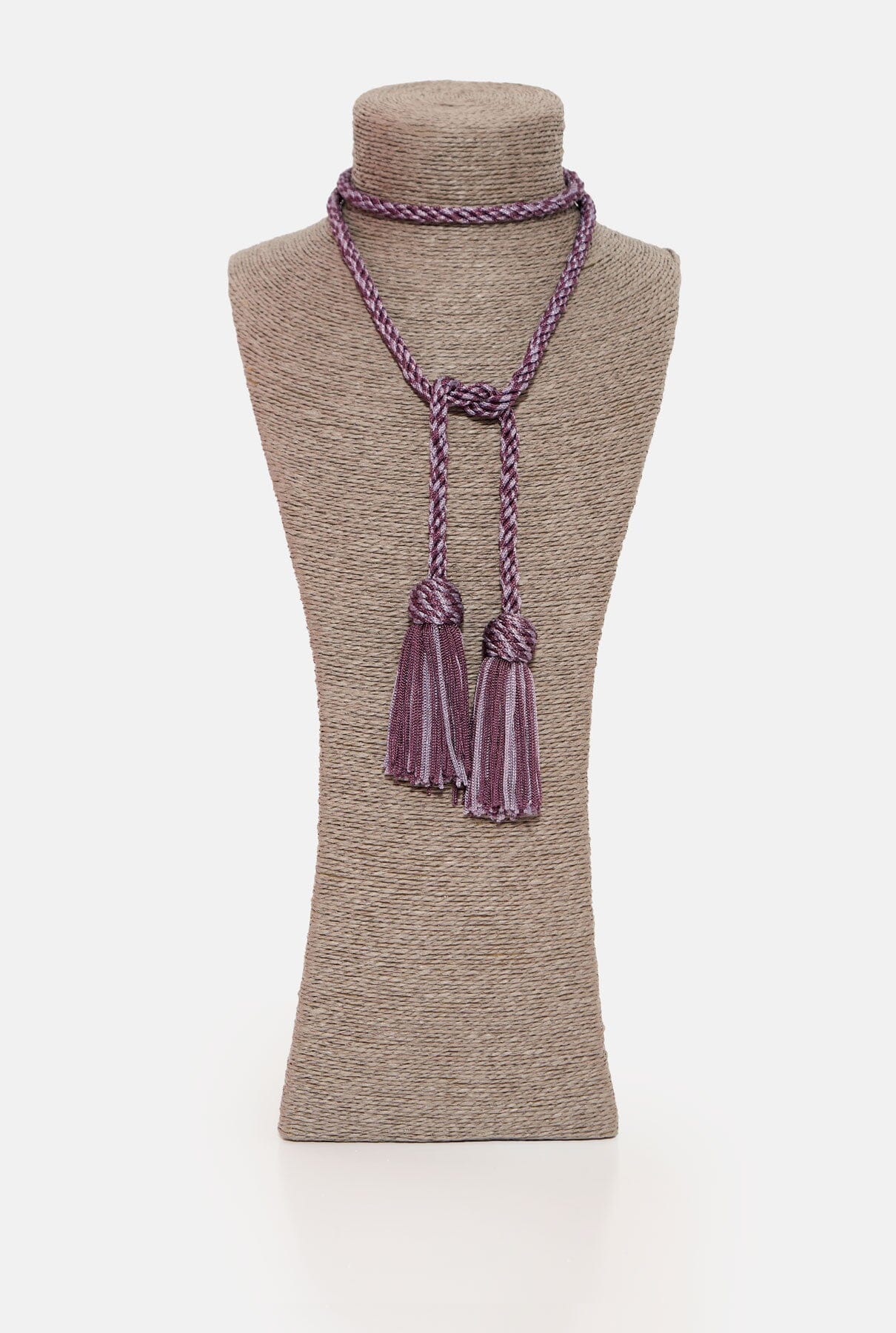Cordón de seda trenzado a mano con borlas en ambos extremos. Accesorio versátil que puede usarse como collar o cinturón.