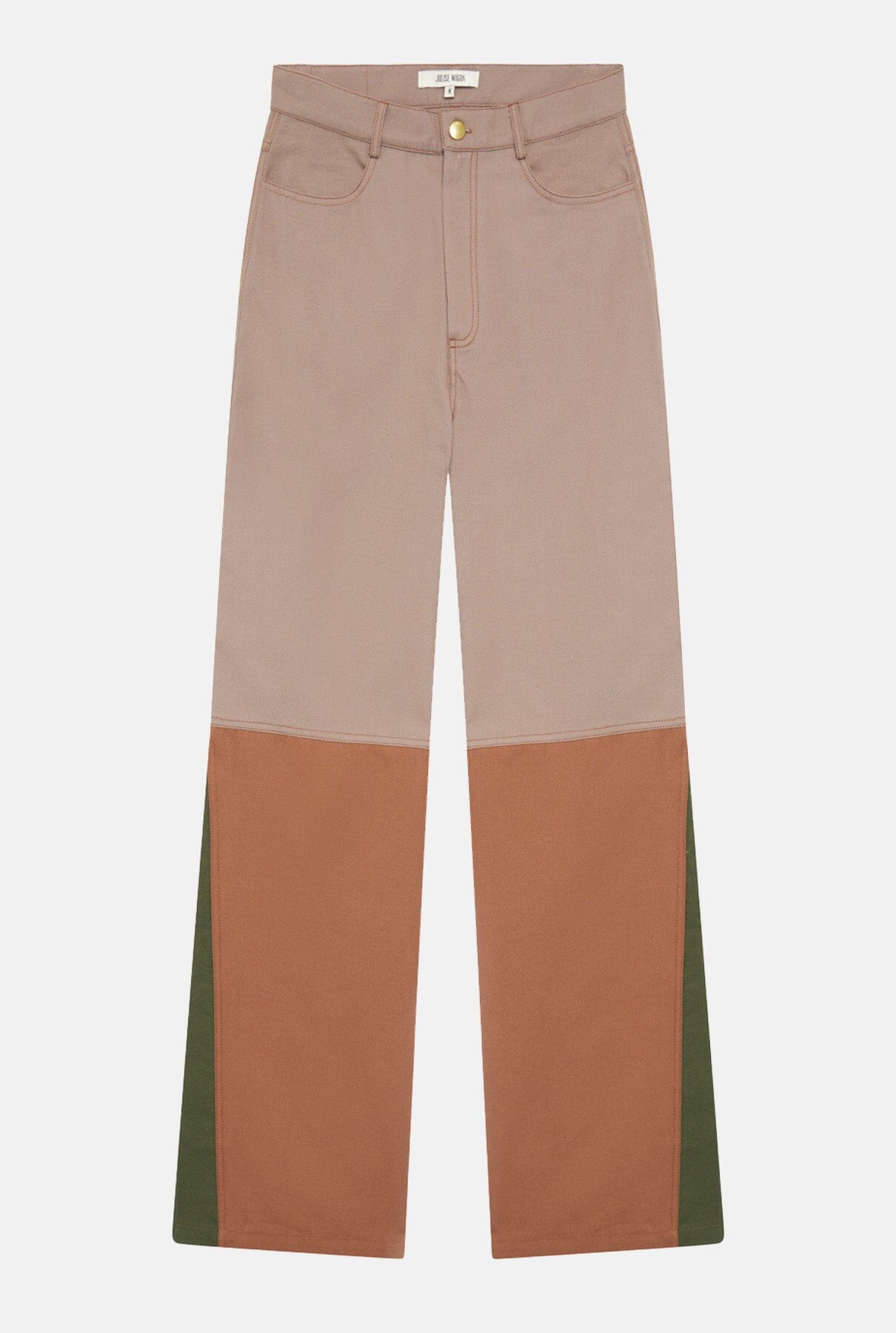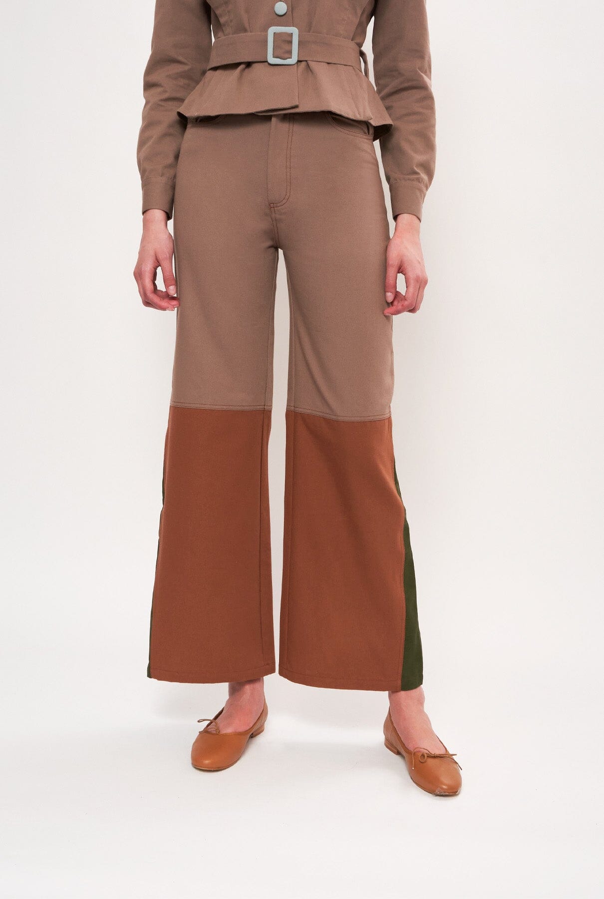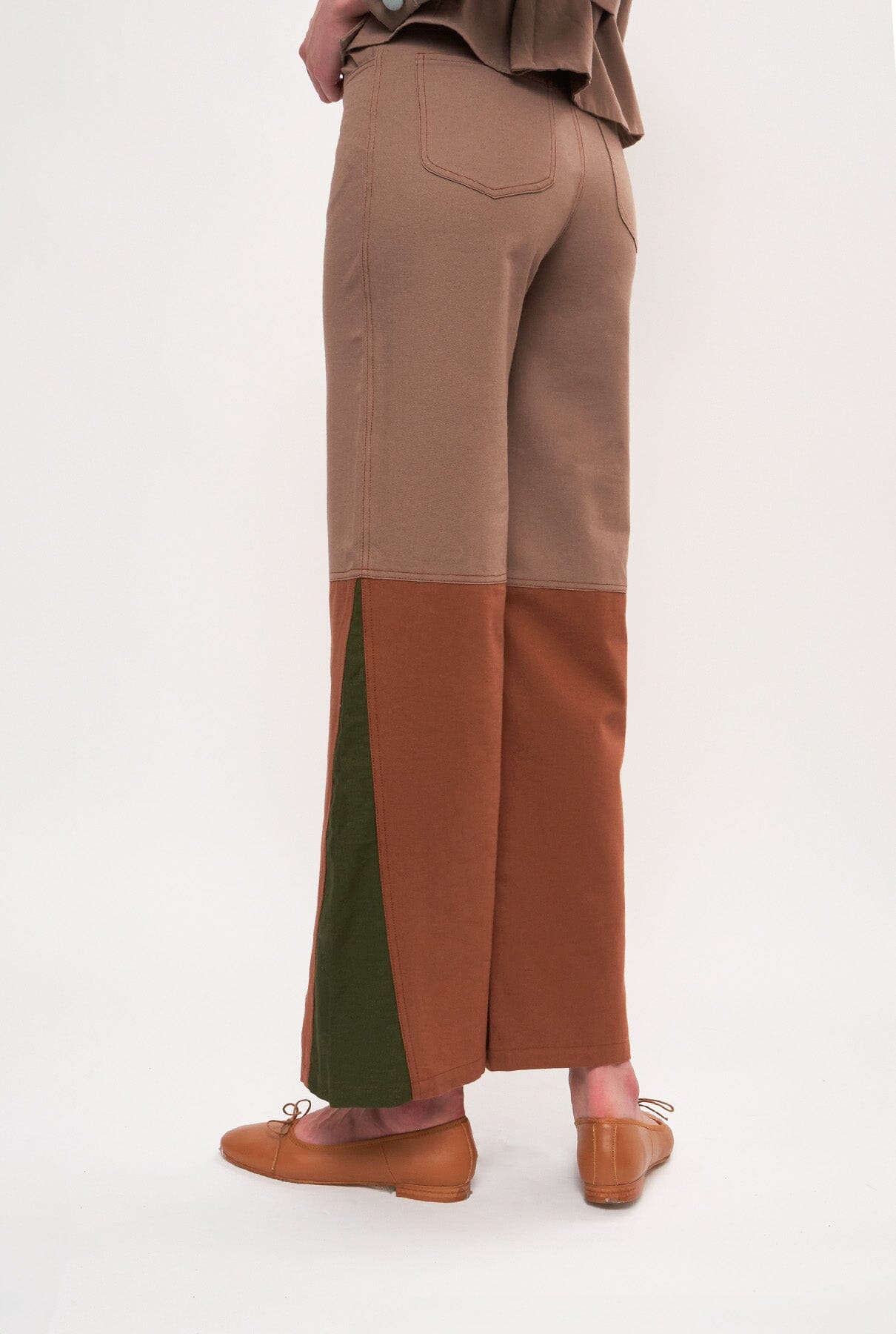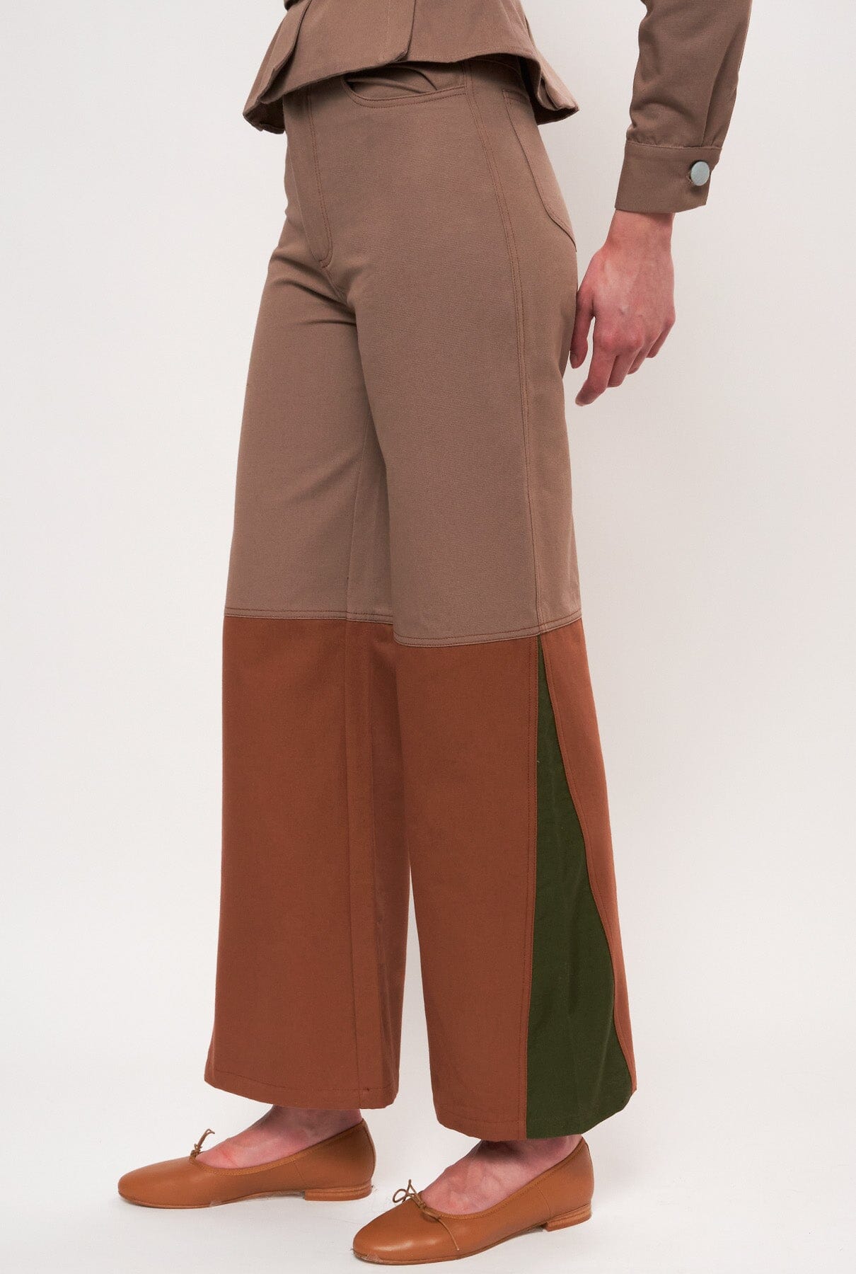 Nuestro icónico pantalón Coro con corte denim en lona de algodón combinando 3 tonos, uno en la parte superior, uno en la parte inferior y otro en la cuña lateral. En 2 combinaciones: Marrones y Azules.
