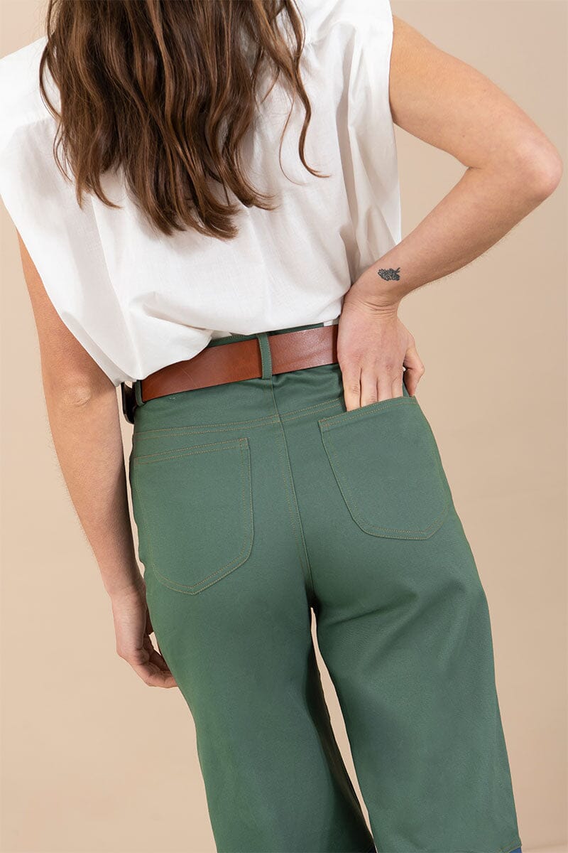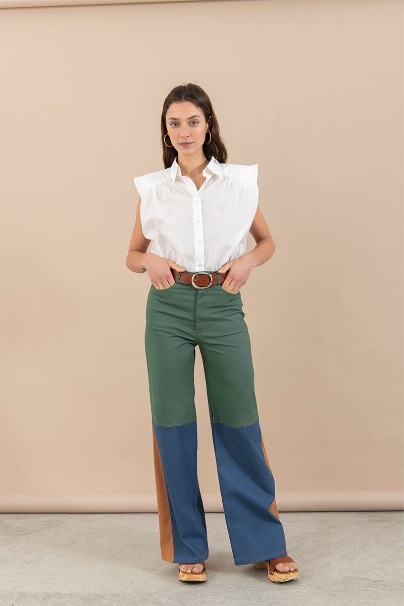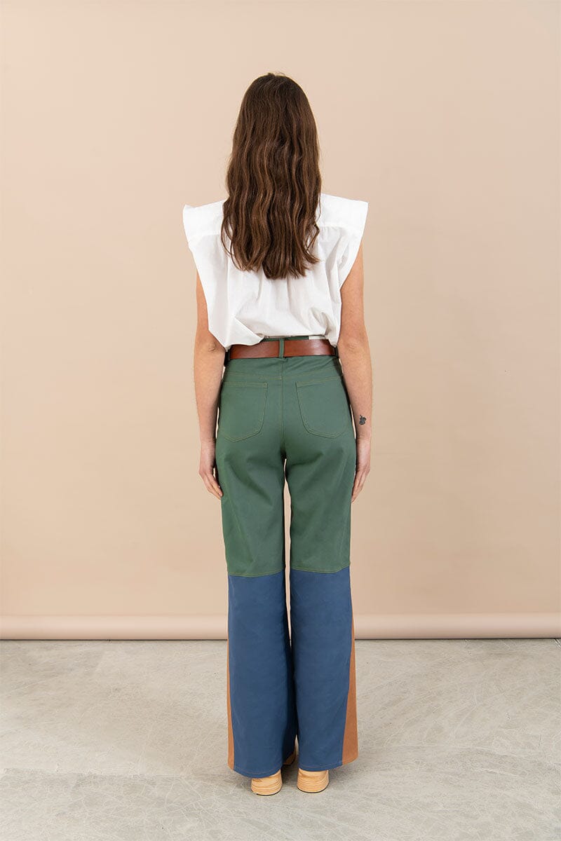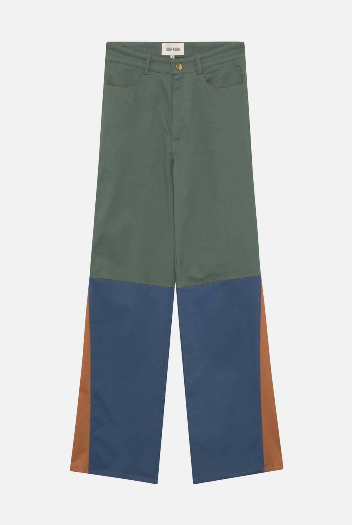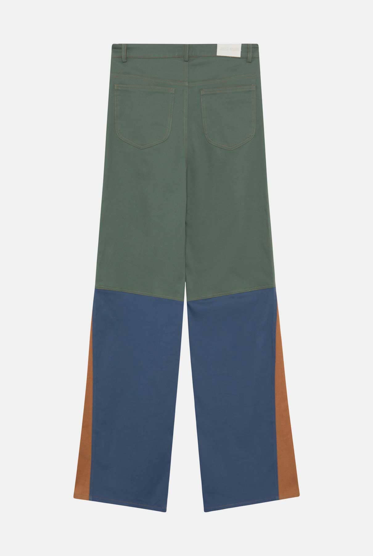 Pantalón de corte denim en tejido elástico y en 3 tonos: verde en la parte superior, azul en la parte inferior y cuña exterior color toffee.