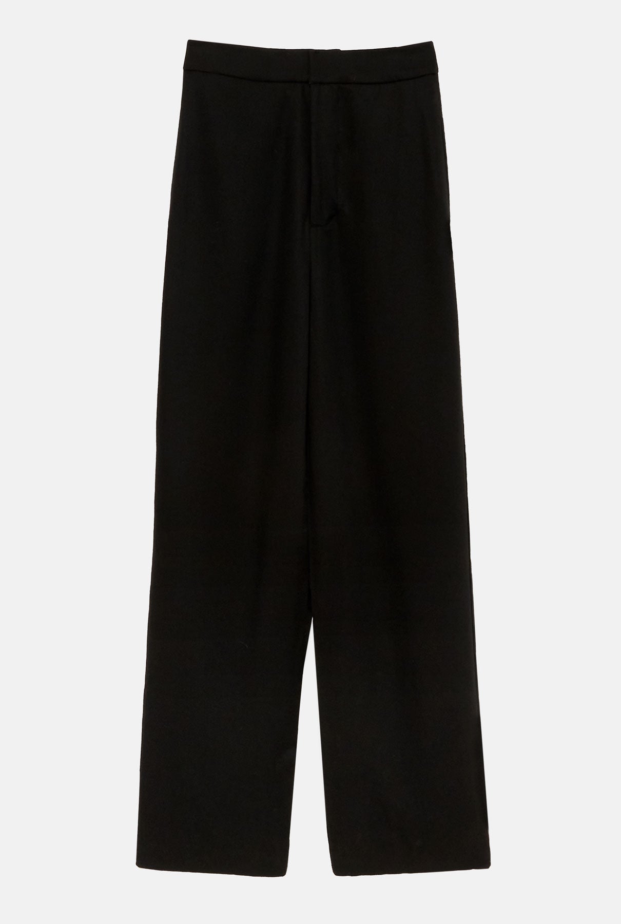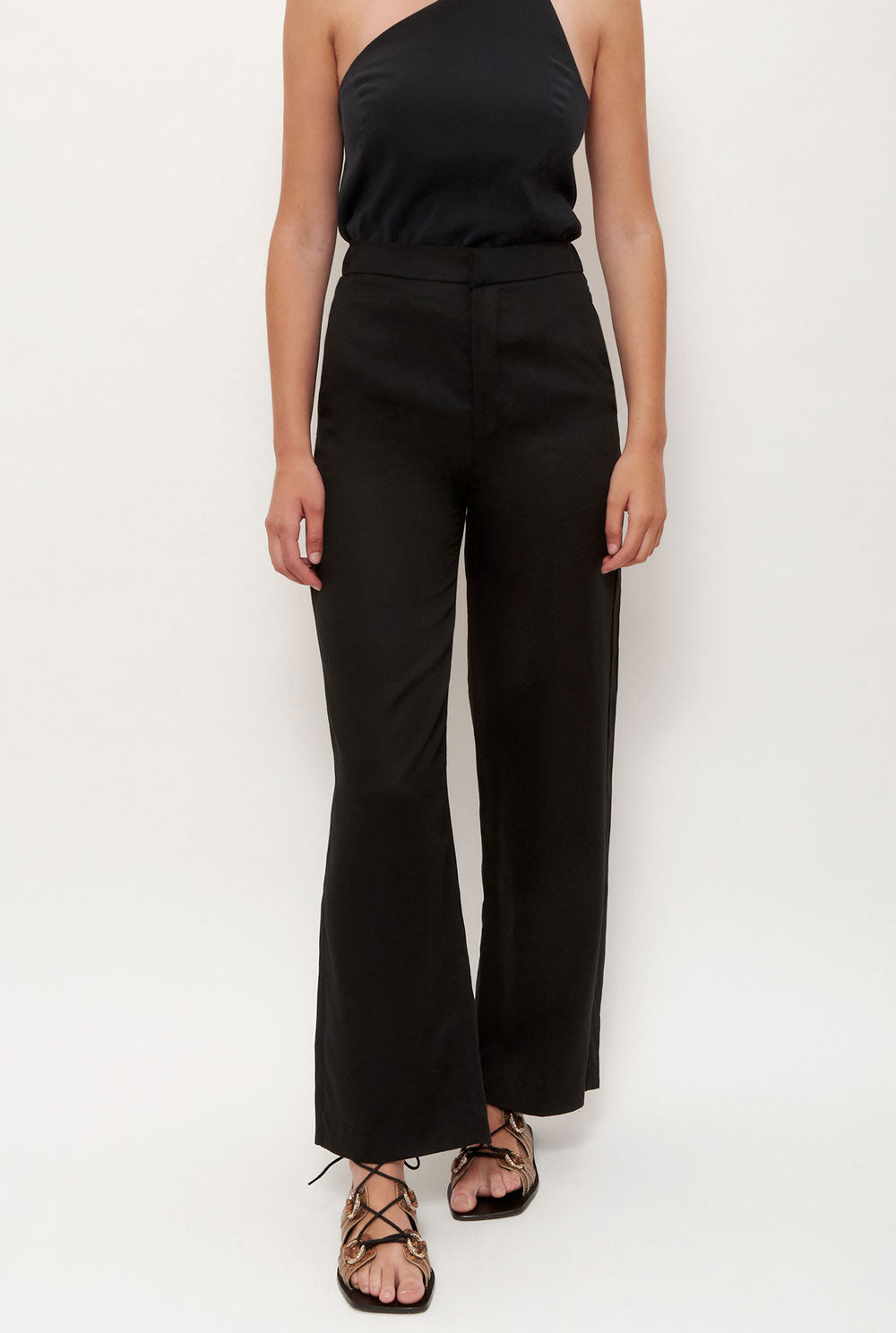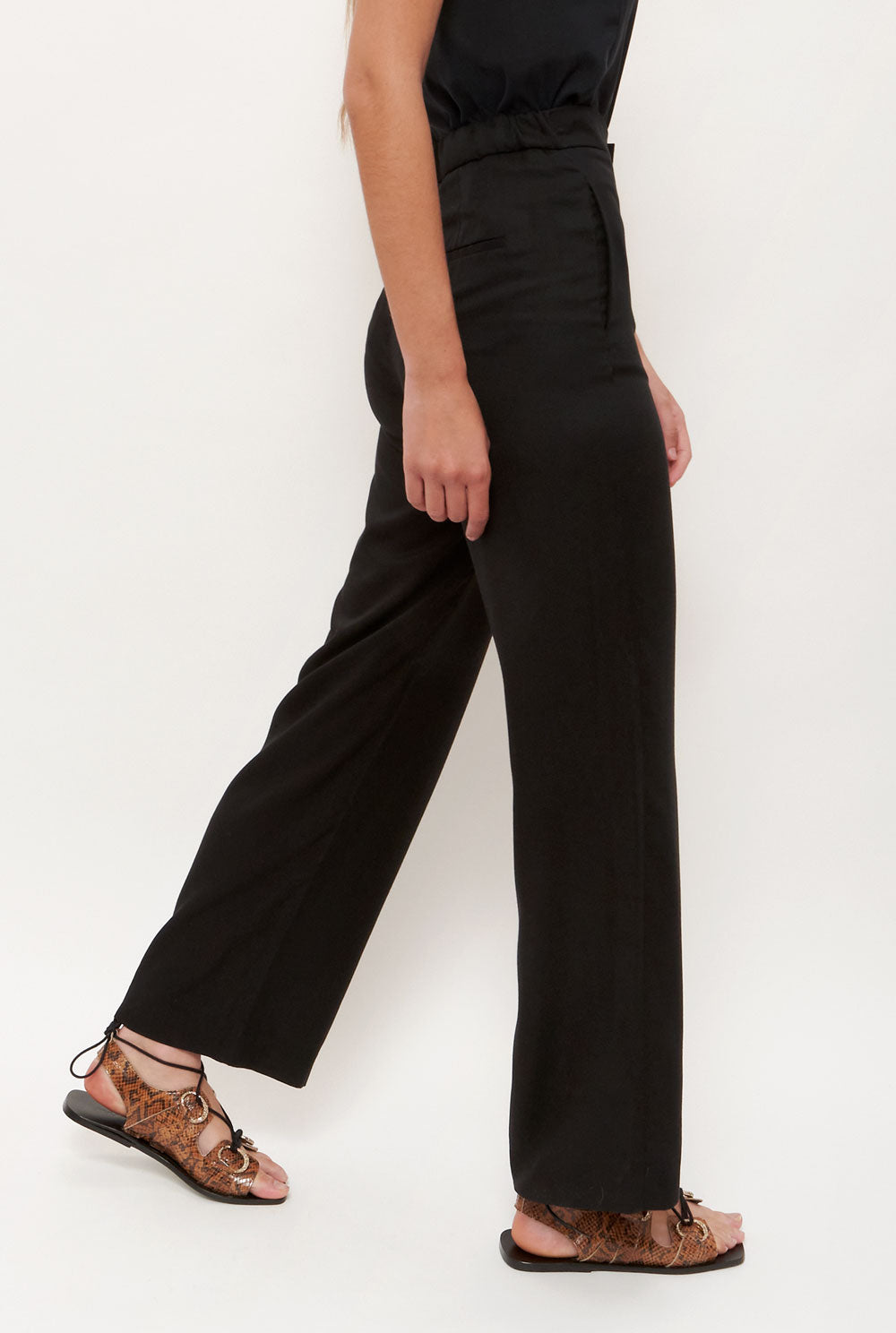 Pantalón de tiro alto de tencel negro. Bolsillos delanteros. Diseño de pierna ancha. Bragueta frontal con cremallera y corchete metálico.