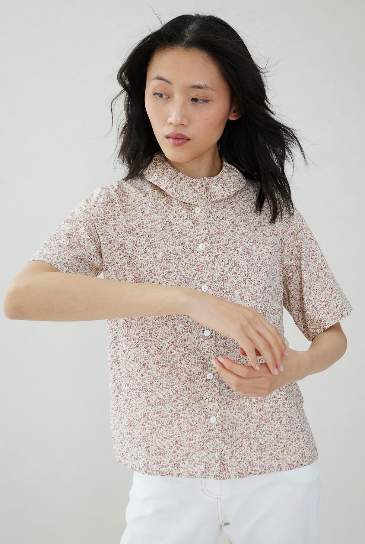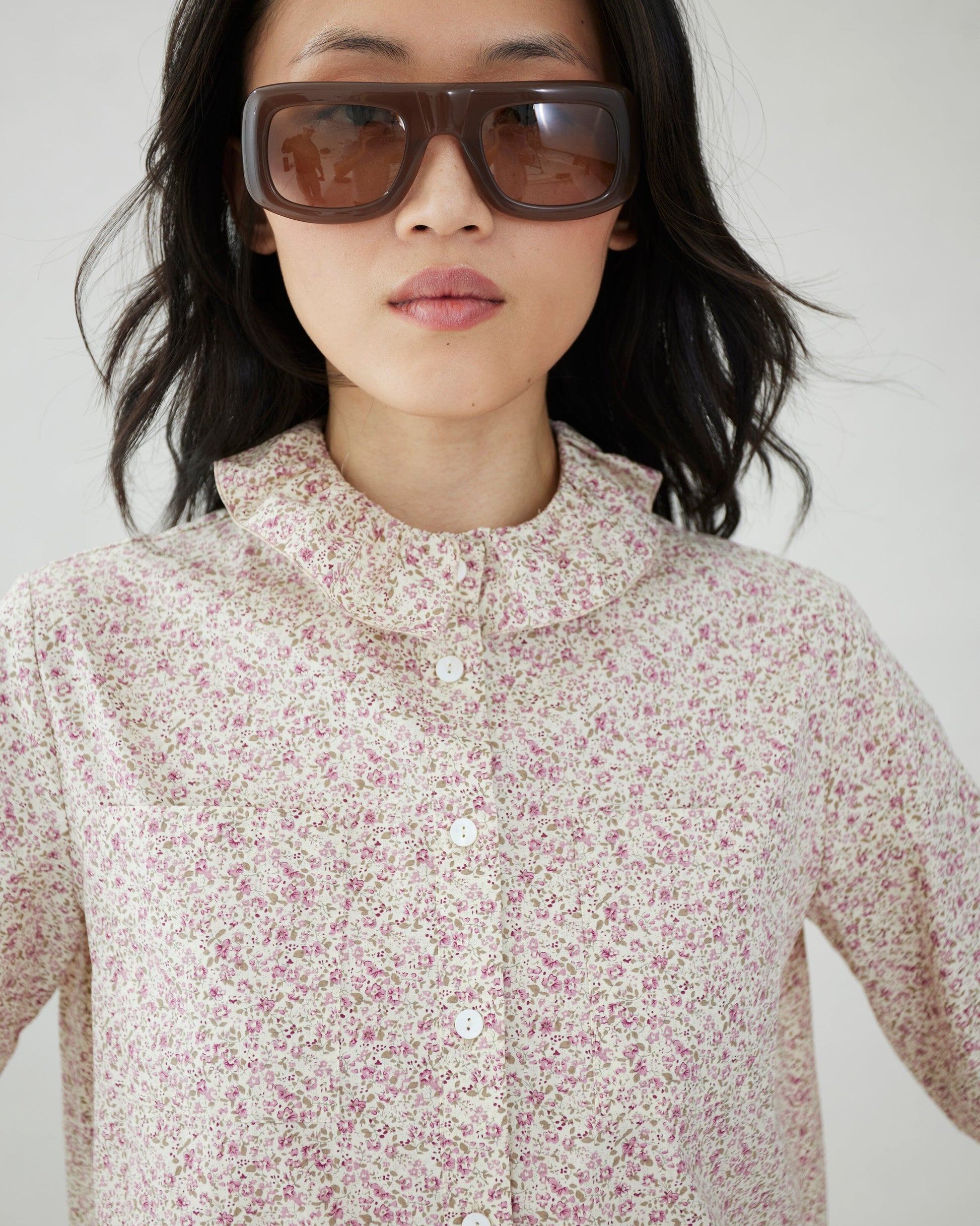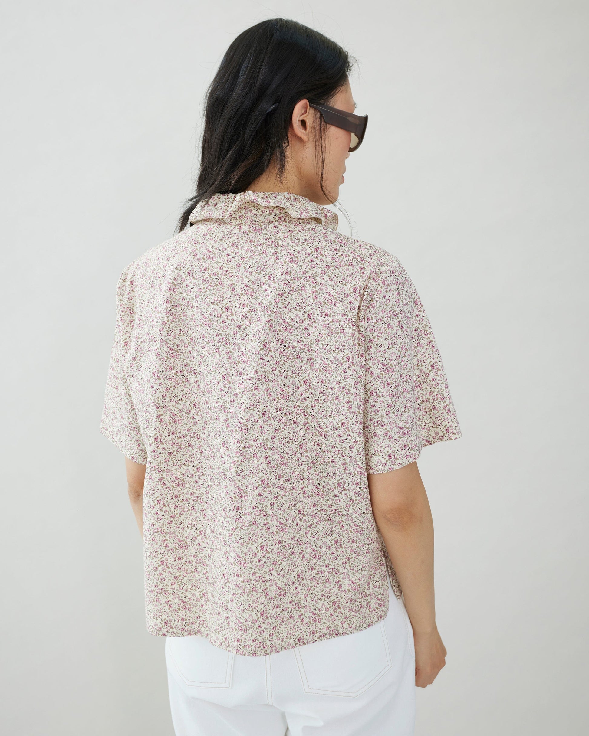 Lightweight cotton blouse with feminine detailing and a flattering silhouette with floral printed.