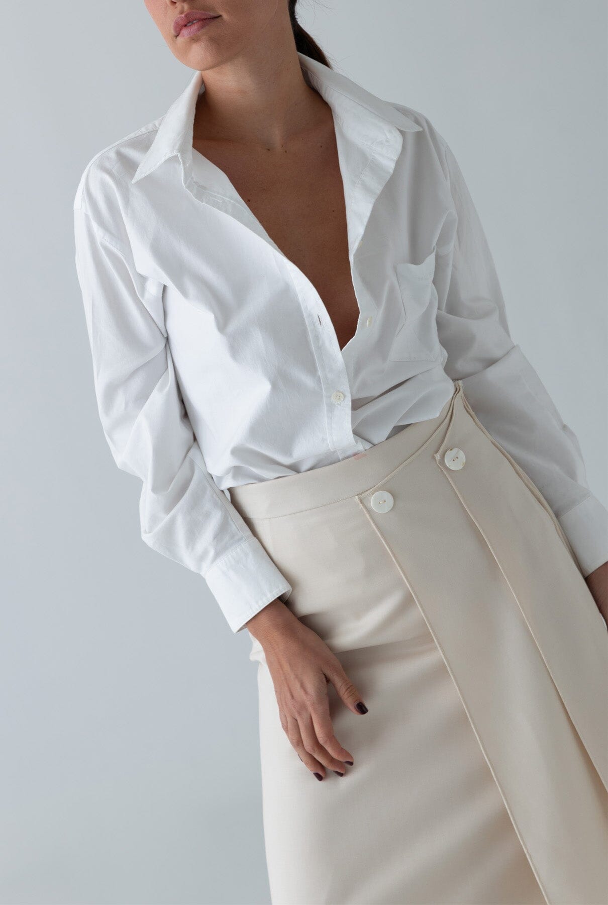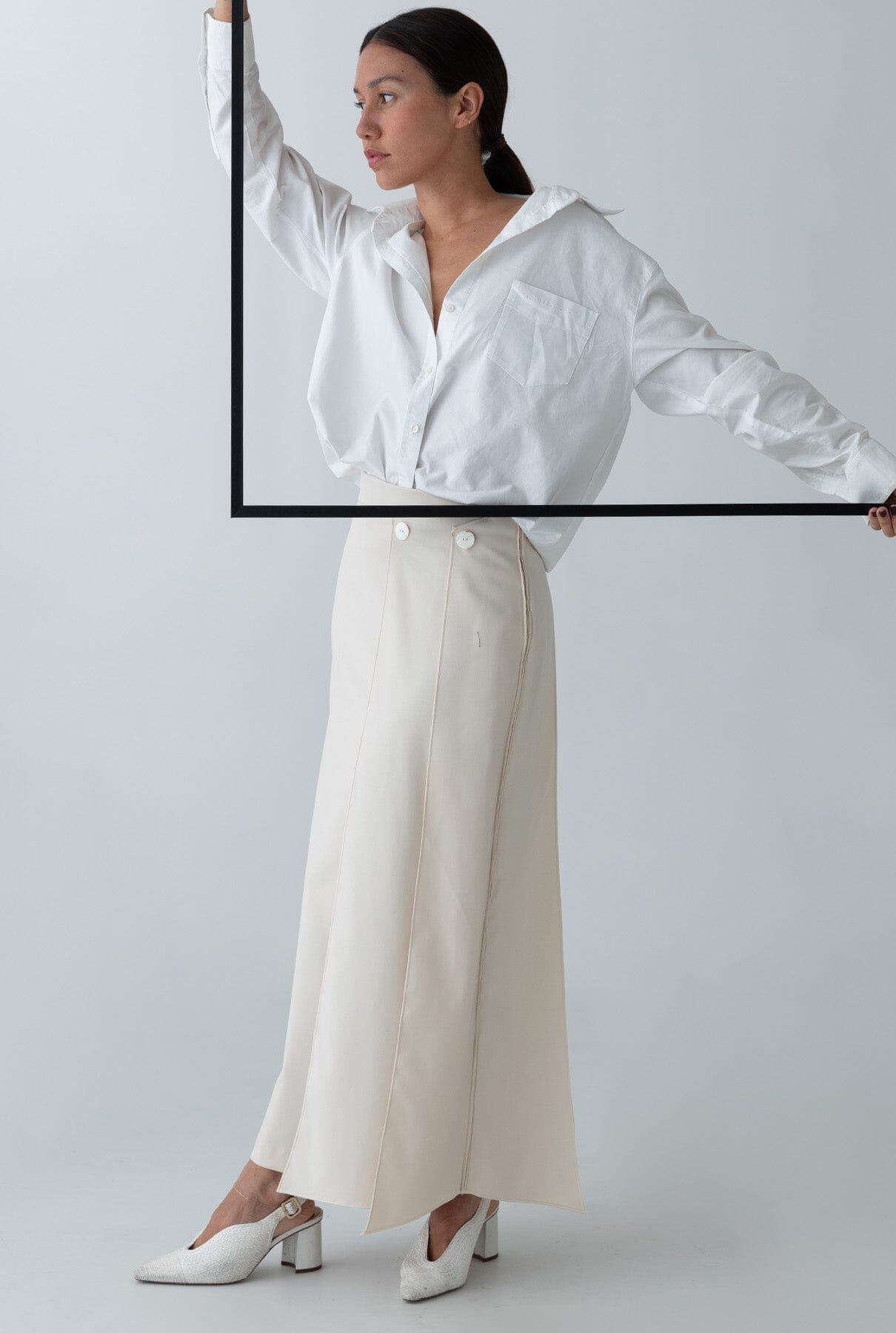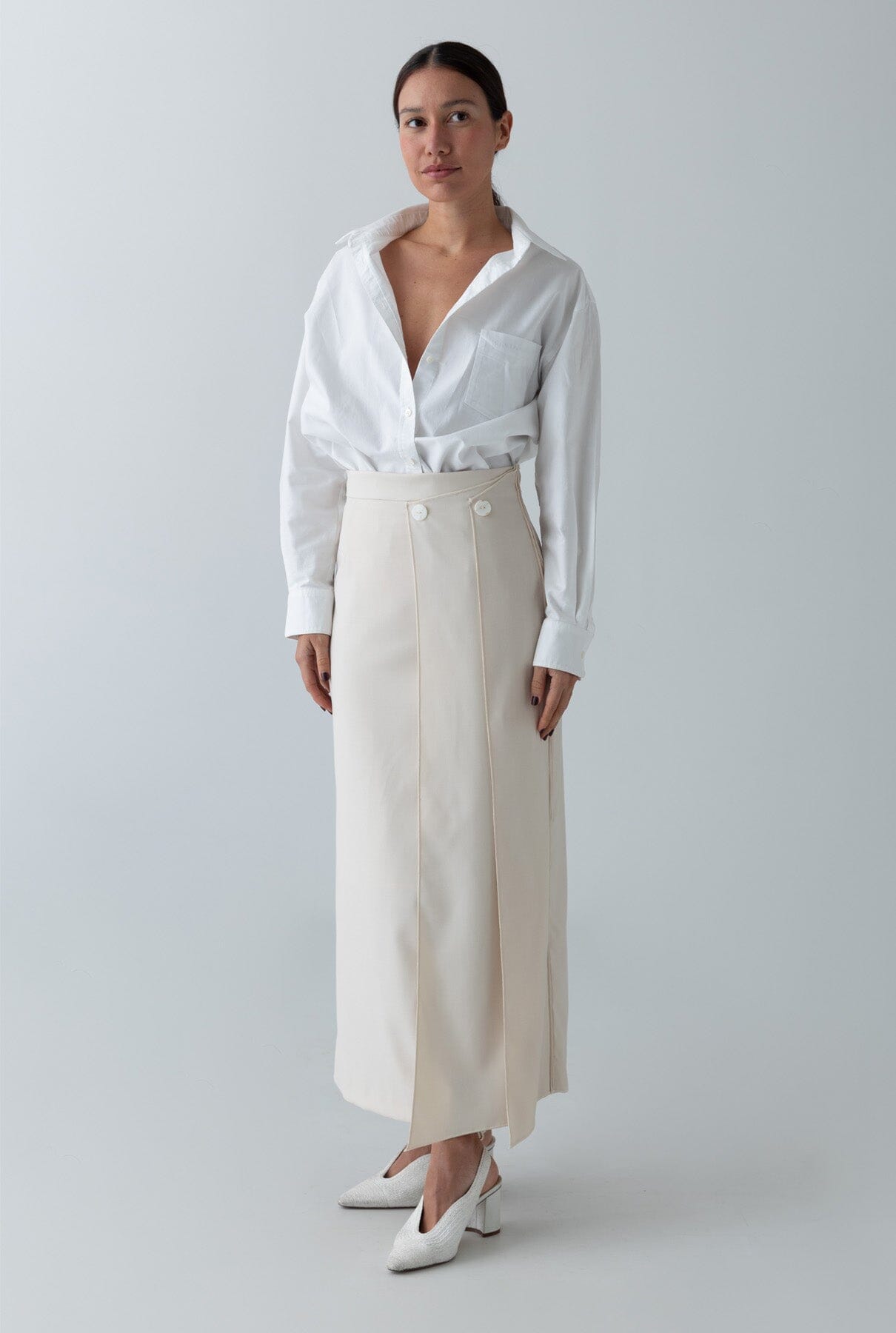 Falda midi en color crema. Esta falda es una pieza única con un diseño atemporal y elegante. Esta prenda destaca por sus paneles laterales y tiene cierre de cremallera lateral.