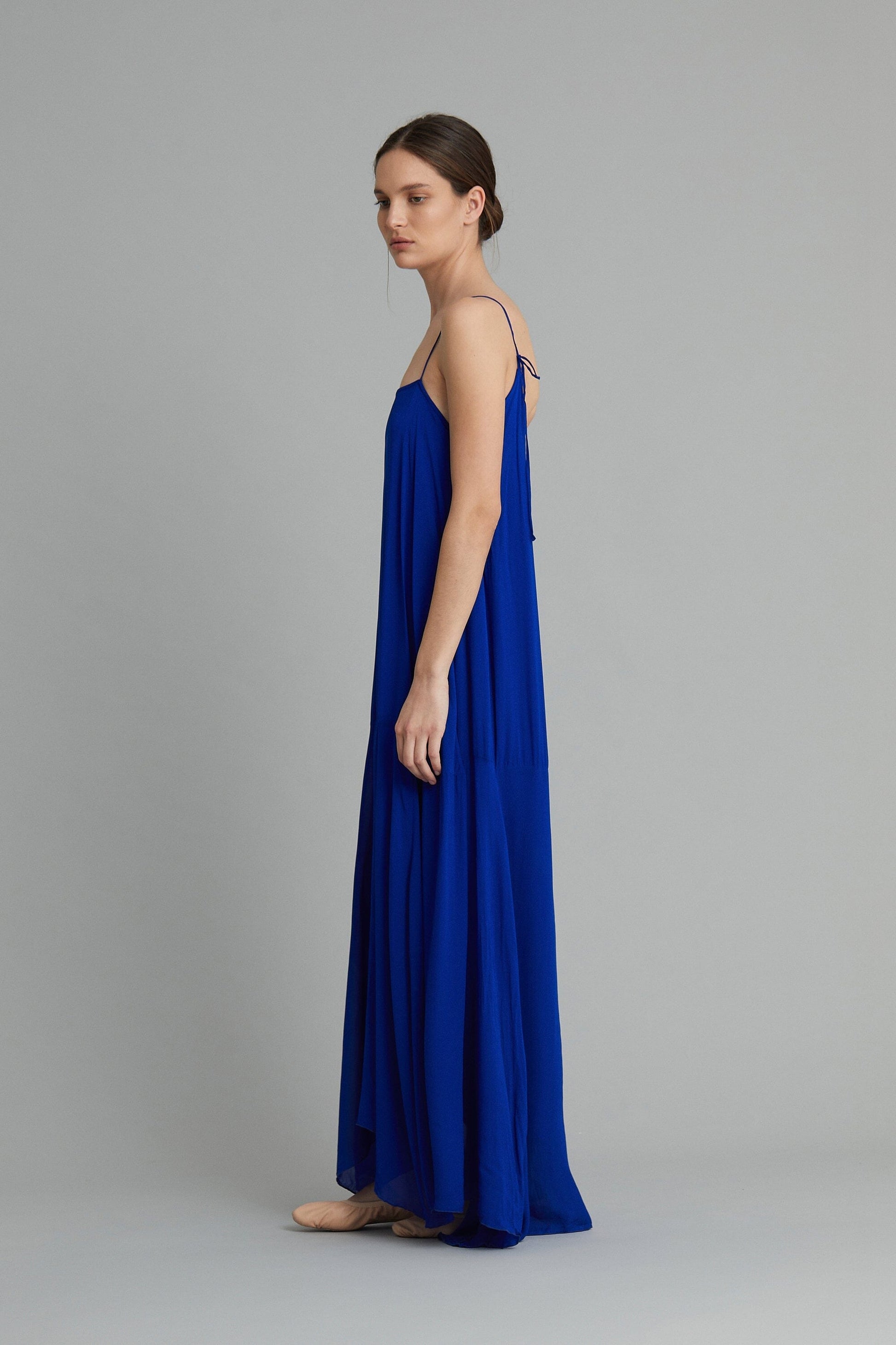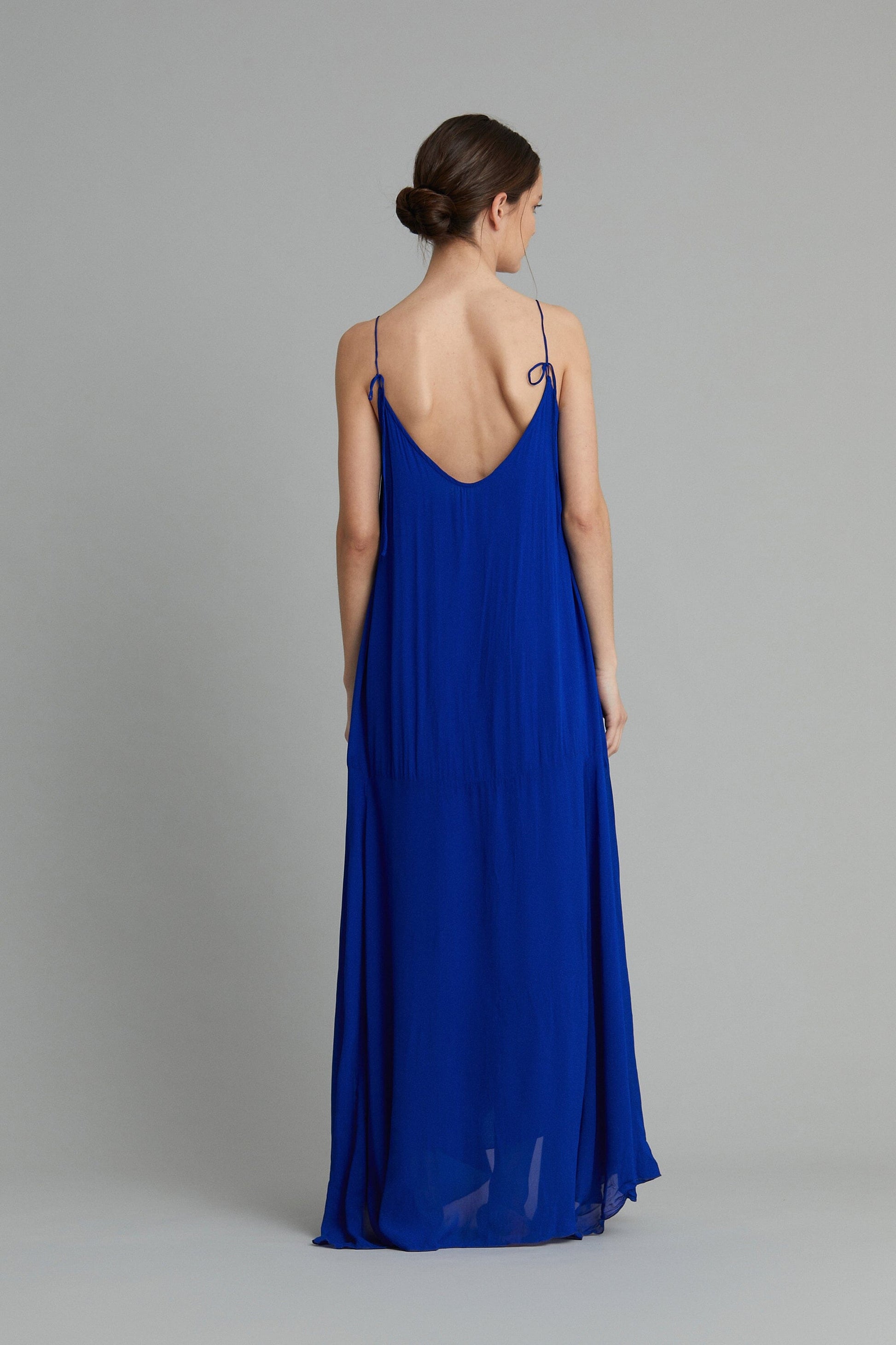 Vestido largo de seda. Escote recto con tirantes finos ajustables. Gran volante en el bajo de la falda.