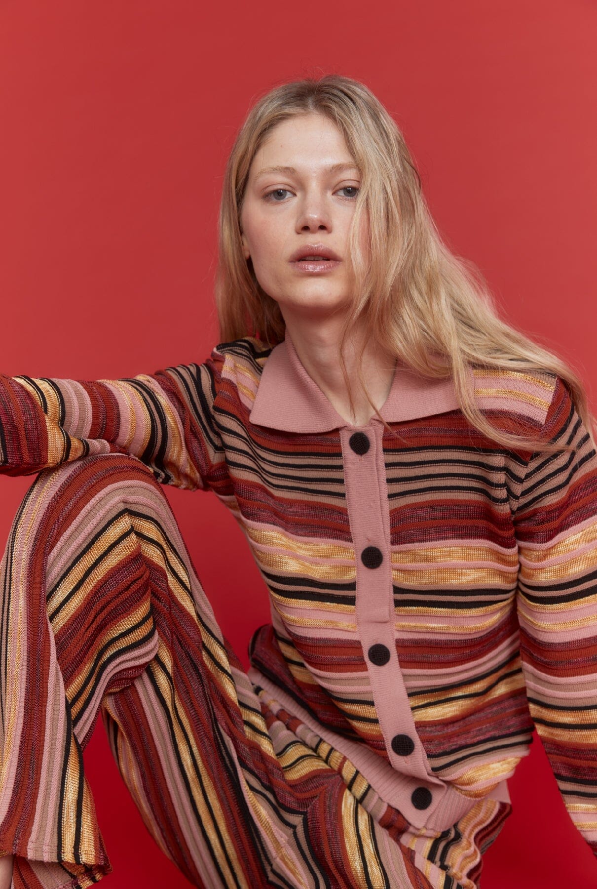 El cárdigan Cris es una versión colorida del tradicional jersey de rayas en tonos rosas. Fabricado en España con hilos italianos. El jersey es fresco y los hilos son transpirables para las noches de verano.